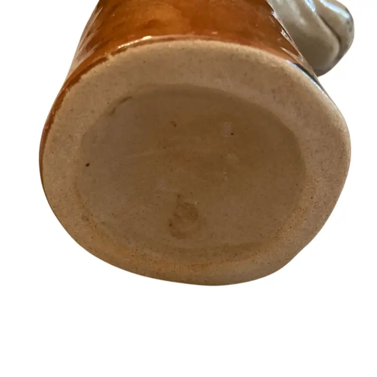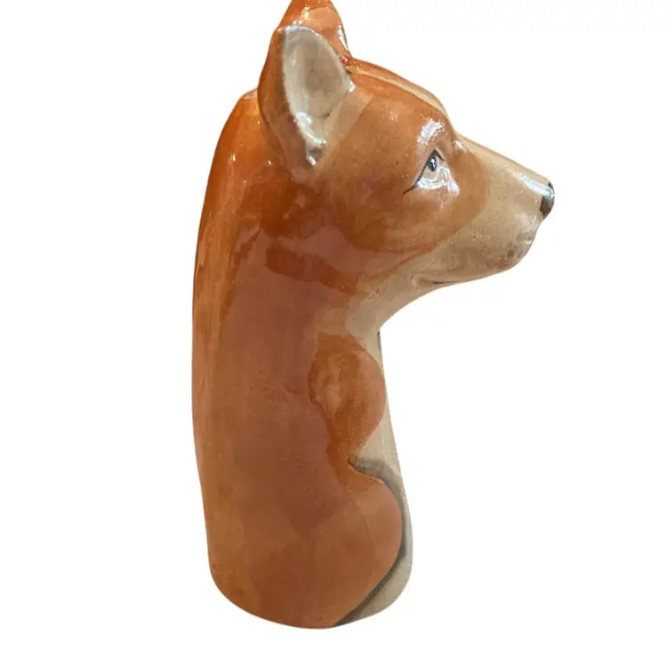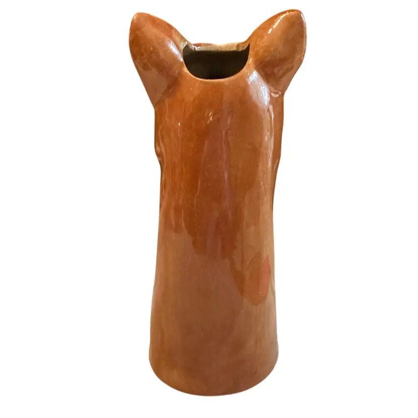 Ceramic 6.5” tall, 3” wide vase shaped like a brown dog.