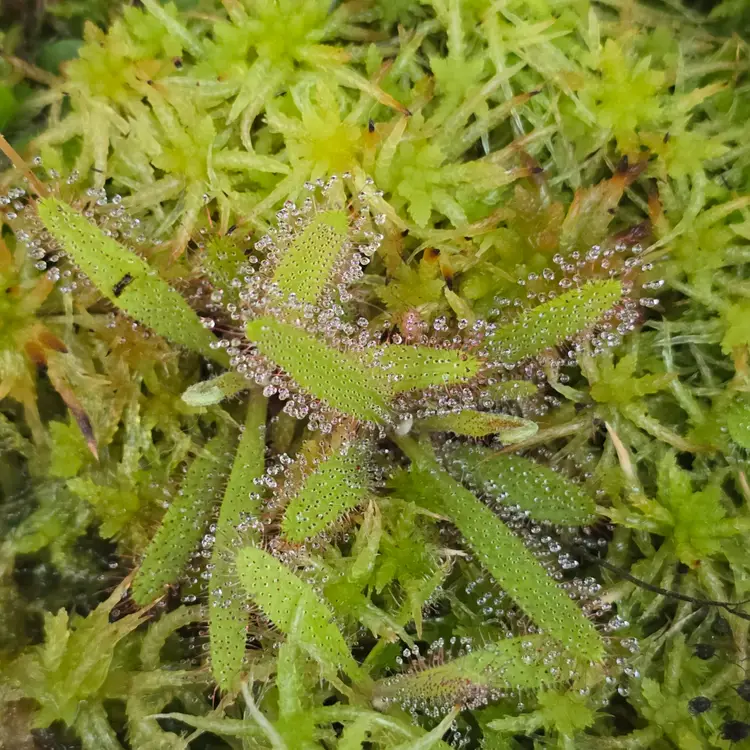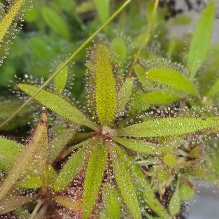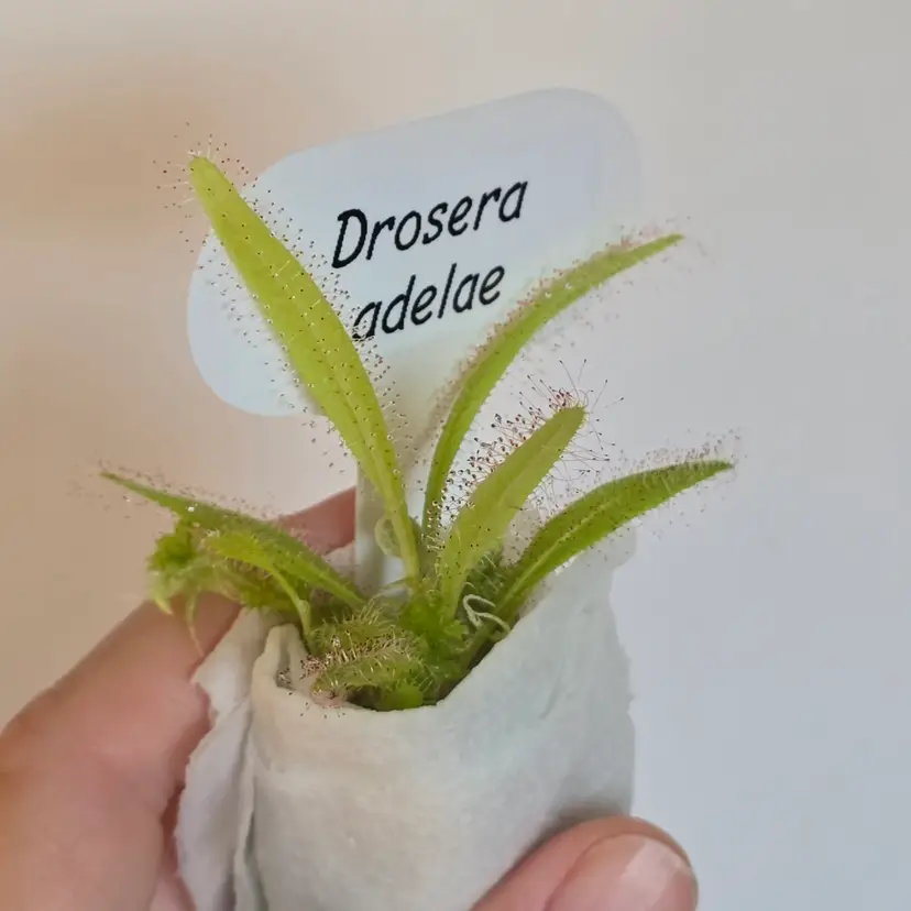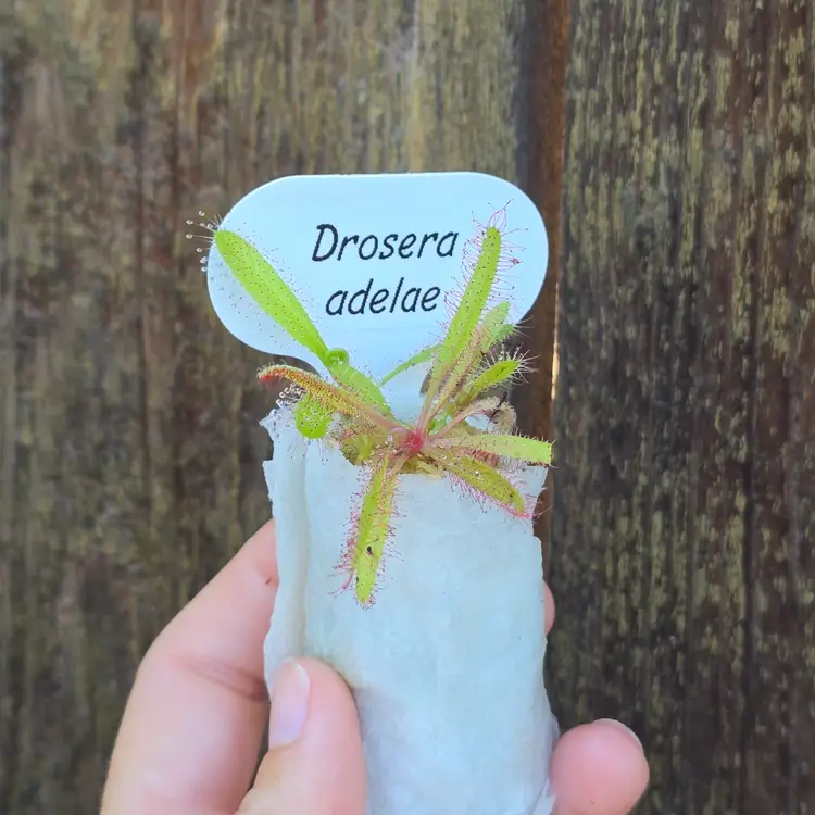 One small plant or clump of this unusual sundew wrapped in a bit of live sphagnum moss. This Drosera prefers more moisture and humidity, as well as lower light, than most other sundews.