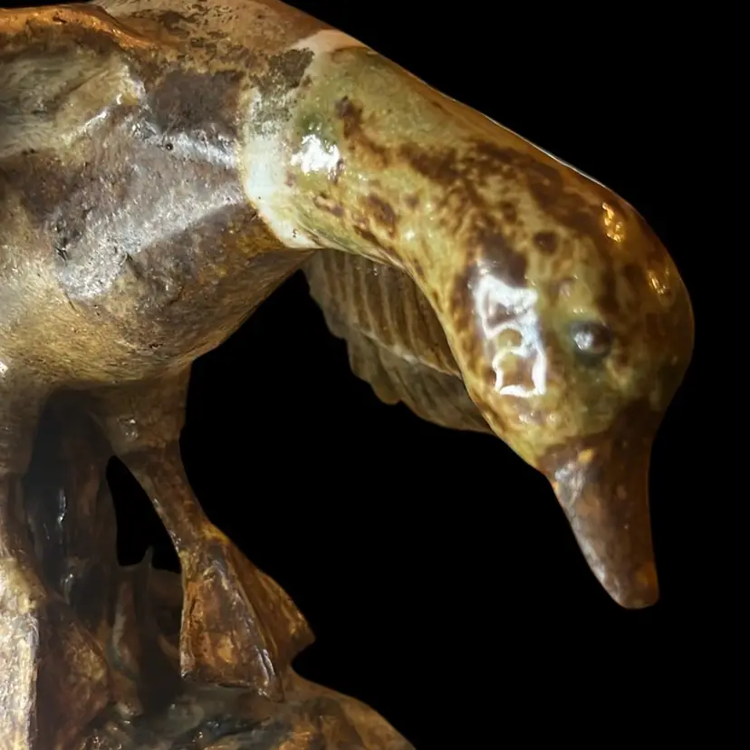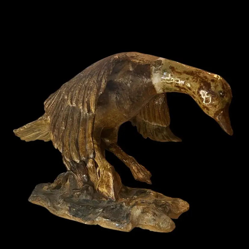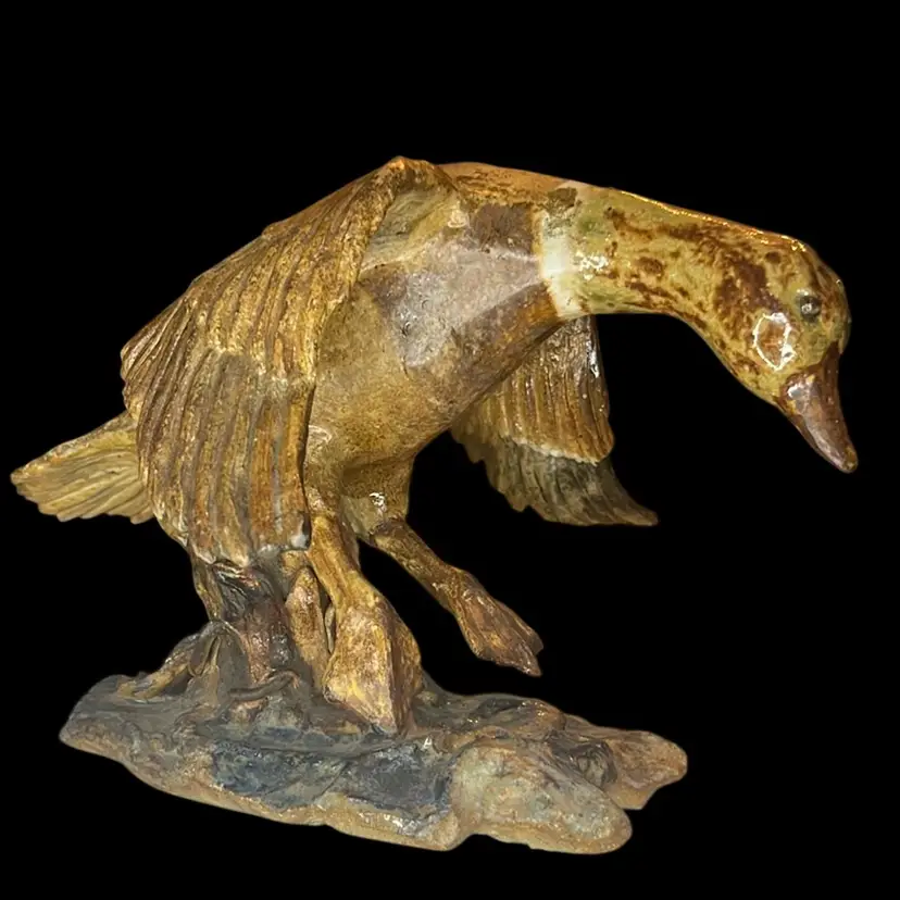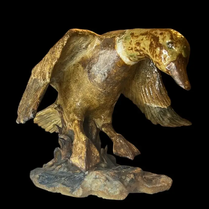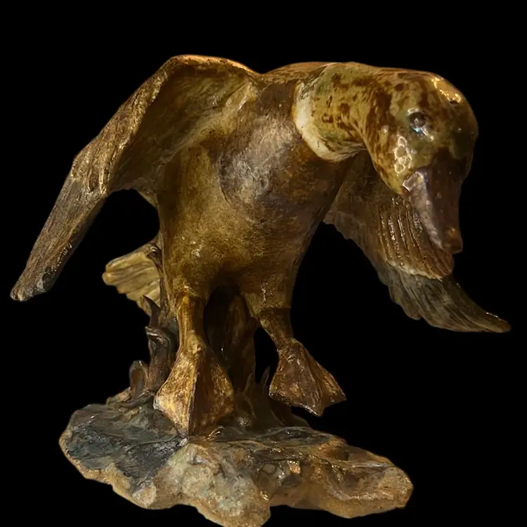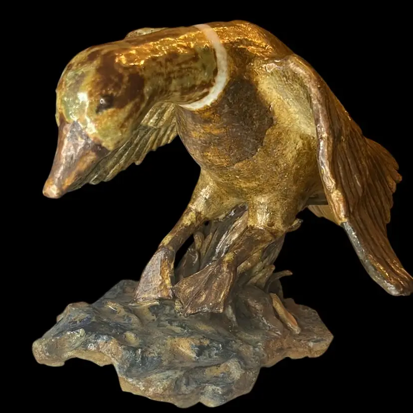 Really unique sculpture of duck taking flight/landing. Unsigned, super cool. Appears to have been previously mounted on top of a stand. Realistically styled, great attention to the details of the feathers. Maybe Veryl Goodnight?