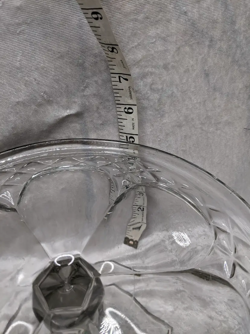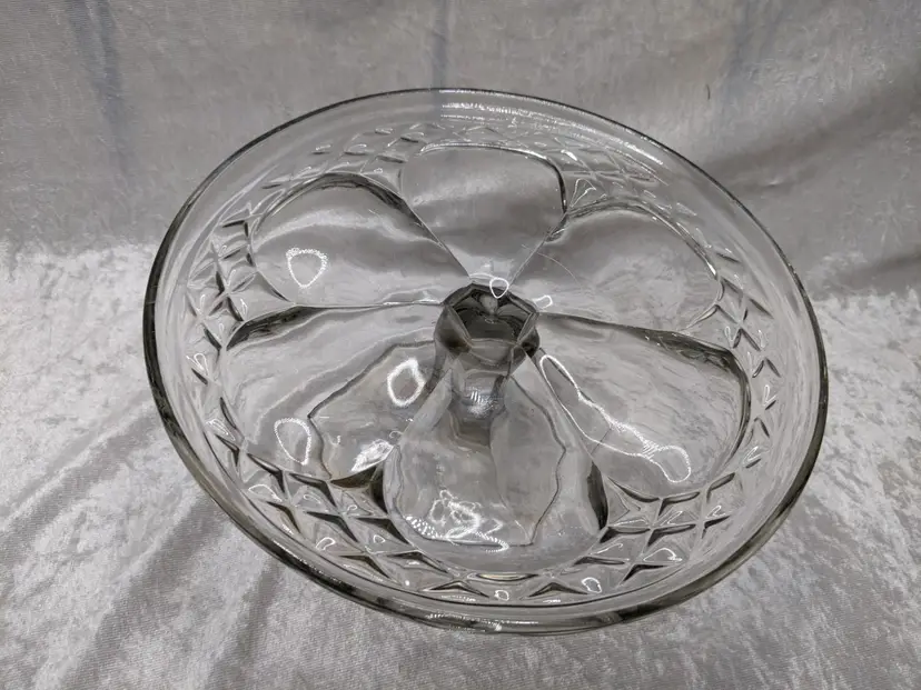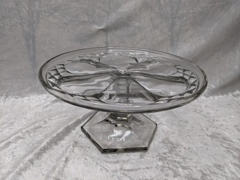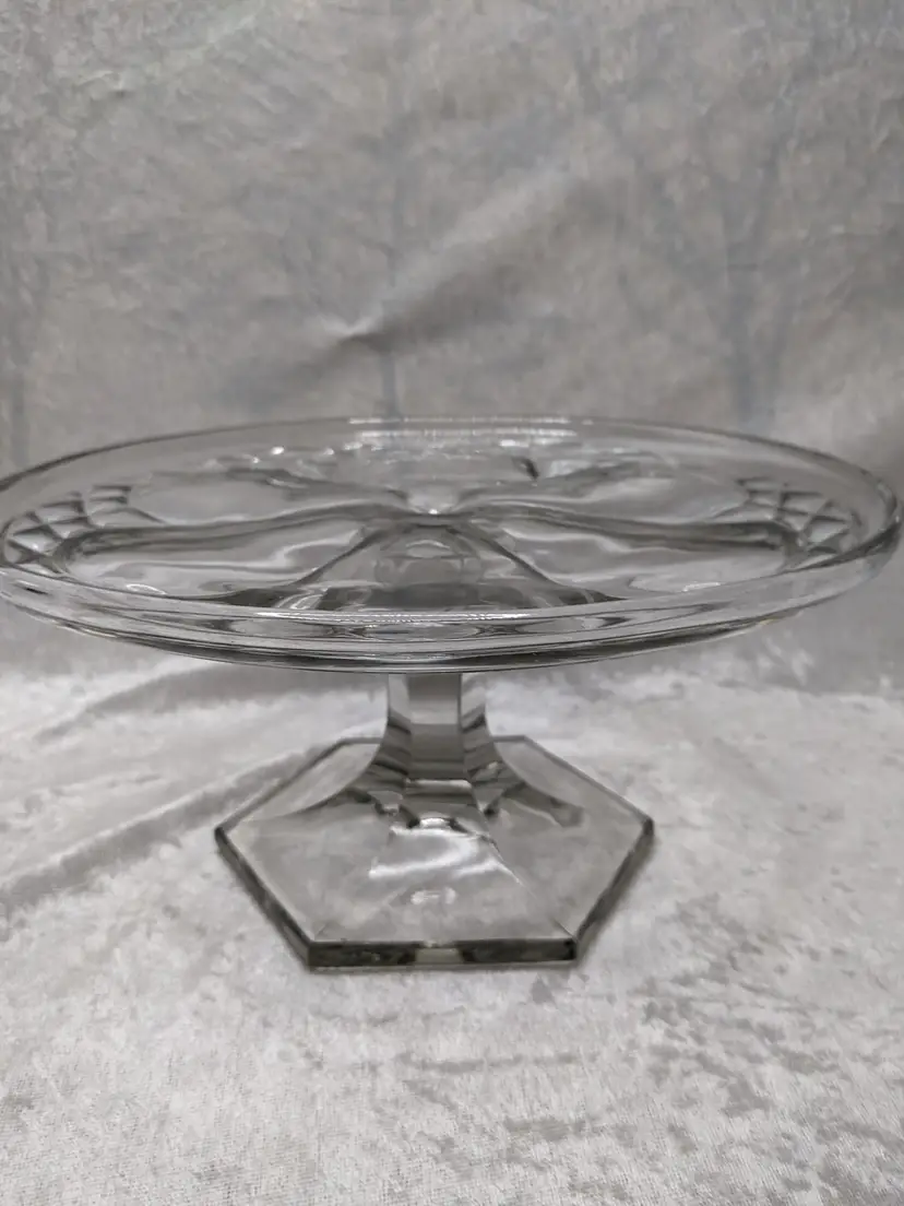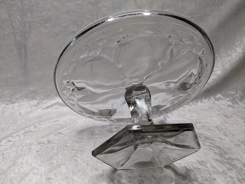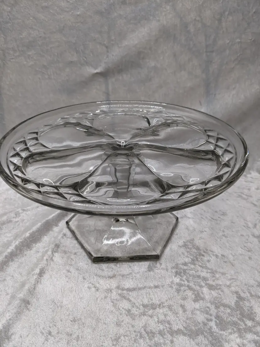 Early American Pressed Glass Pedestal Cake dish Plate Federal by Martinsville Glass Clear Heavy Flower Diamond pattern. . Would make a wonderful Holiday Gift or on your own holiday table. I do not no much about it I have researched it but can't find one like it.it measures 10 in wide with a high rim and 41/4in tall. Great condition Clean with no damage.no chips or cracks no weird smells. Please check the photos for details. Comes from a smoke free home. We do have pets.