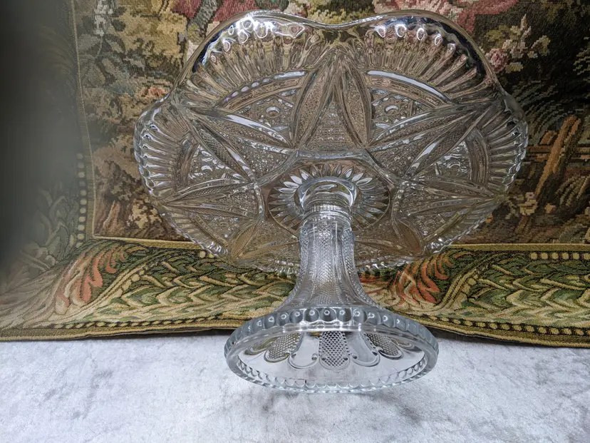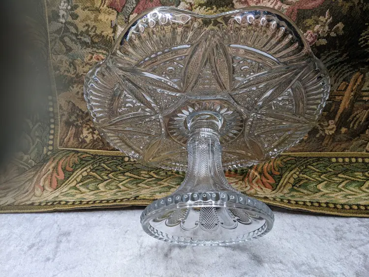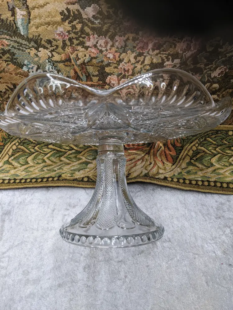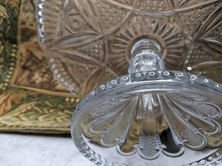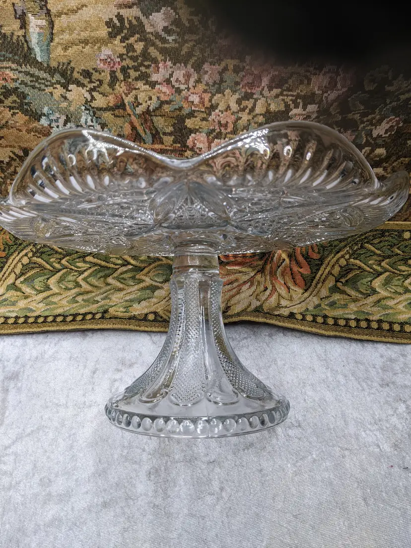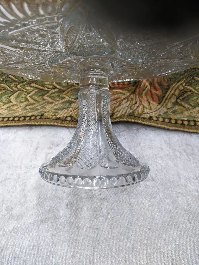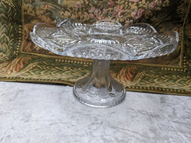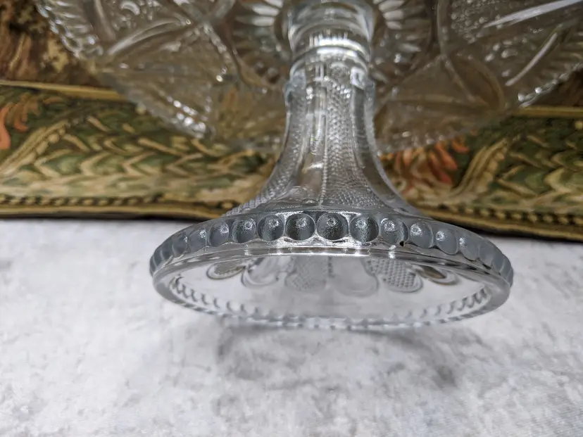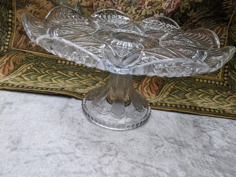 Early American Pressed Glass Pedestal Cake dish Plate EAPG Glass Clear Heavy Flower Diamond pattern. . Would make a wonderful Holiday Gift or on your own holiday table. I do not no much about it I have researched it but can't find one like it.it measures 10 in wide with a high rim and 41/4in tall. Great condition Clean with no damage.no chips or cracks no weird smells. Please check the photos for details. Comes from a smoke free home. We do have pets.