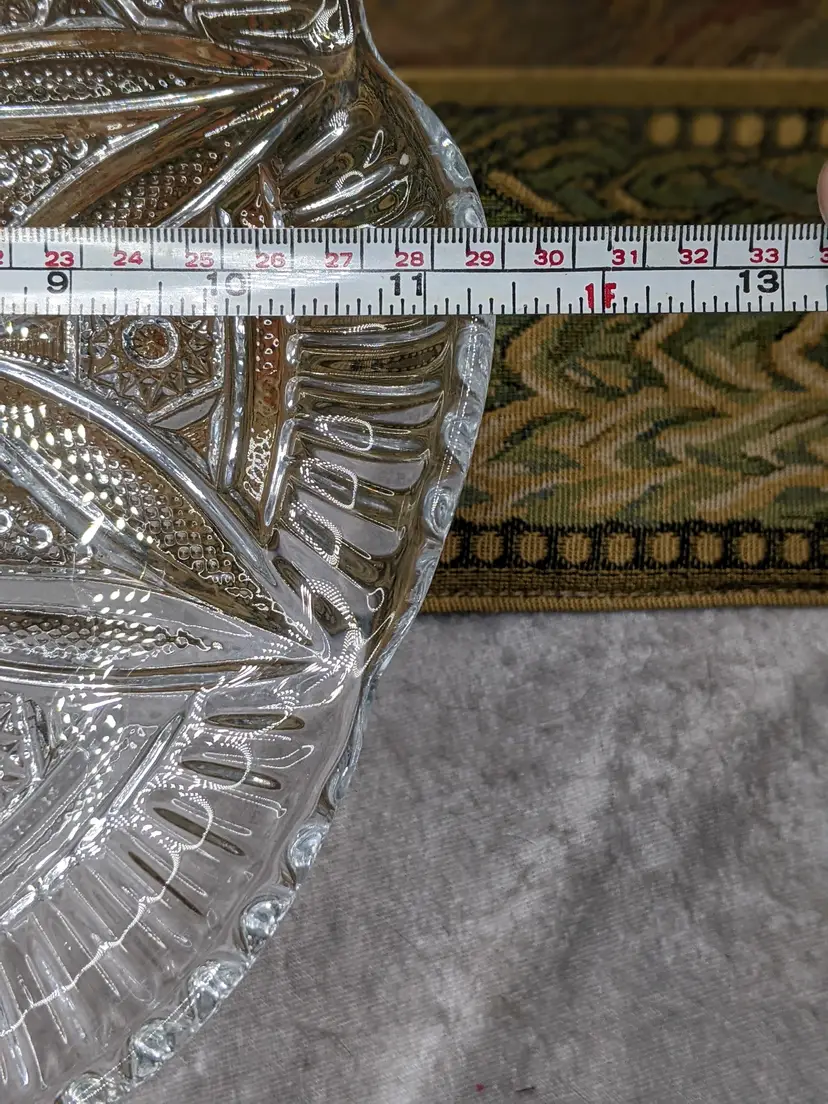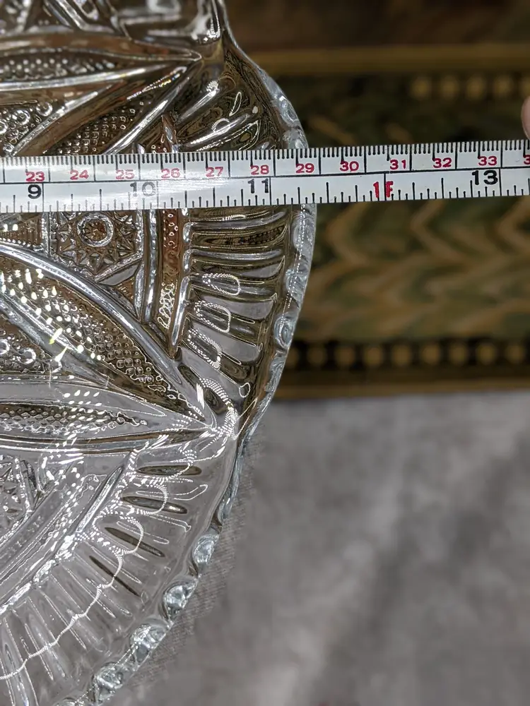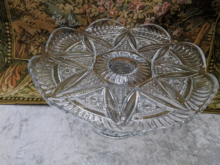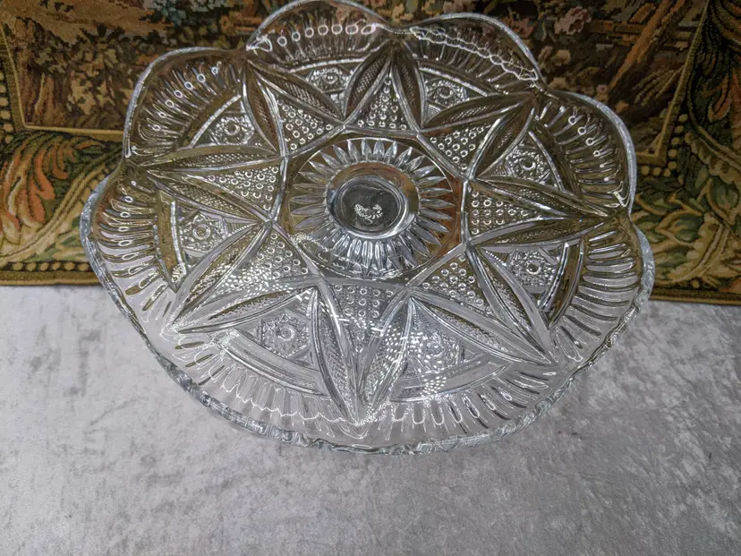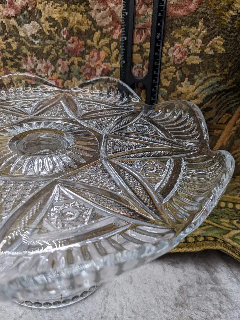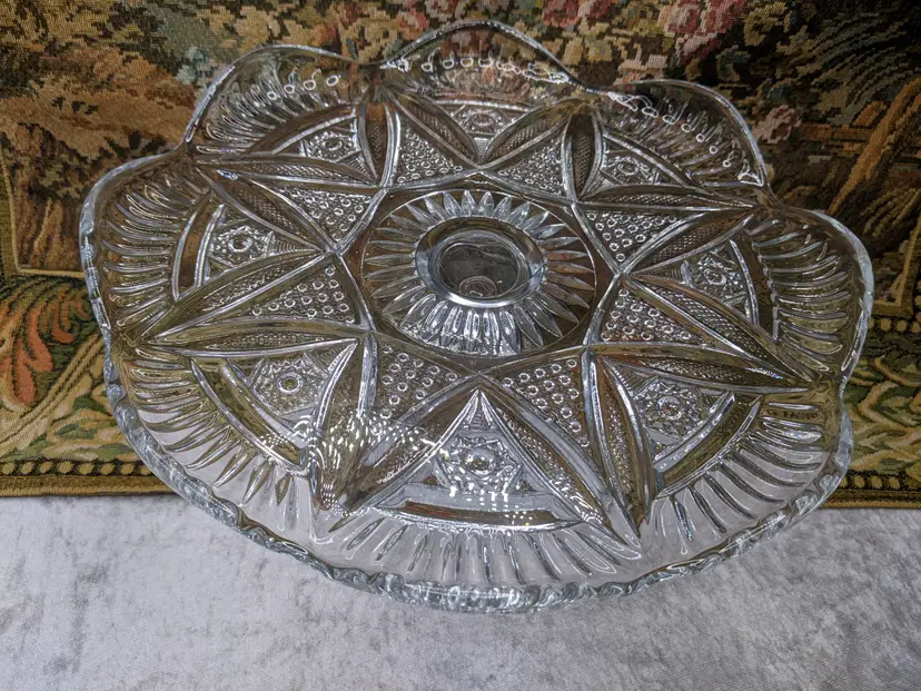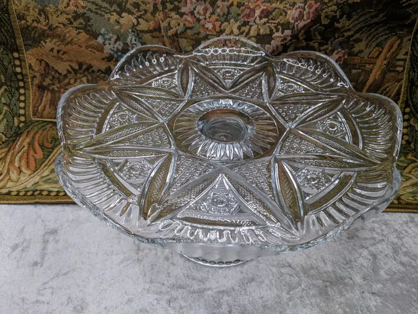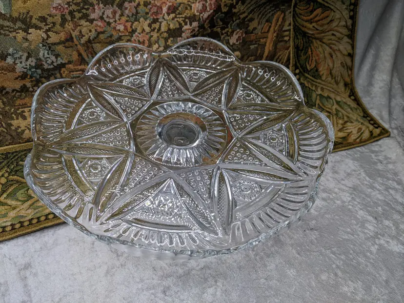Early American Pressed Glass Pedestal Cake dish Plate EAPG Glass Clear Heavy Flower Diamond pattern. . Would make a wonderful Holiday Gift or on your own holiday table. I do not no much about it I have researched it but can't find one like it.it measures 10 in wide with a high rim and 41/4in tall. Great condition Clean with no damage.no chips or cracks no weird smells. Please check the photos for details. Comes from a smoke free home. We do have pets.