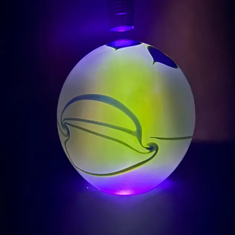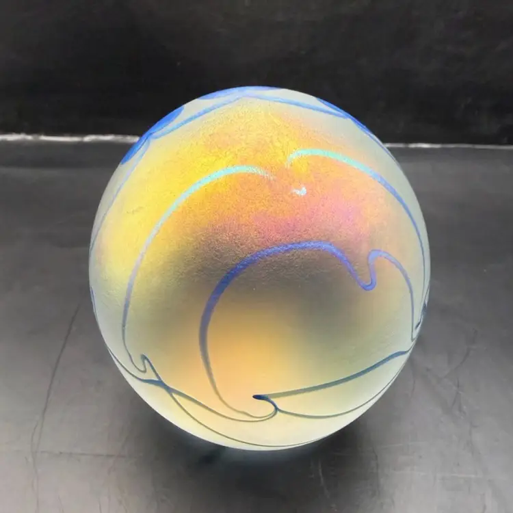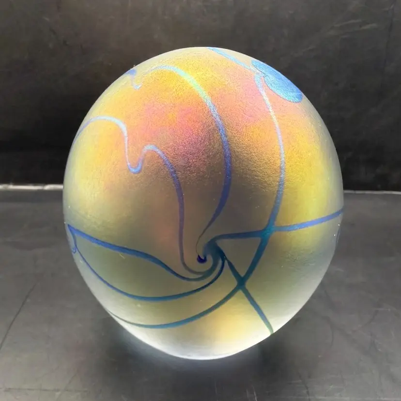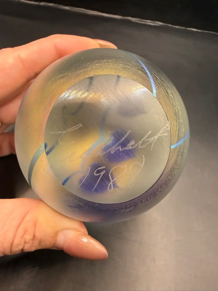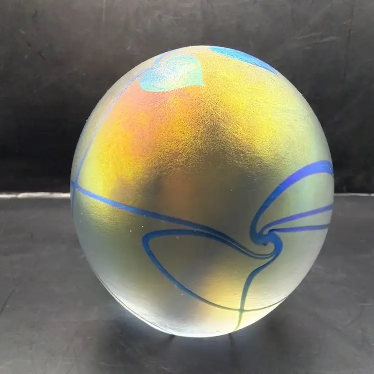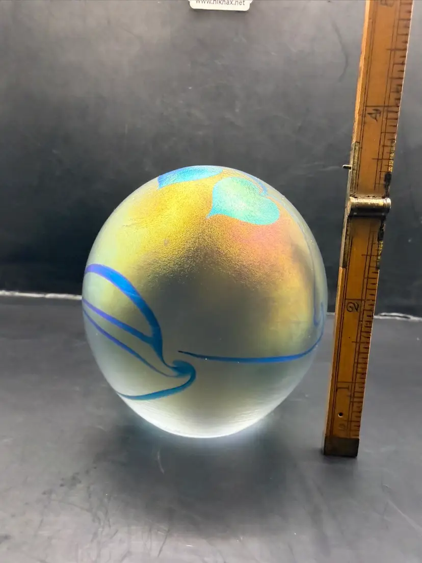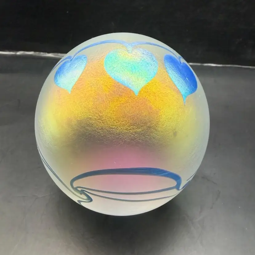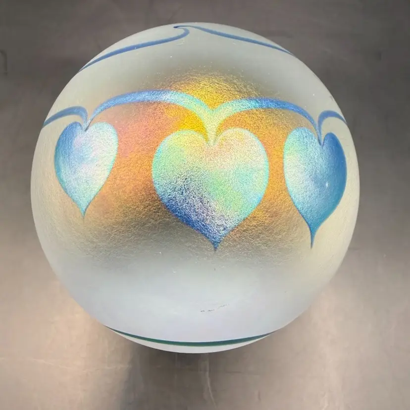 Eikholt Signed Blue Hanging Hearts Iridescent Art Glass Paperweight UV Glow 3.5”