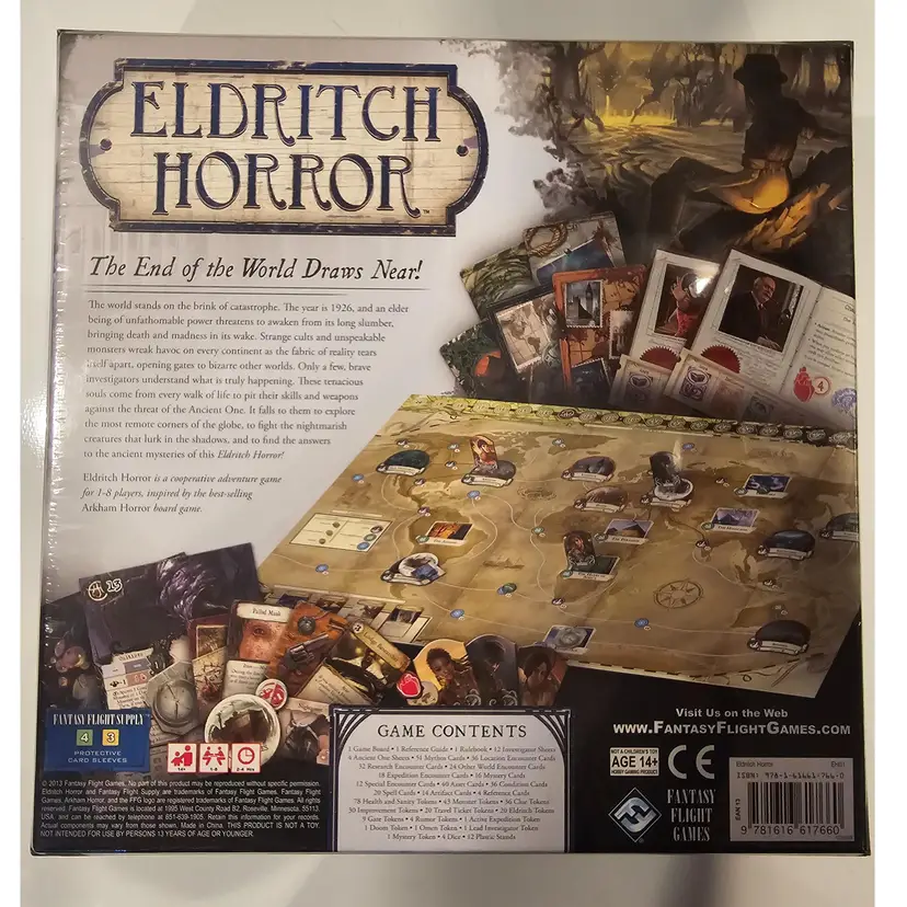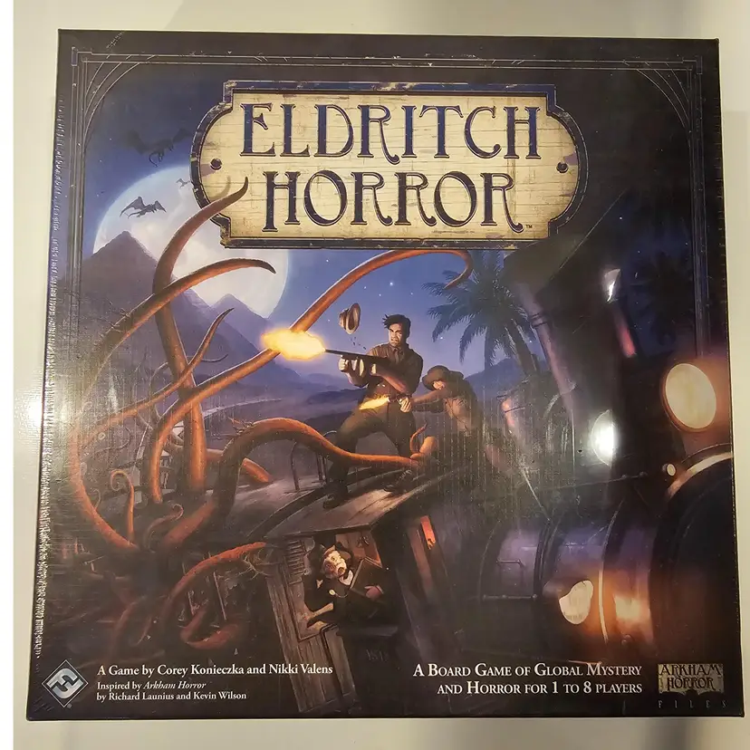 Dive into the eerie world of 'Eldritch Horror' by Fantasy Flight Games. This cooperative board game challenges 1 to 8 players to solve global mysteries and battle ancient horrors. Perfect for fans of Lovecraftian themes and intense strategy.