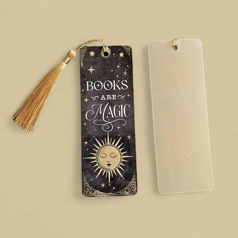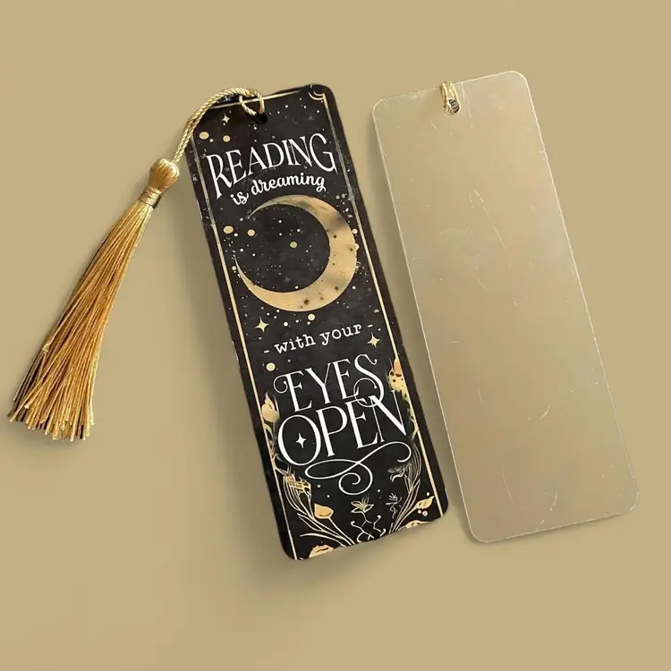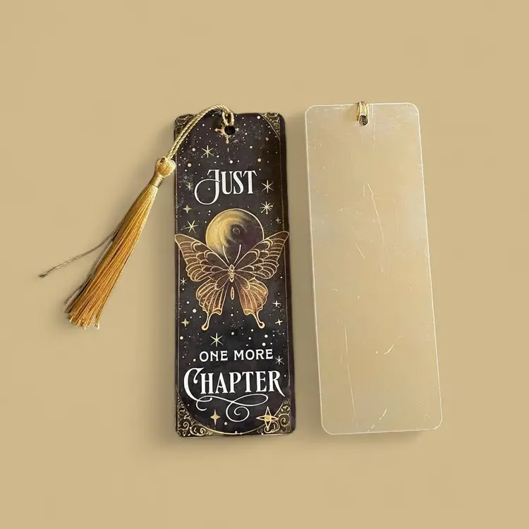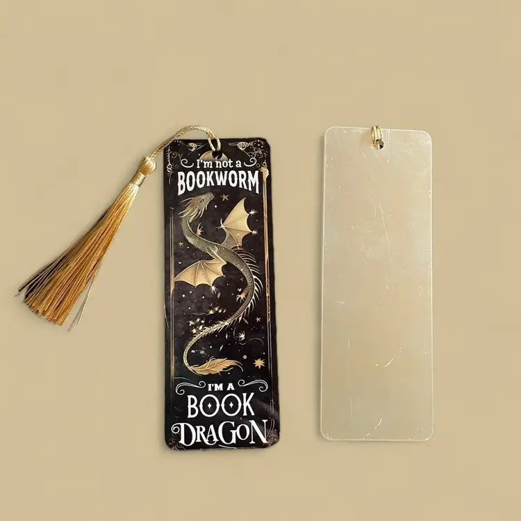 These bookmarks feature elegant gold & black graphics. These metal bookmarks are 2” wide and 5.5” long.