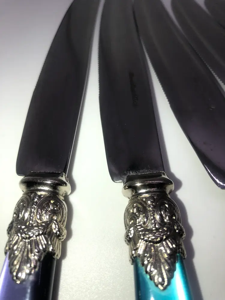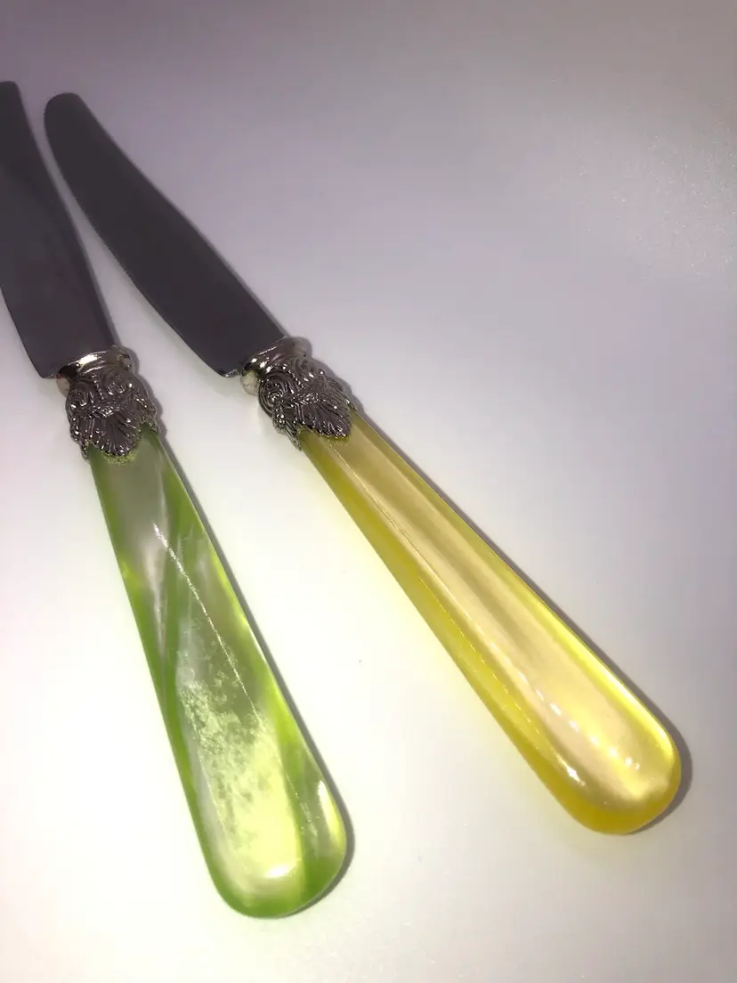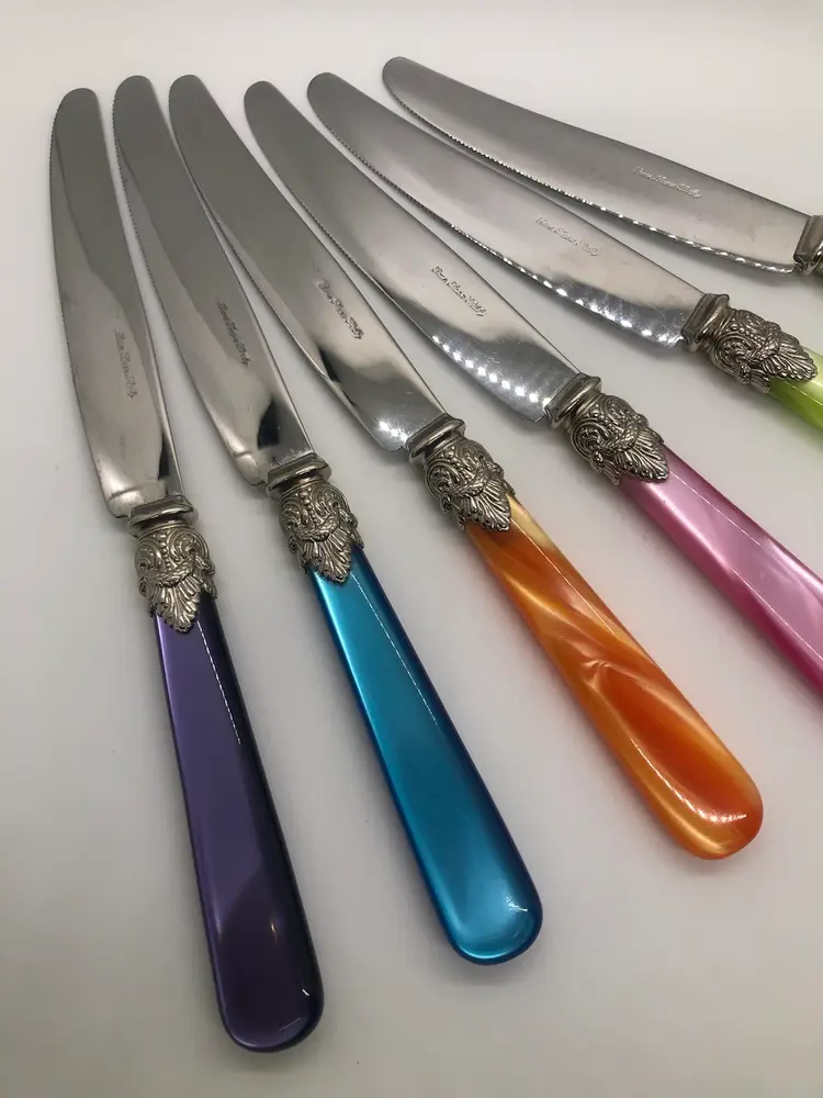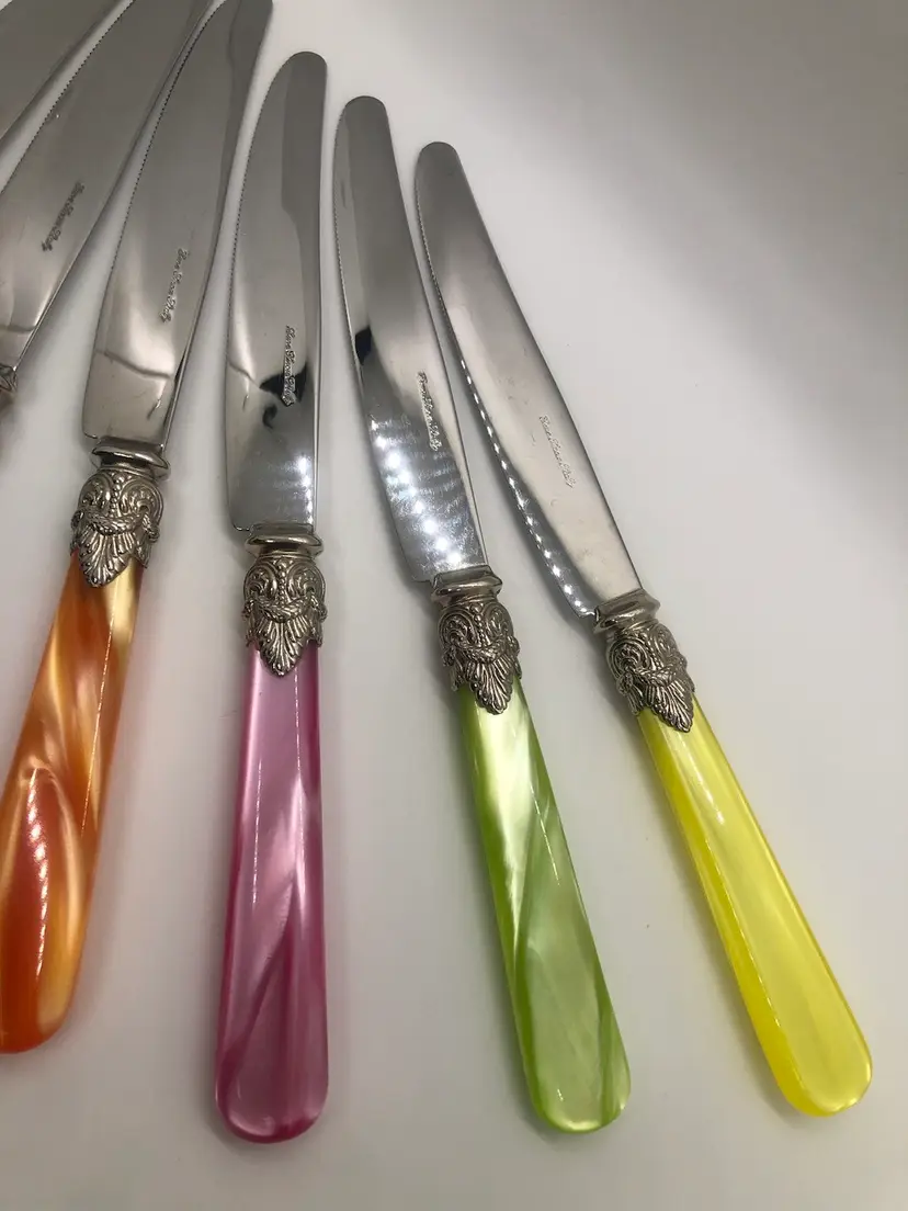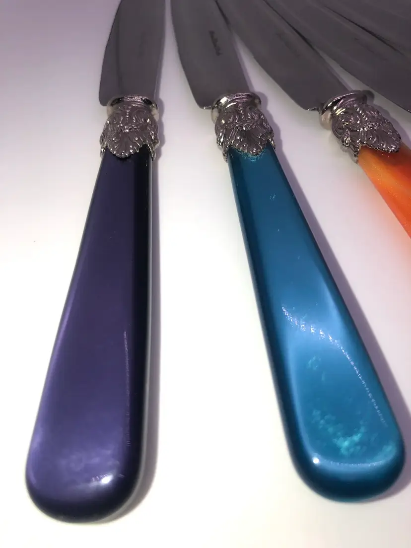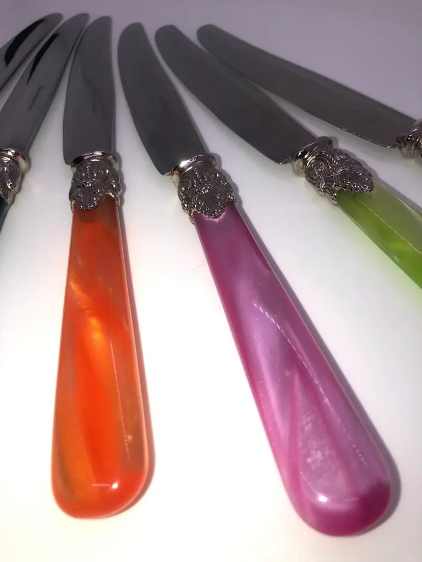 The Eme Inox flatware butter knives are a vintage set made in Italy from stainless steel with Lucite handles. The knives feature a marbled handle pattern and are engraved, adding a touch of elegance to any dining table. The Italian craftsmanship and unique design make these knives a must-have collectible for anyone looking to add a touch of vintage charm to their kitchen.