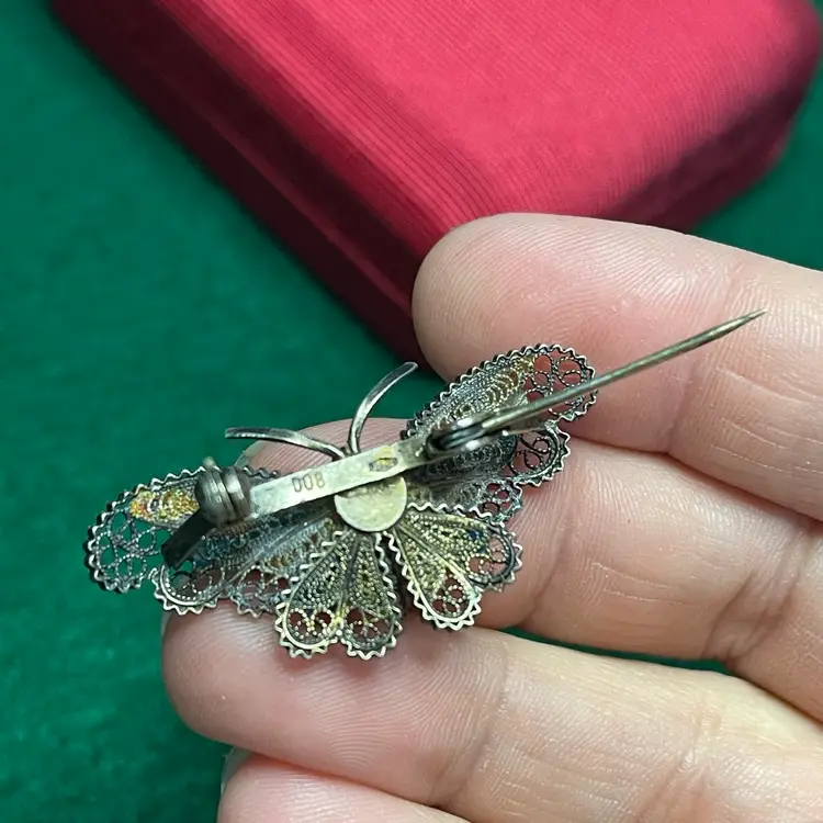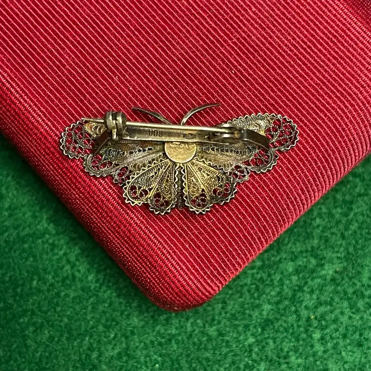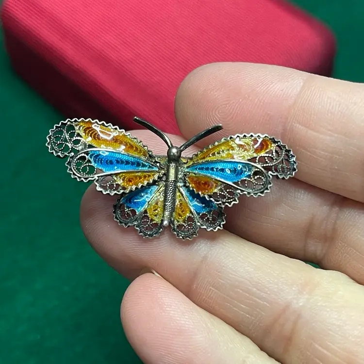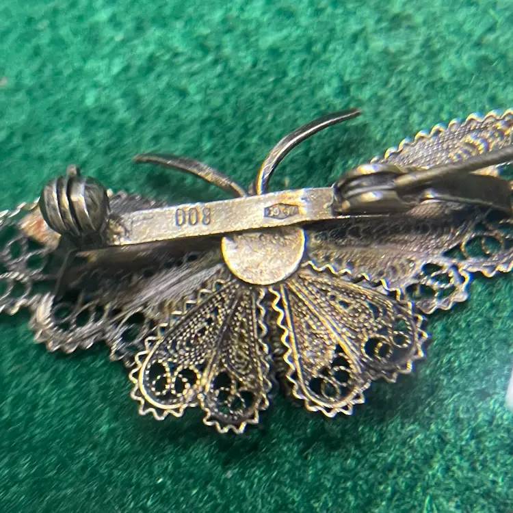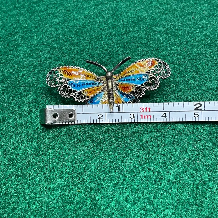 In good condition with only minor imperfections to the enamel right next to the body of the butterfly and on the upper right tip of the wing on an amber color section. Tested and marked 800 silver. About 1-5/8 inches across.