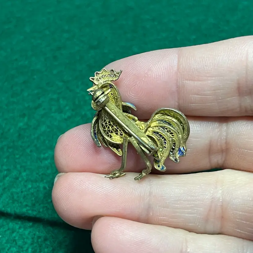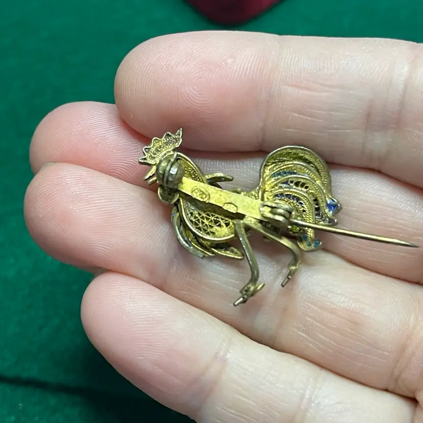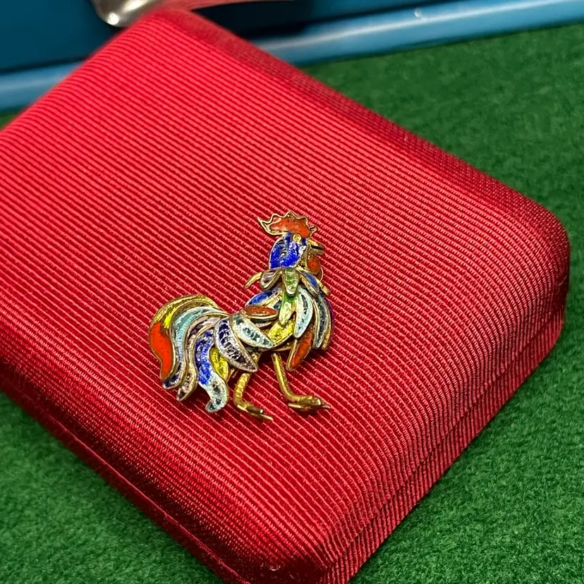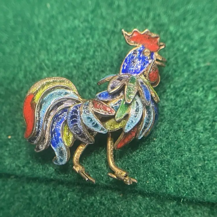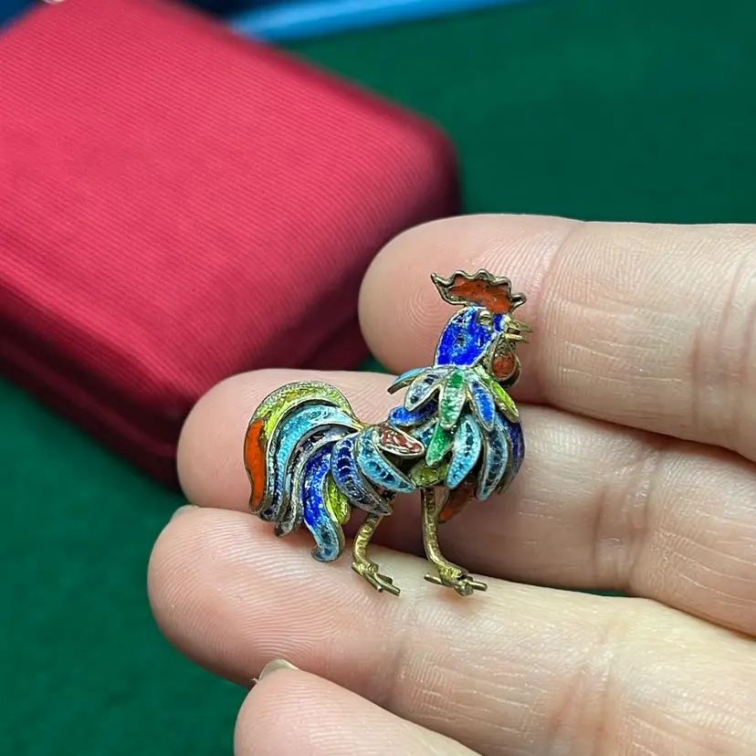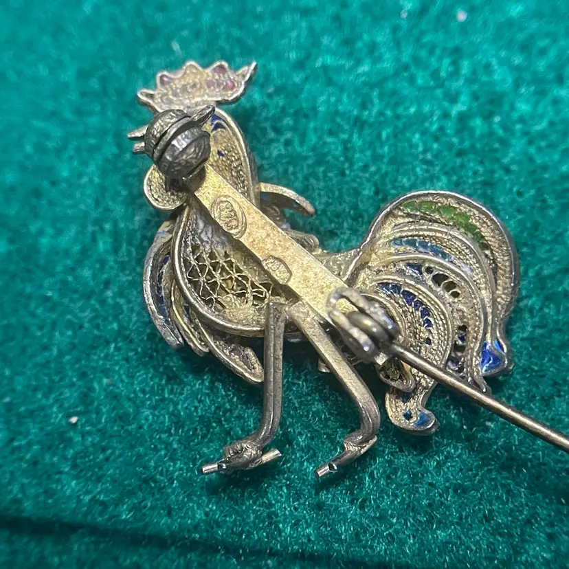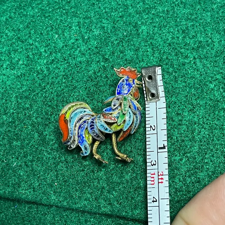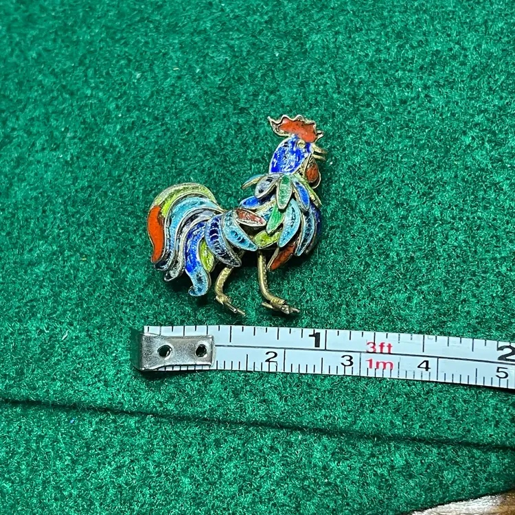 In good condition with only minor imperfections to the enamel. Tested and marked 800 silver. About 1 inch wide and 1-1/8 inch tall.