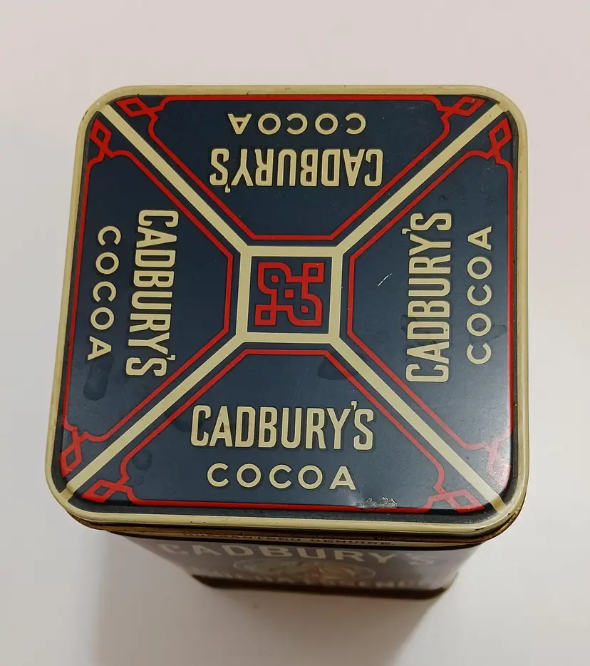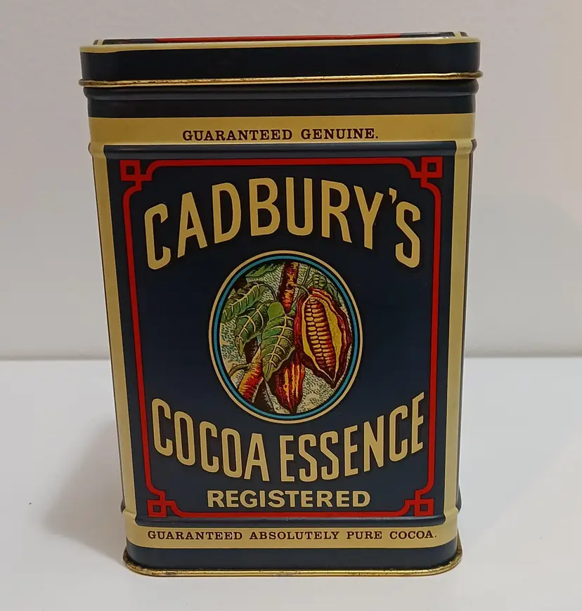 English Vintage Cadbury 's Cocoa Essence Advertising Tin; Rich colors and nicely detailed illustrations enhance this vintage tin marked Cadbury 1977; 6" L x 4" W; excellent used condition; shows very little wear!