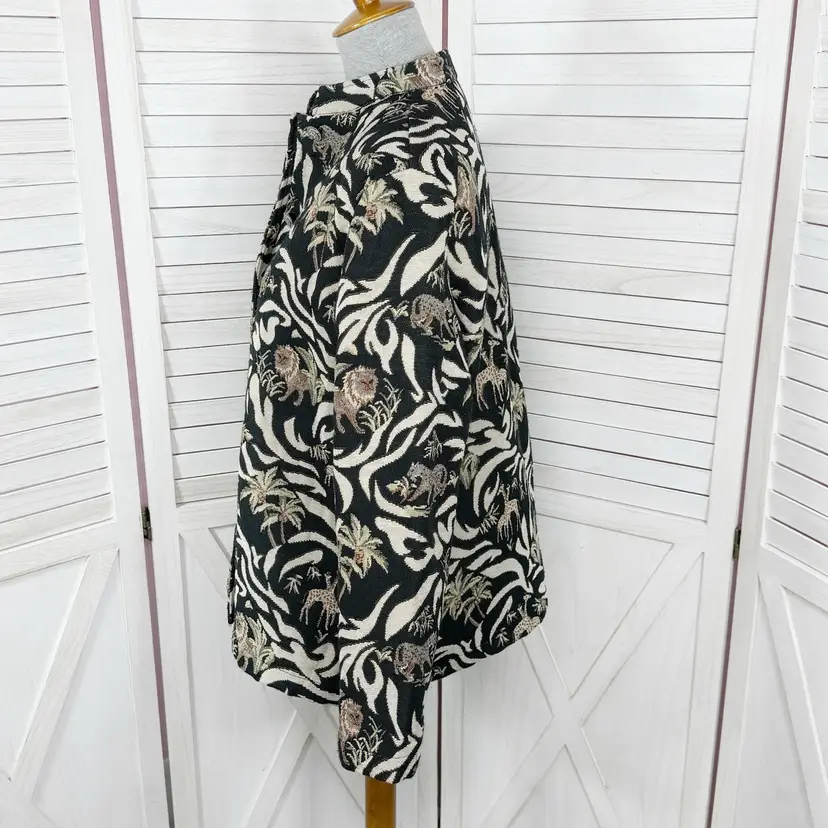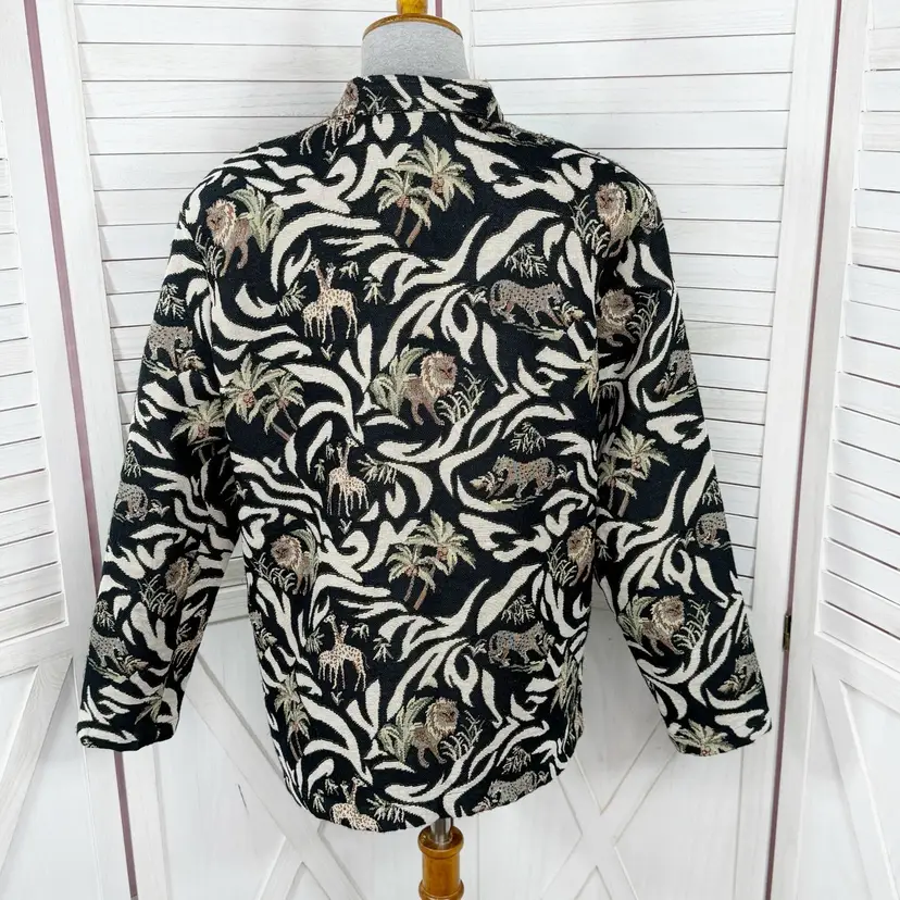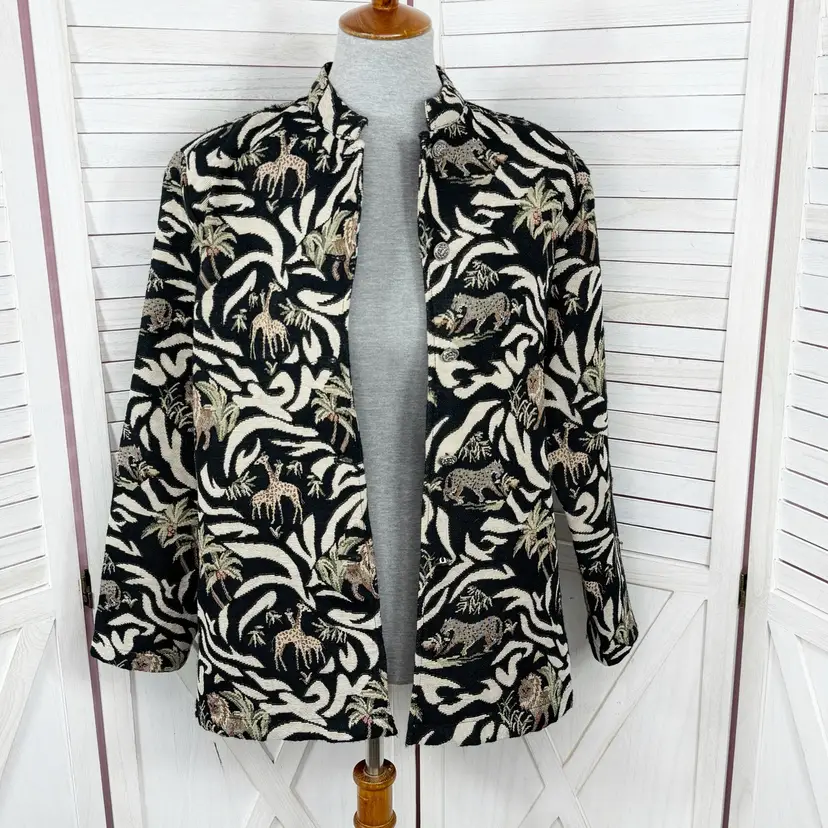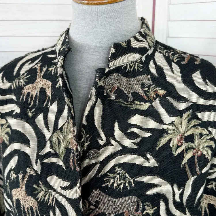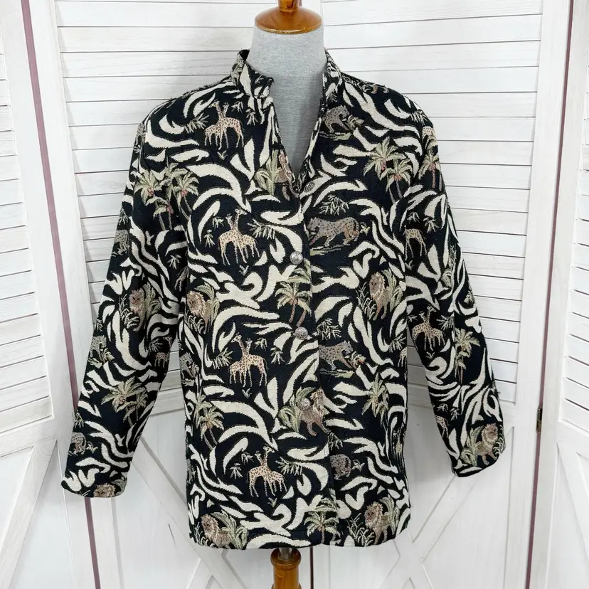 Jacquard tapestry fabric Jungle animal print - zebra stripe, lions, giraffes, cheetahs Button front Mandarin collar Long sleeve Unlined