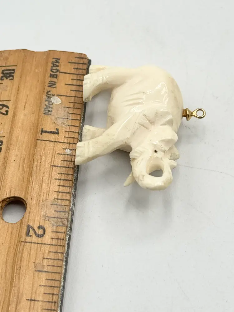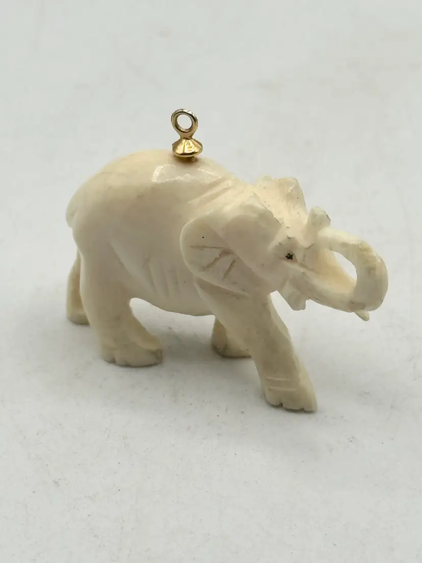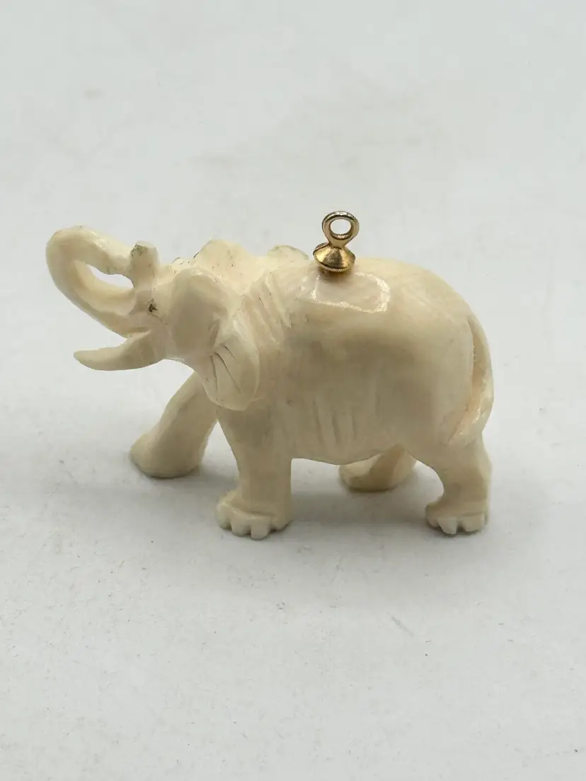 Estate carved figural elephant charm pendant. Carved material, super well made estate elephant. Figural carved elephant charm. MN54GH.