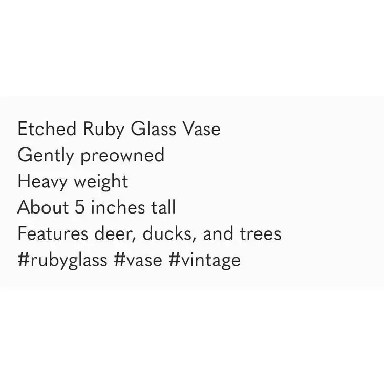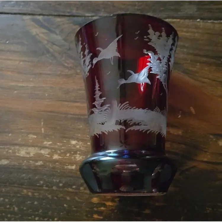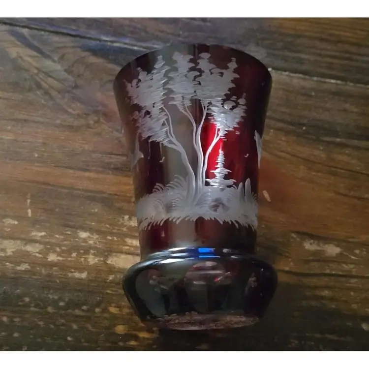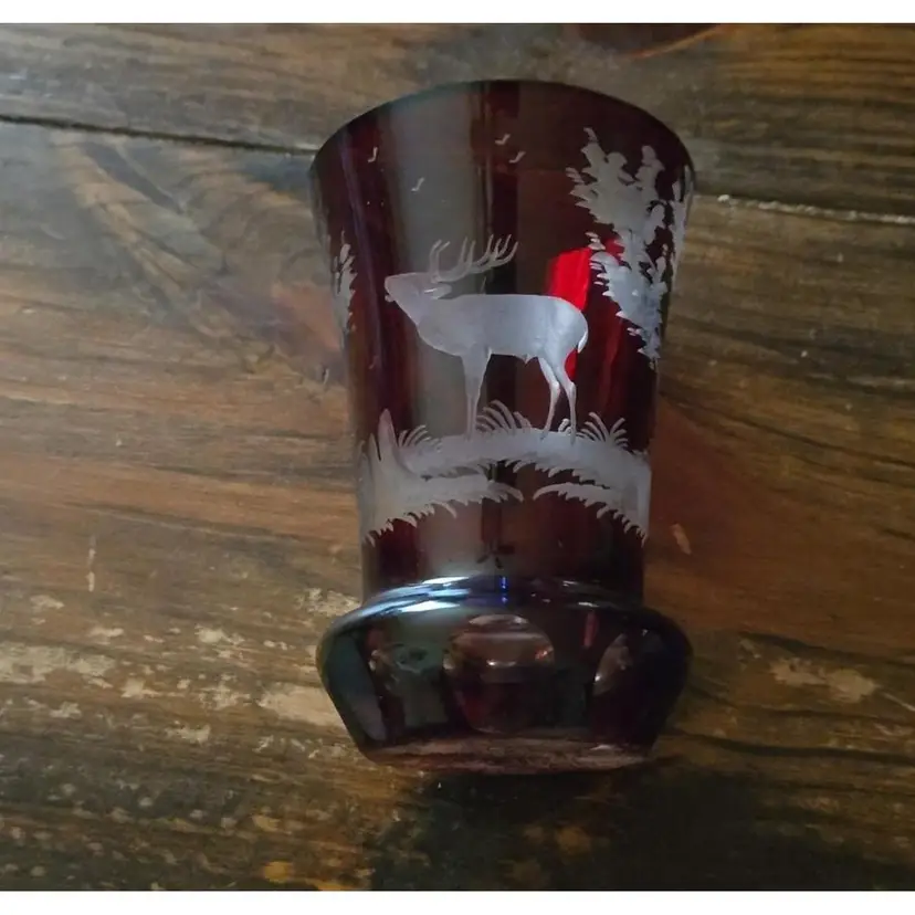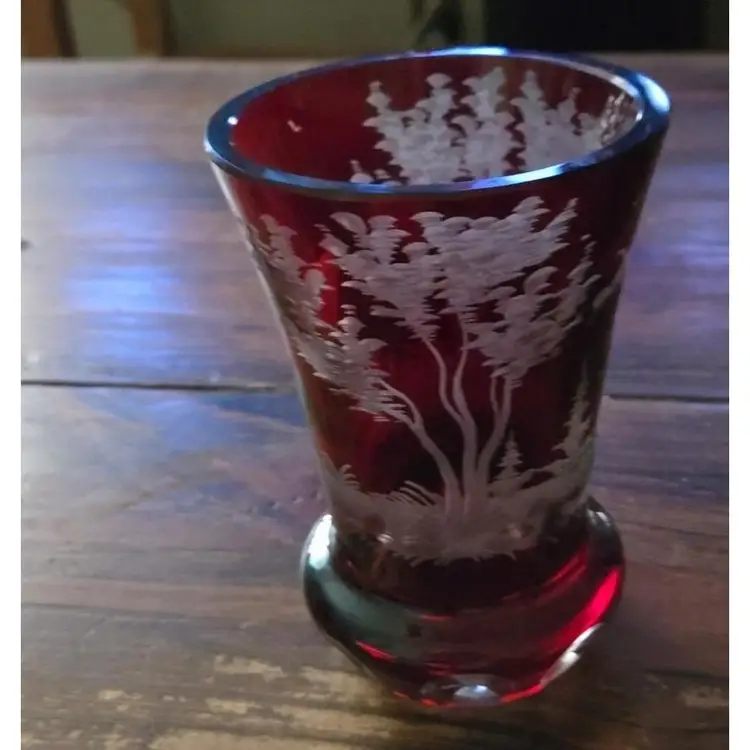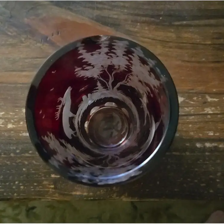 Etched Ruby Glass Woodlands Scene Gently preowned Heavy 5 inches tall #rubyglass #vintage #vase