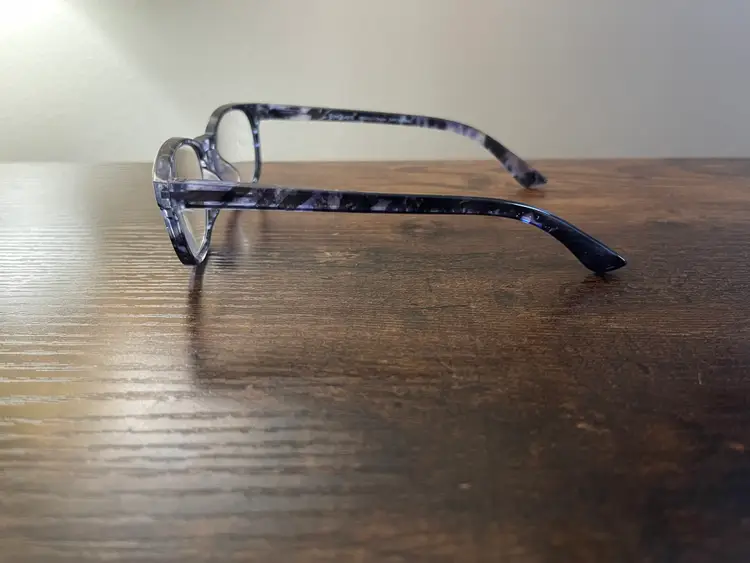Item Description: These EyeGuard eyeglass frames feature a stylish black and black marble galaxy glittery design with a sleek oval-rectangle shape that flatters most face types. The lightweight plastic frame construction offers all-day comfort, and the spring hinge temples provide added flexibility and durability. Perfect for someone seeking a modern, neutral look that blends fashion and functionality.