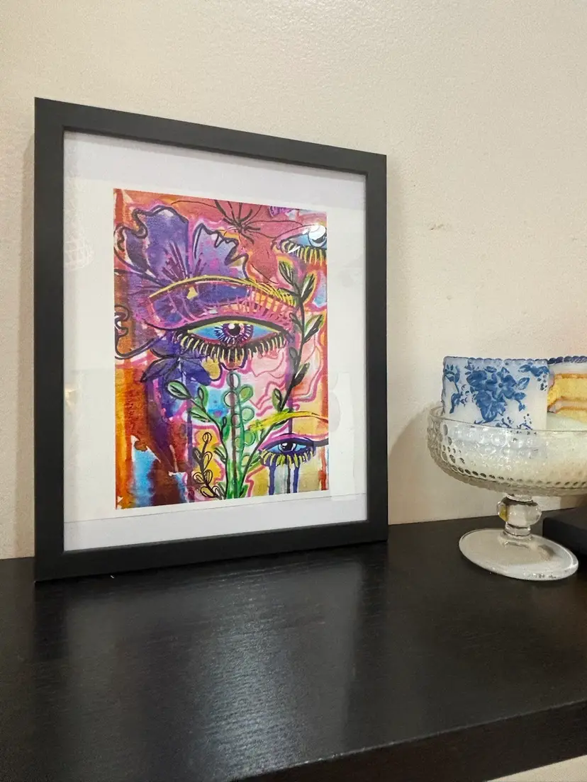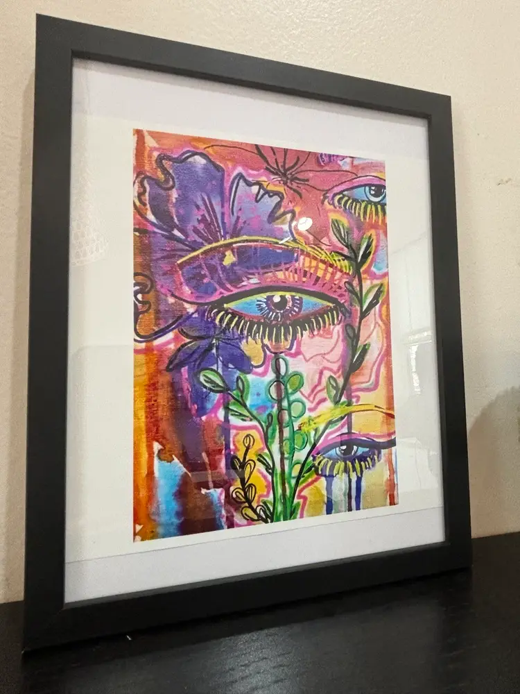 A vibrant blend of acrylic and watercolor, Eyes of Protection Flowers is a mixed media piece that radiates both beauty and spiritual symbolism. Bold blooms are layered with watchful eyes—symbols of protection and intuition—creating a dreamy yet powerful composition. Each brushstroke speaks to the unseen forces that guard and guide us.