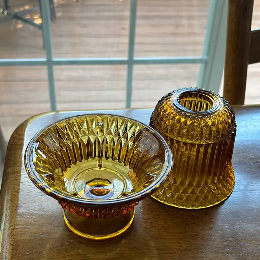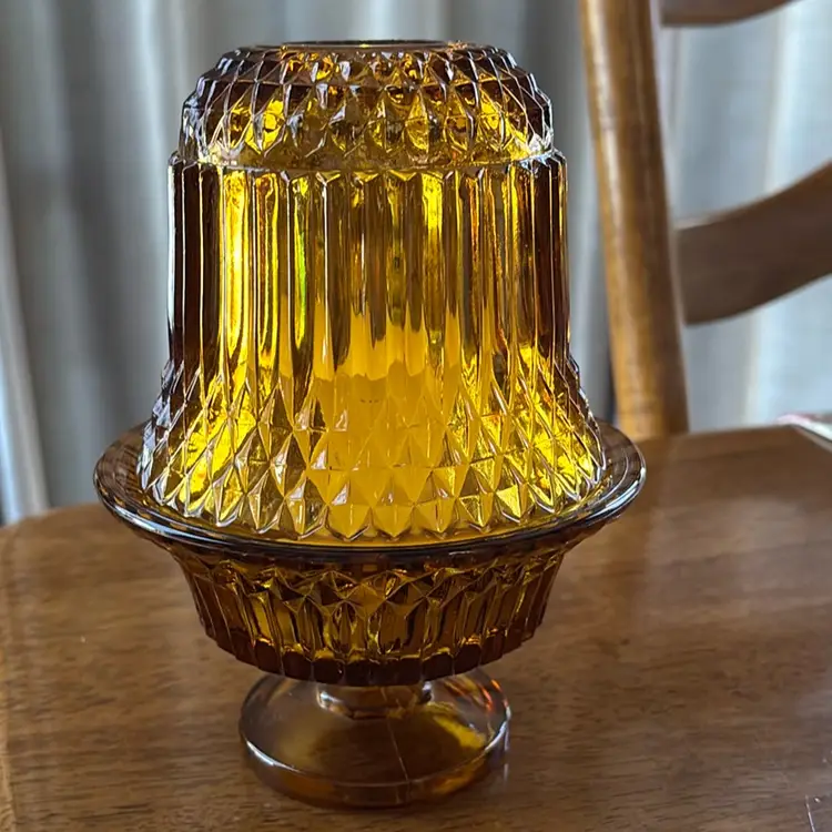 Vintage Indiana Glass Amber 2 piece fairy light. No chips or condition issues. Measures 7” tall by 5” wide.