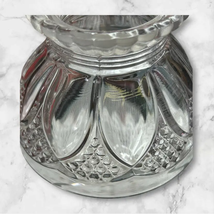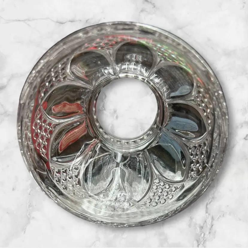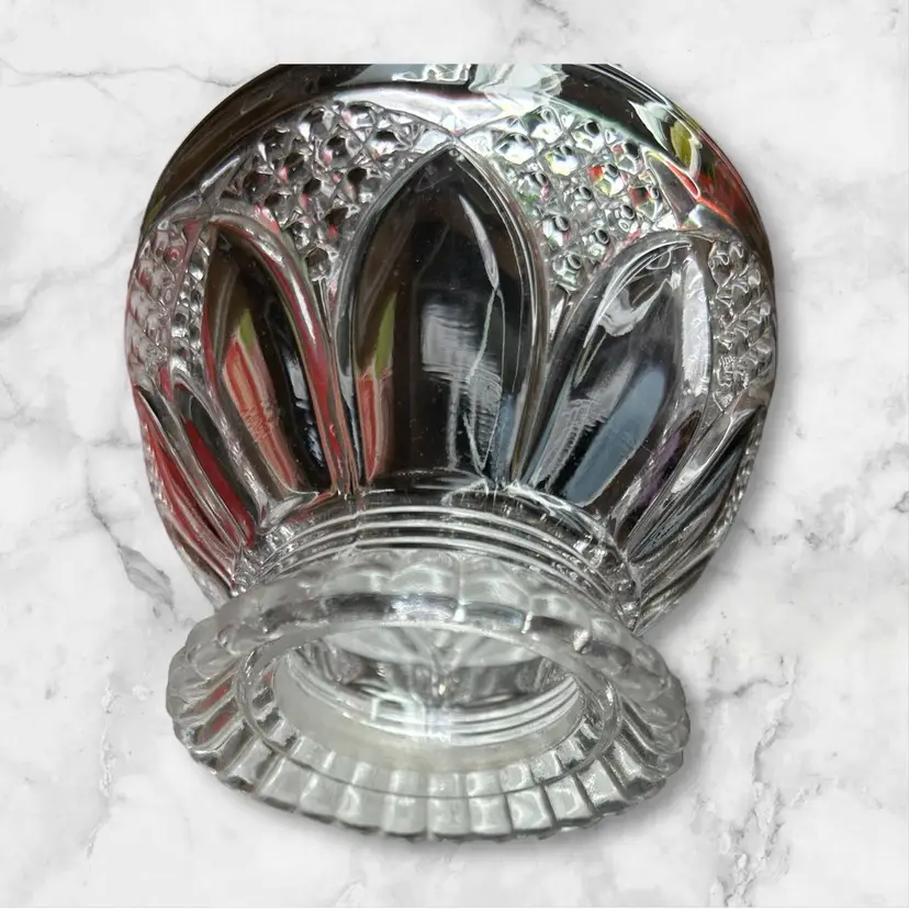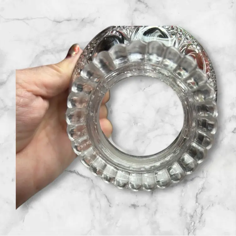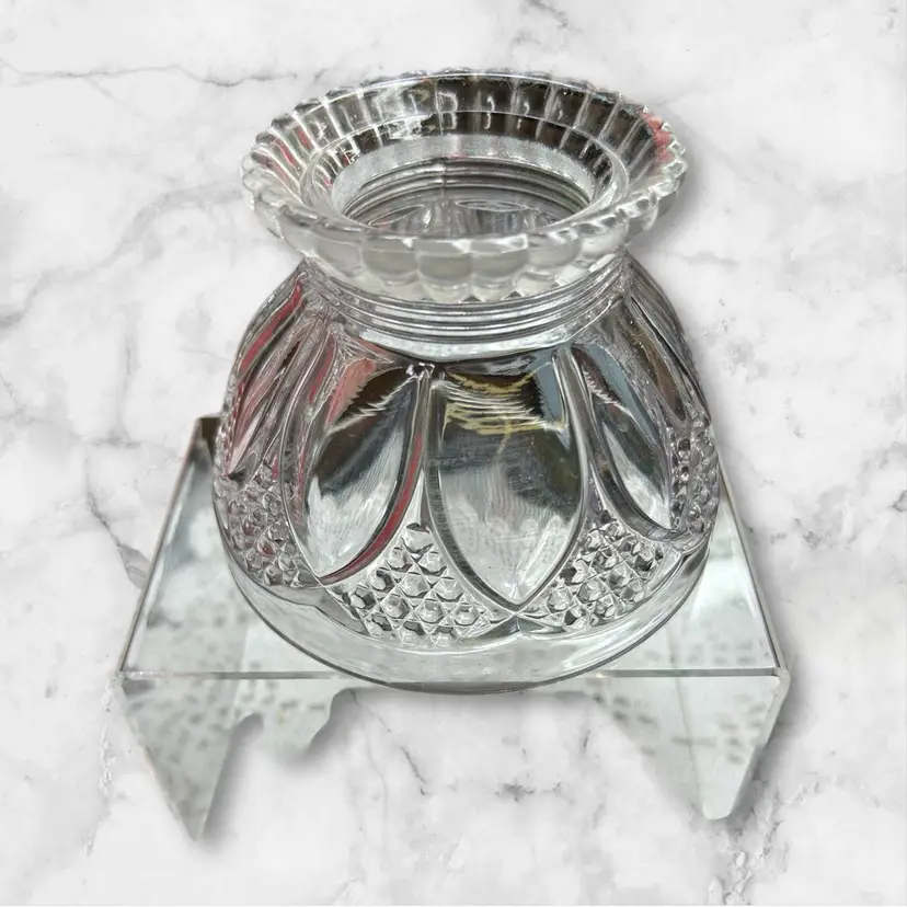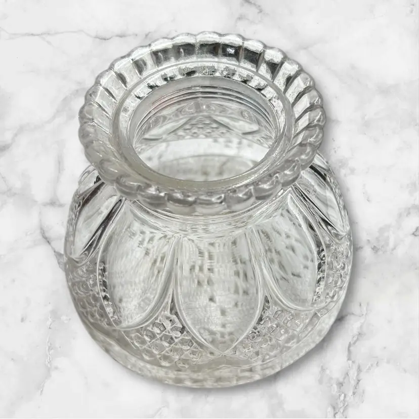 Open at top as well as bottom. 4” diameter across bottom. 1.5 diameter openings at top. Fluted ruffled top.