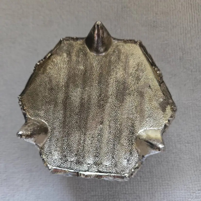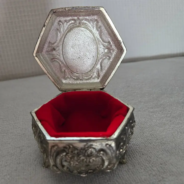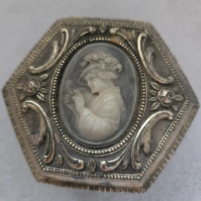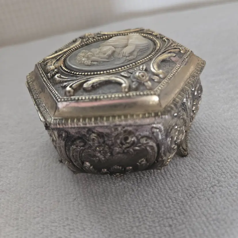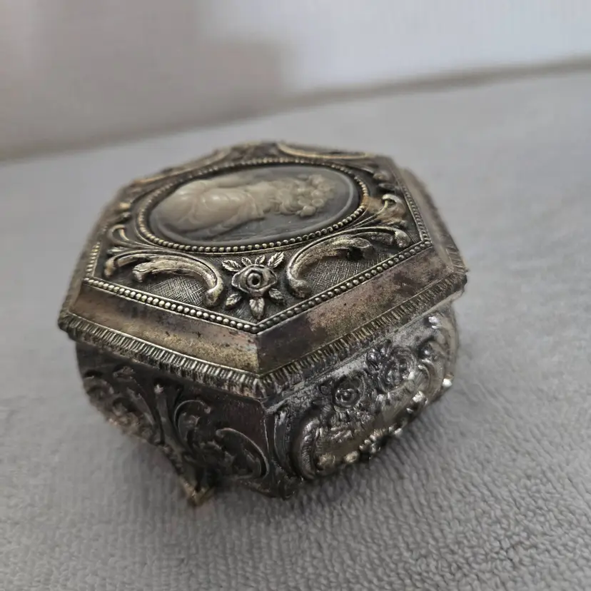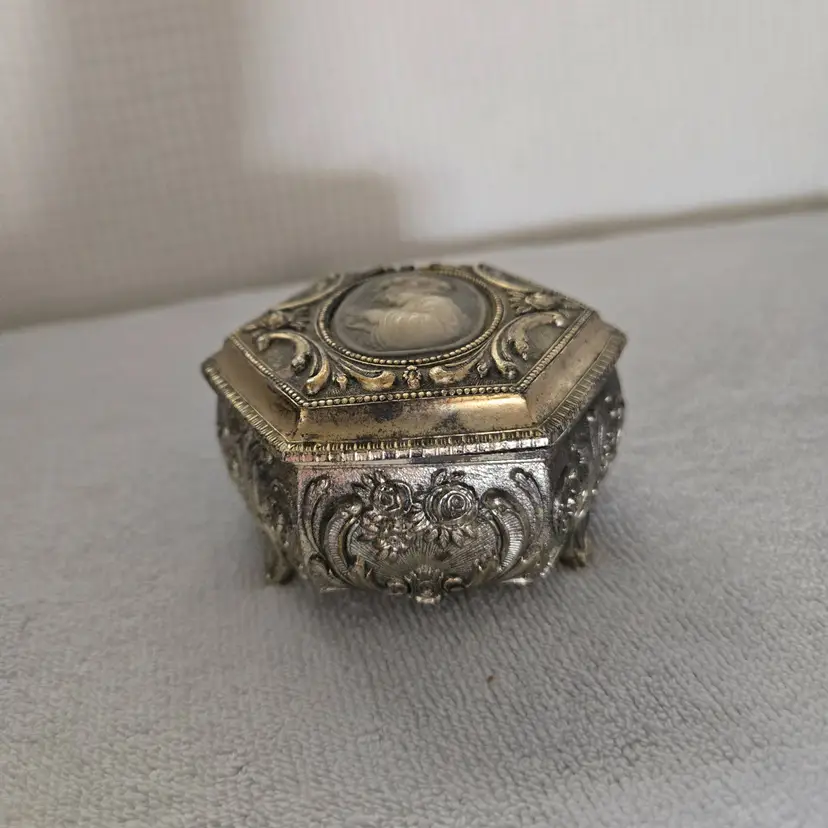 Features a red velvet interior in a hexagon shape. It has intricate designs on the gold plated surface. Shows some signs of wear on the finish but is still a beautiful piece. The cameo on the lid depicts a Victorian woman in a white dress. The box can be used for jewelry, trinkets, or your favorite things. It has a Japan stamp on the bottom . 2 " tall and 3" wide. It can probably be cleaned up better. I didn't want to ruin the patina. In great shape.