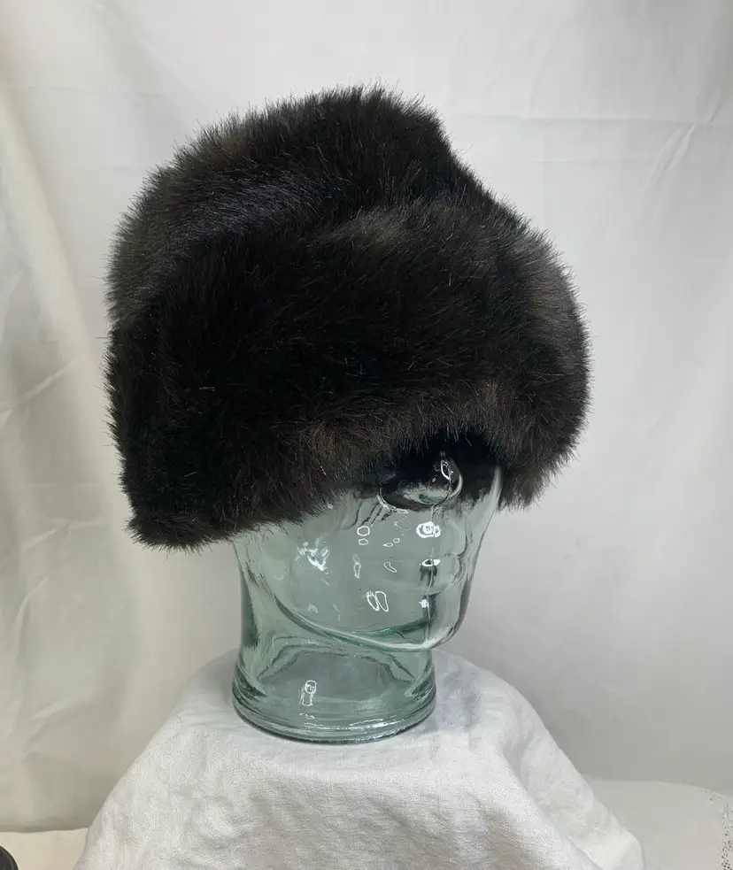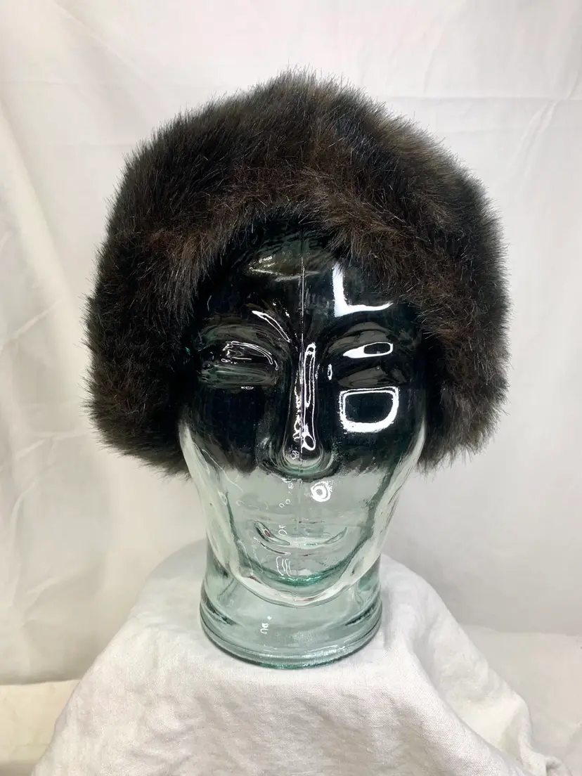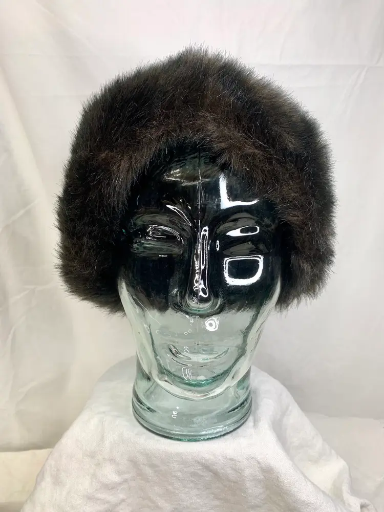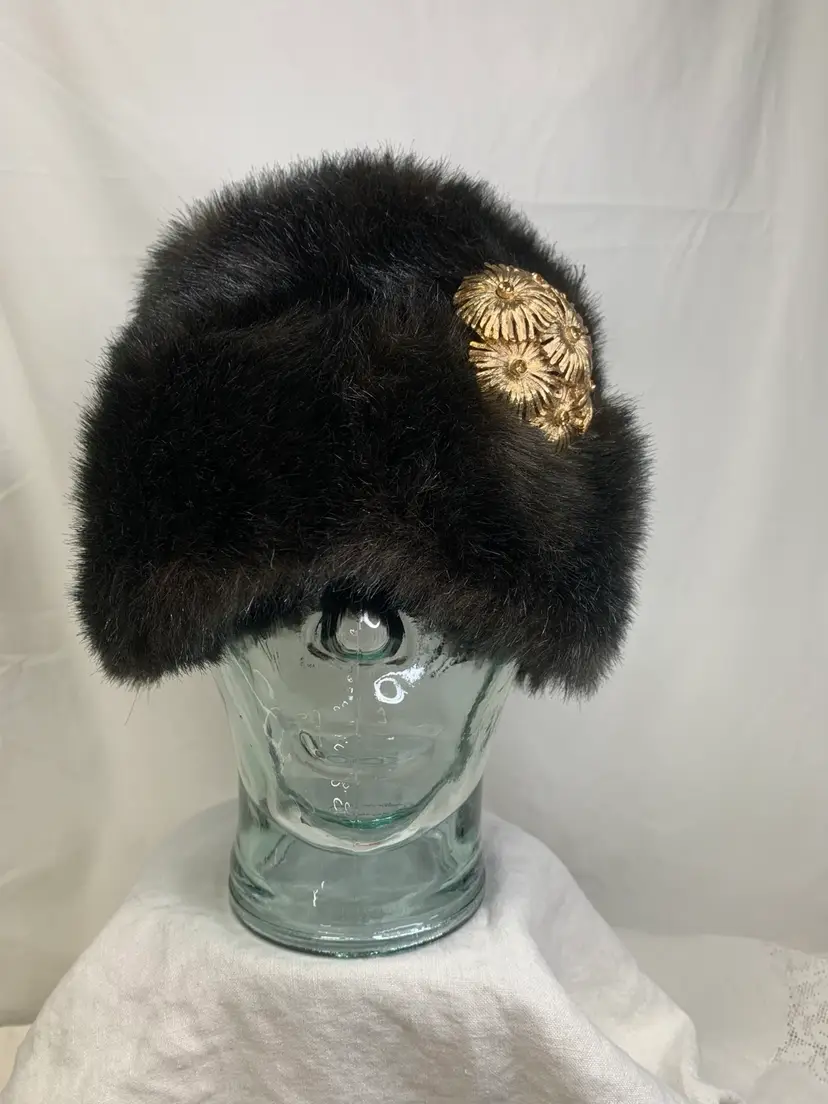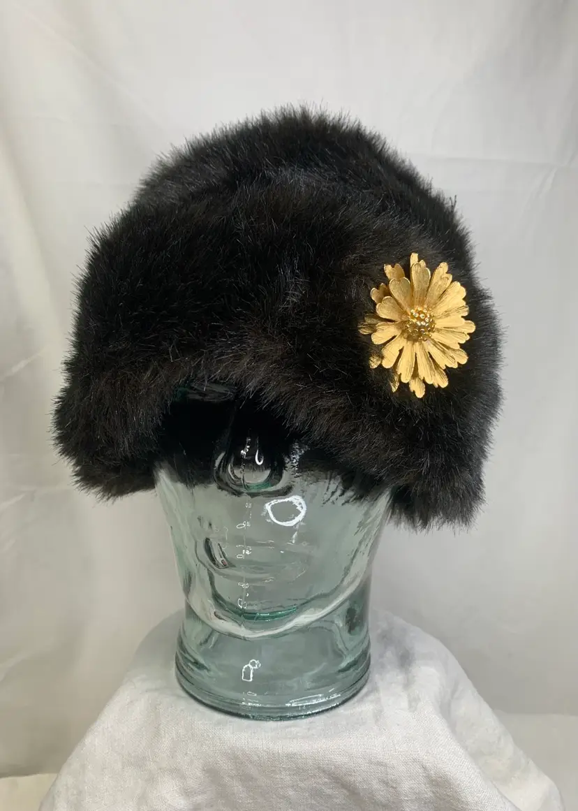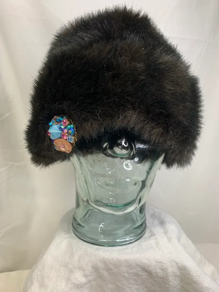 Yup, this is one of those fun, ultra stylish hats. Looks real, but is faux. Excellent vintage condition. Clean. Shown with brooches (not included, but can be purchased) for styling ideas. What a great way to add jewelry to an outfit.