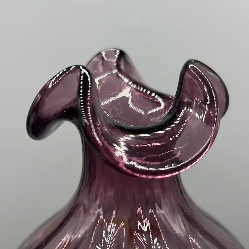 Fenton Art Glass hand-painted amethyst optic vase featuring a grapes and vine design. 8.5 tall, signed