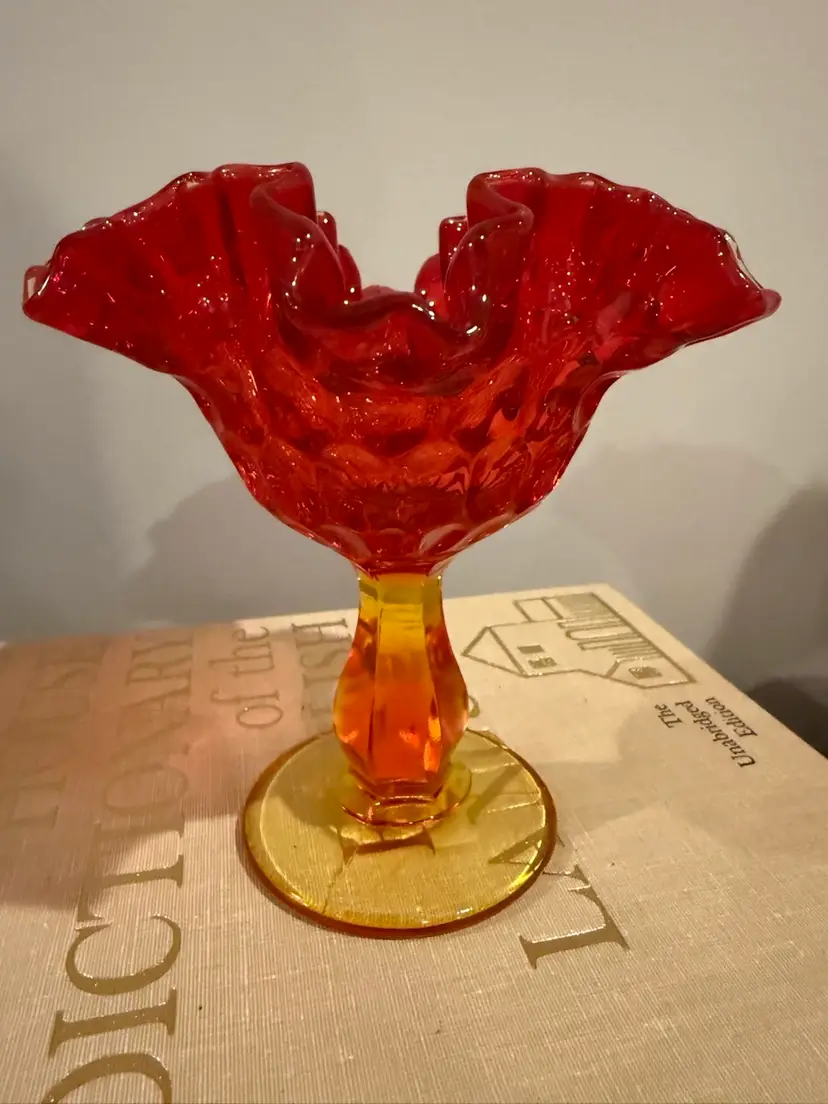 Vintage Fenton Amberina Ruffled Thumbprint Pedestal Compote Candy Dish. This stunning piece features a vibrant amberina glass, transitioning from a rich red at the ruffled rim to a warm amber in the stem and base. The classic thumbprint pattern adds texture and visual appeal, making it a beautiful display item or a functional candy dish. Perfect for collectors of vintage Fenton glass or anyone looking to add a touch of timeless elegance to their home decor. Excellent pre-owned condition, with no chips or cracks.
