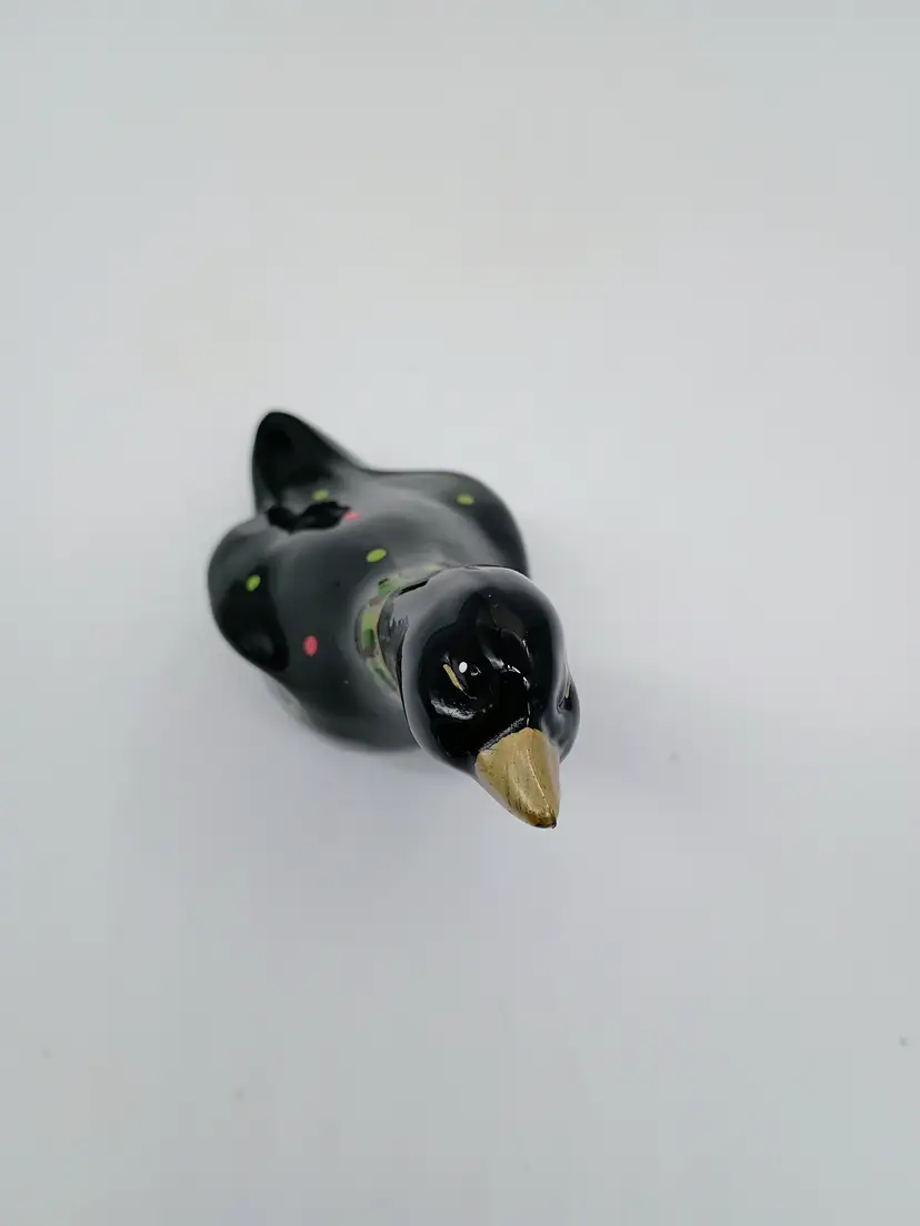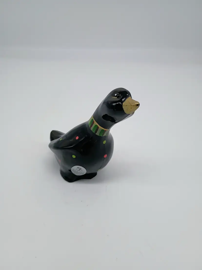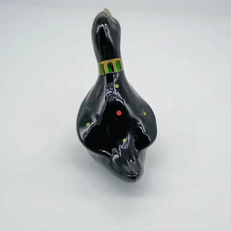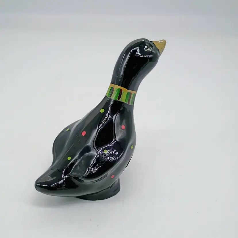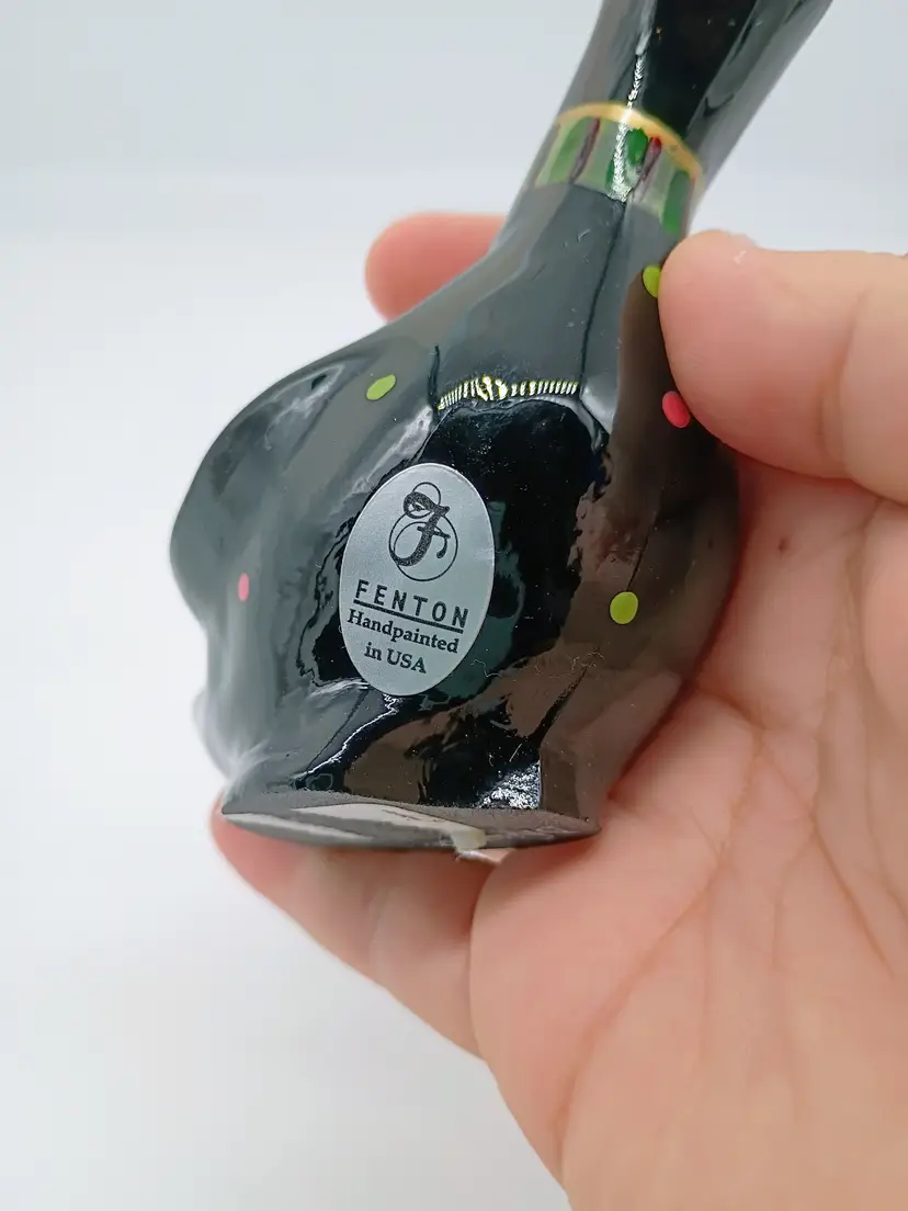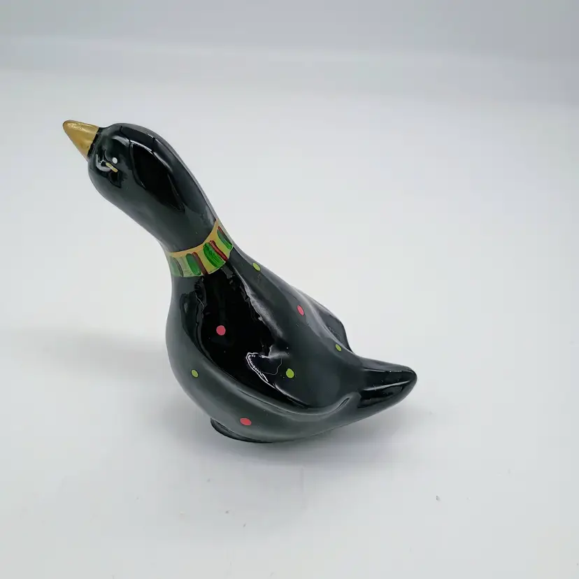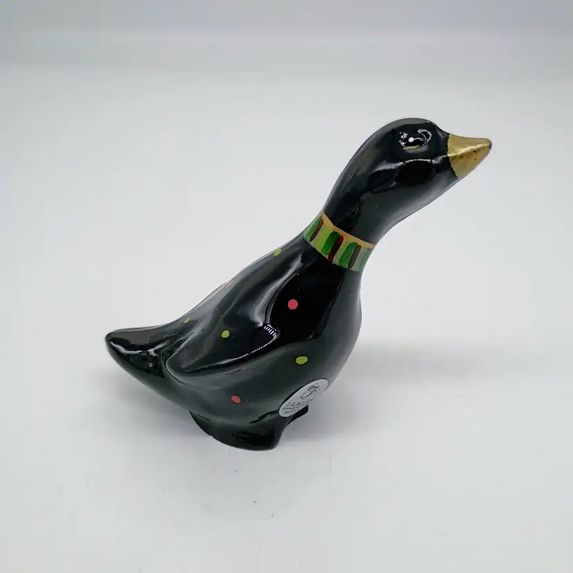 Fenton Art Glass Black Goose / Duck Hand Painted by D. Robinson. Circa 1980's. This is 3.75 inches tall and long and 2.25 inches wide. Fenton only produced this ebony color for a few years in the 70's and 80's. Polka dot design on back and green and gold striped collar. This is preowned Excellent condition, No chips cracks or flea bites there is a tiny spot on beak where there is no gold paint but this is how everyone I've seen looks the color just didn't stick to the very tip of the beak. Artist signed on bottom and has original sticker. Ships USPS domestically and UPS Internationally