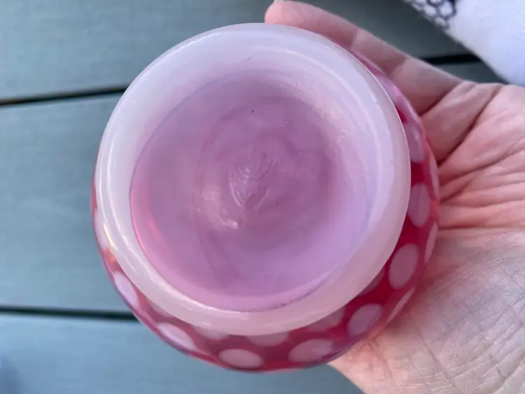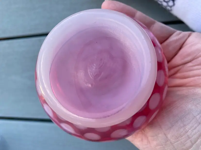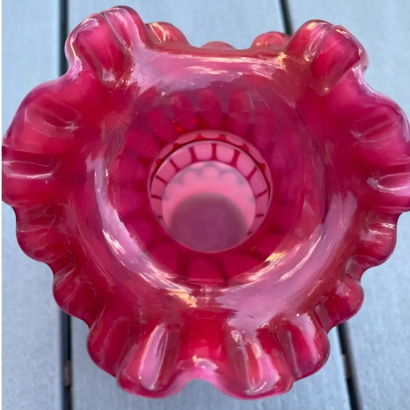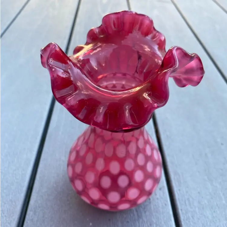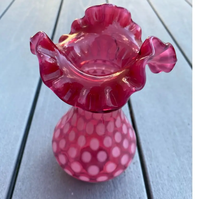 This is a gorgeous FENTON ART GLASS CRANBERRY COIN DOT RUFFLED OPALESCENT VASE—is it simply stunning!!! It is cranberry with pink polka dots with ruffles design. This vase measures approximately 6 1/2” tall x 4" wide at its widest and is in great condition with no visible cracks or chips.
