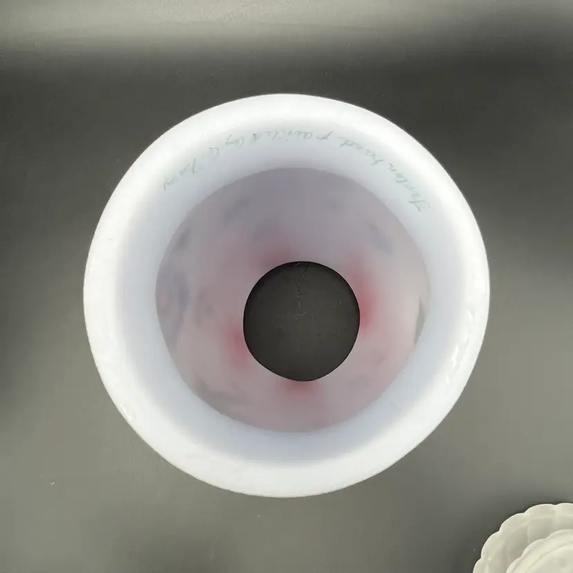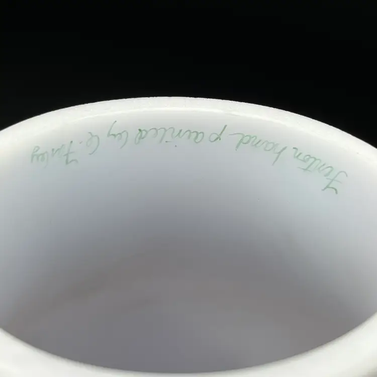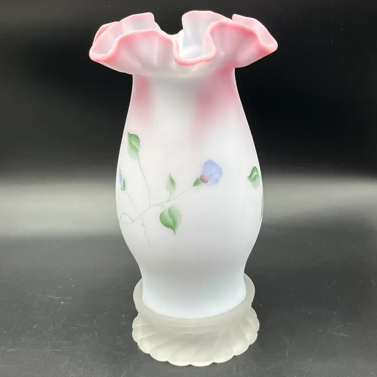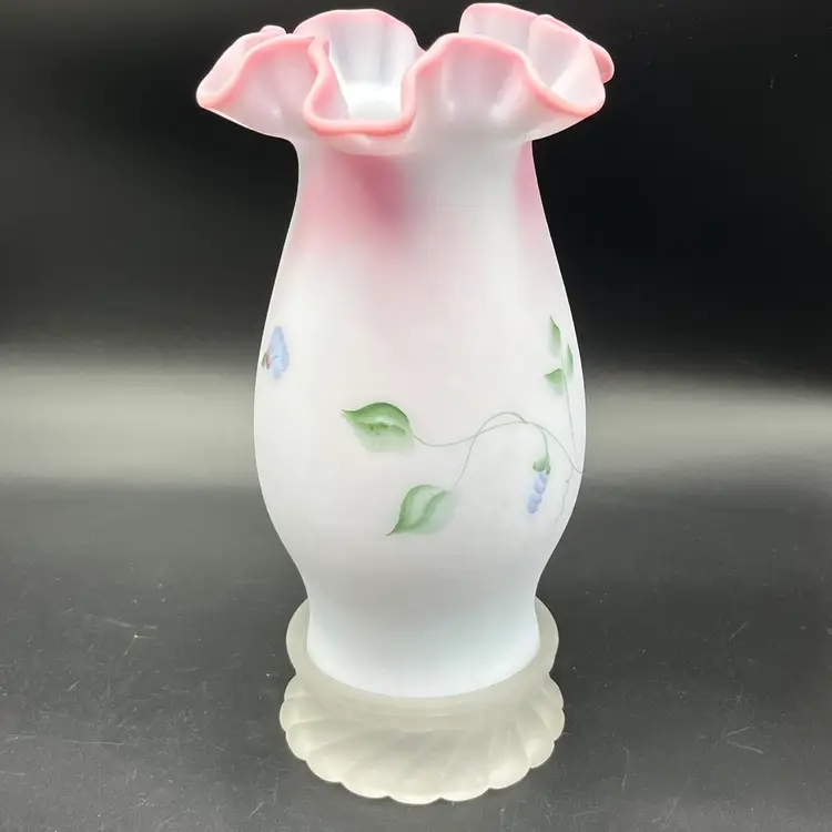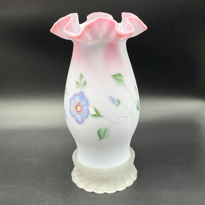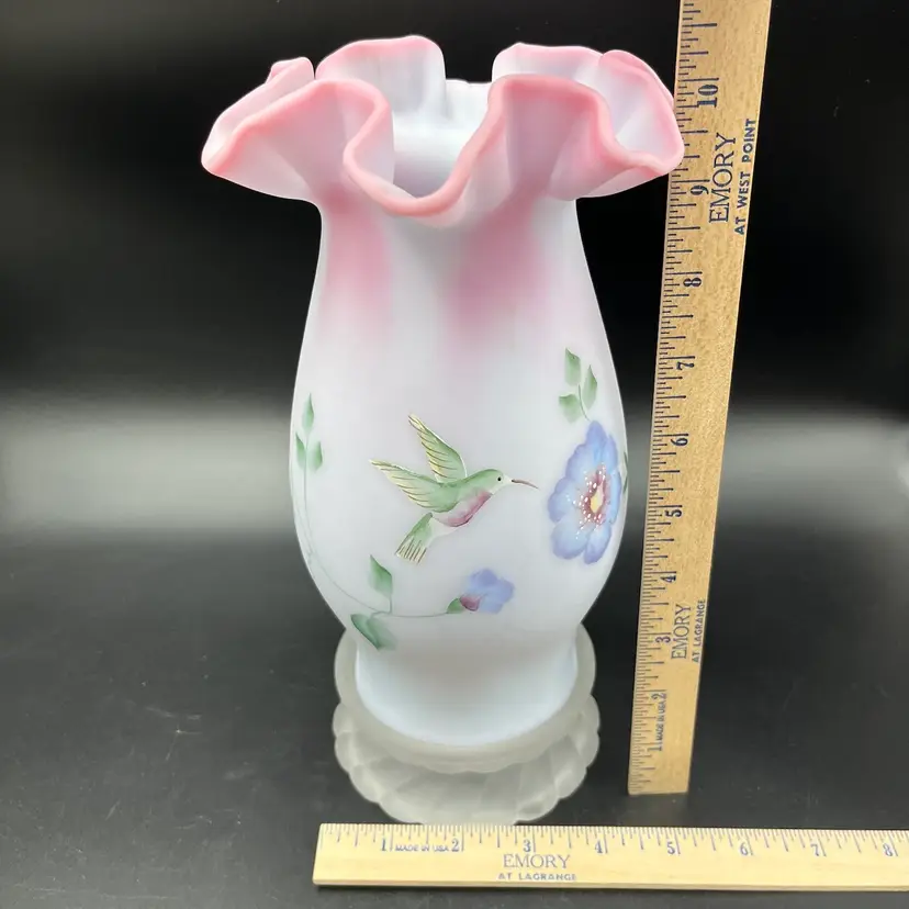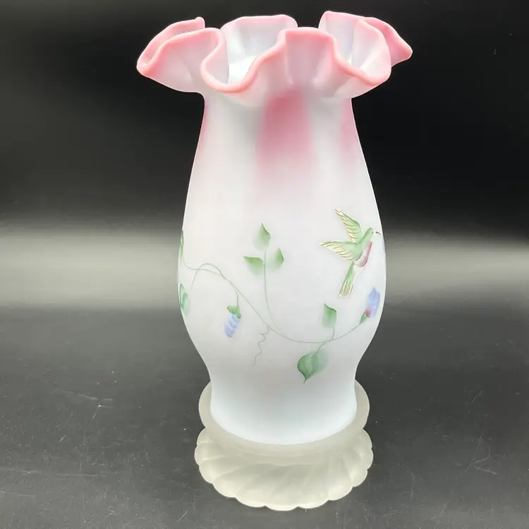 For sale is a beautifully hand-painted Fenton Blue Burmese art glass candle holder with hurricane shade from their 95th anniversary in 2000. The shade features a hummingbird and flowers, and it is signed on the inside bottom 'Fenton Hand-Painted by A. Fraley'. That's Alice Farley. The entire 2-pc set together stands 10" tall and it is about 4 1/2" at the widest point. This is a very rare piece, given the combination of Burmese Glass and the hummingbird motif. Both pieces are in excellent condition. Please see all pictures. Feel free to contact me with any questions. I do combine shipping.