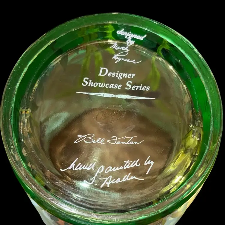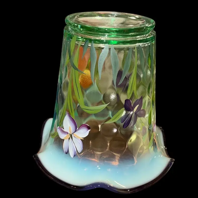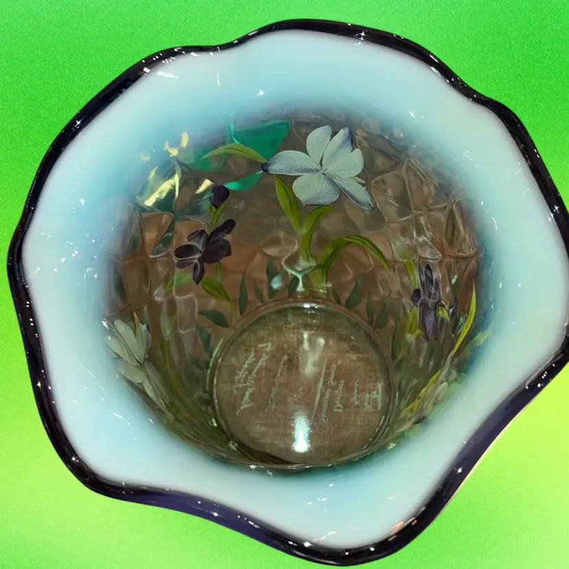 6” H x 6” mouth x 3.5” base. This particular vase, identified as a "Purple Iris Flip Vase," showcases Fenton's tradition of combining pressed glass techniques with hand-painted artistry. The opalescent glass, which becomes milky and translucent when heated, combined with the delicate floral motif, exemplifies the aesthetic that made Fenton a beloved name in American decorative arts. Pieces like this, especially those produced for special collections or television shopping channels, are sought after by collectors for their craftsmanship and nostalgic appeal. Signed by Bill Fenton and the artist. Perfect condition.