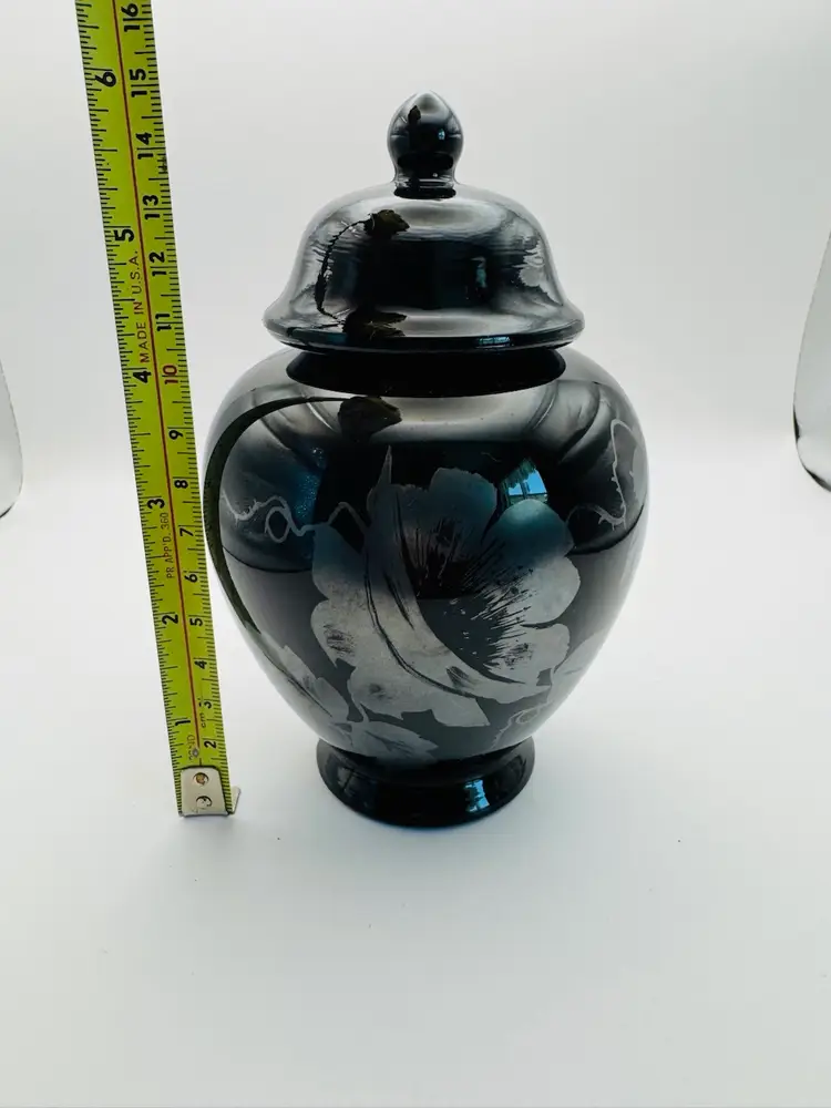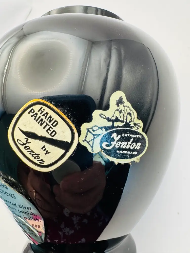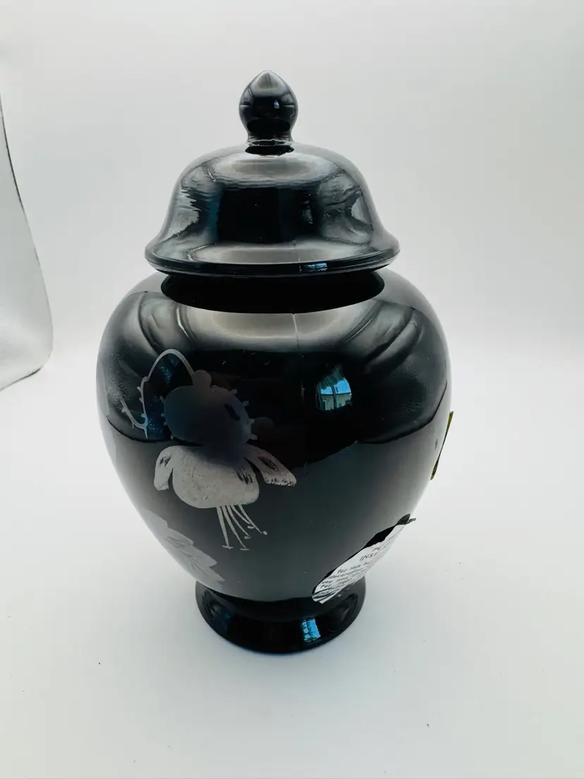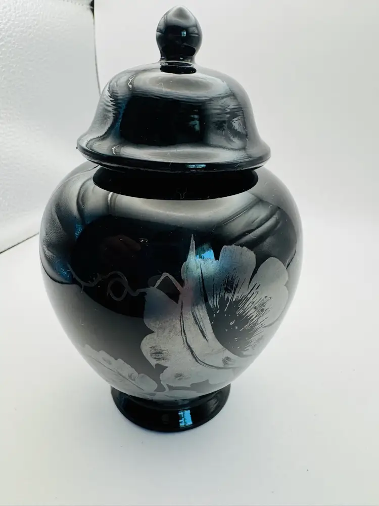 Beautiful Hand Painted Floral in Silver Over Black Ginger Jar. Fenton Mark, Stickers and Signature still Intact.