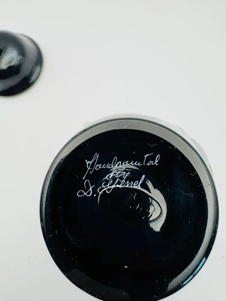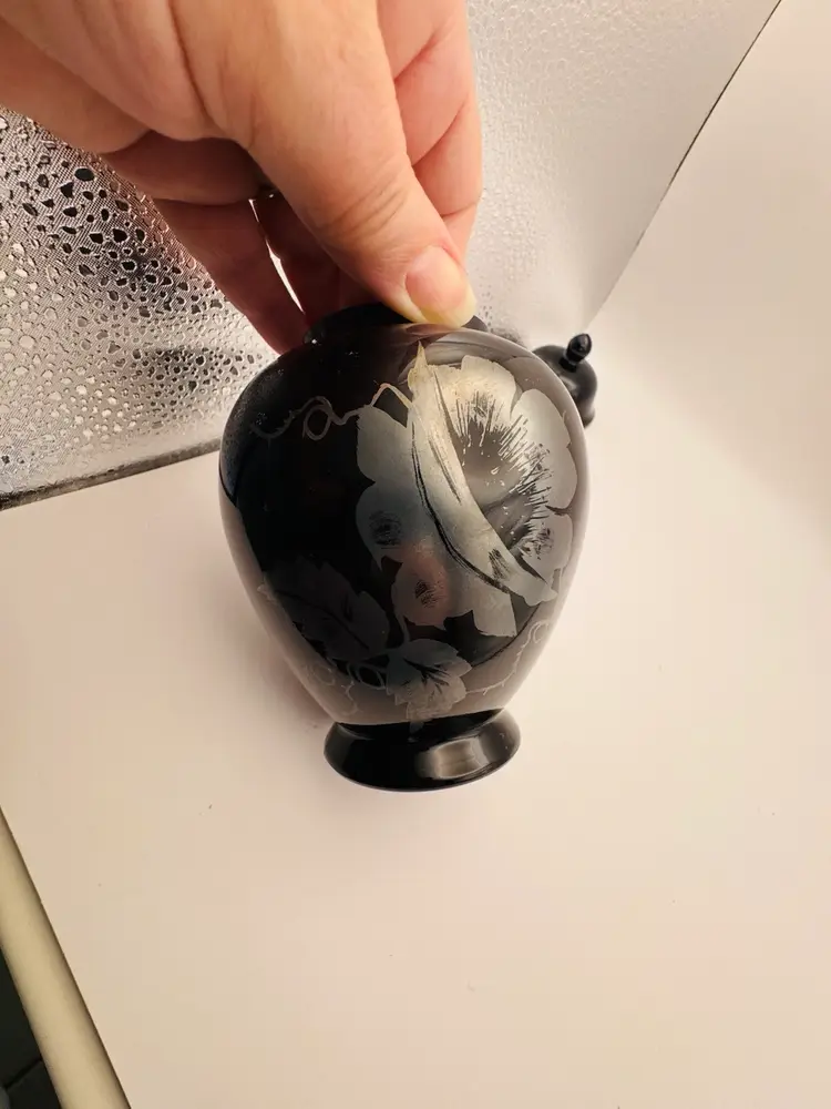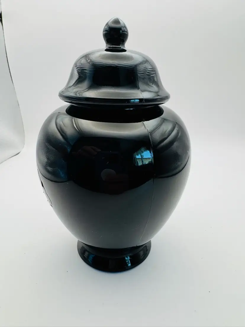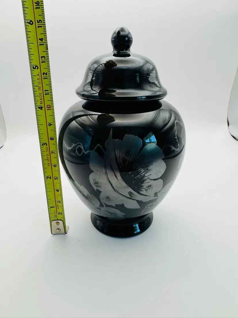 Beautiful Hand Painted Floral in Silver Over Black Ginger Jar. Fenton Mark, Stickers and Signature still Intact.