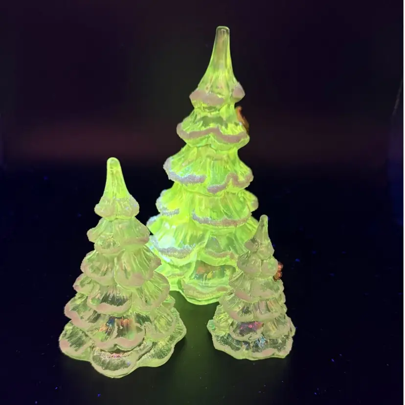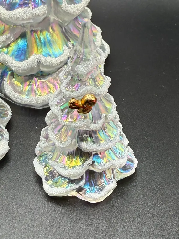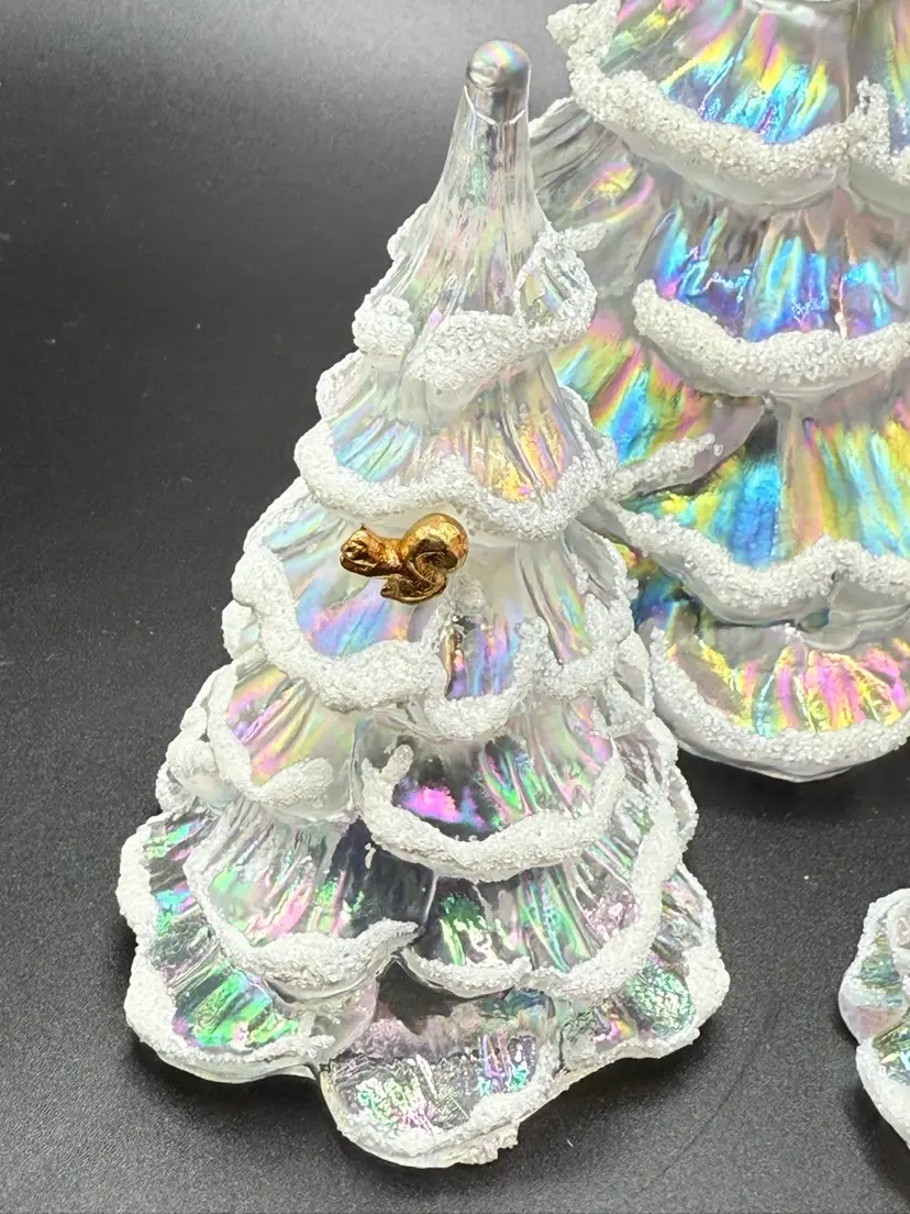 The opalescent glass radiates rainbow hues under the light, giving these trees an enchanting winter sparkle that’s pure Fenton artistry.