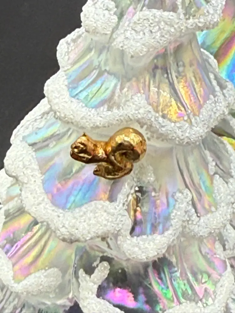 Magical shimmer meets woodland charm in this set of three Fenton iridescent glass Christmas trees, each hand-detailed with glittering “snow” and finished with a gleaming 24K gold animal accent — one with a cardinal, and two with sweet little squirrels.