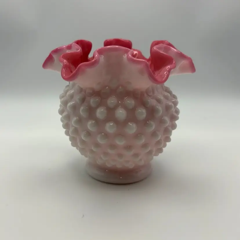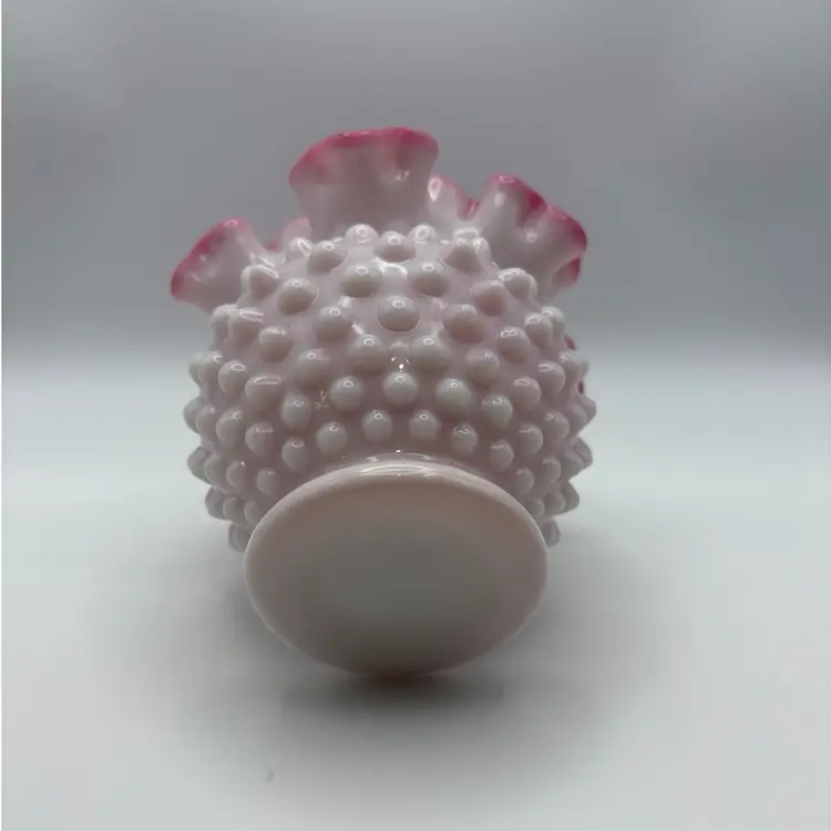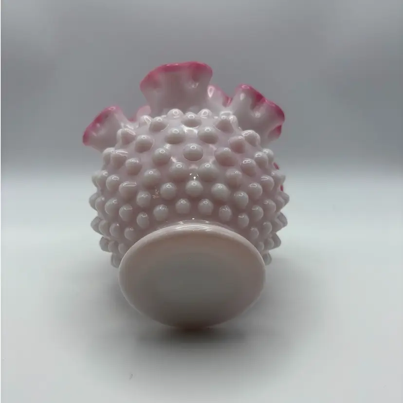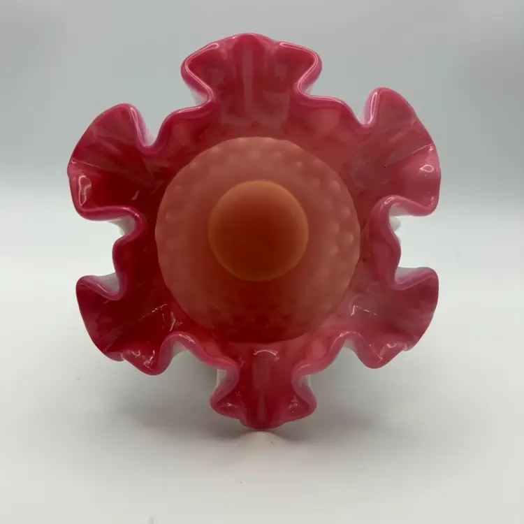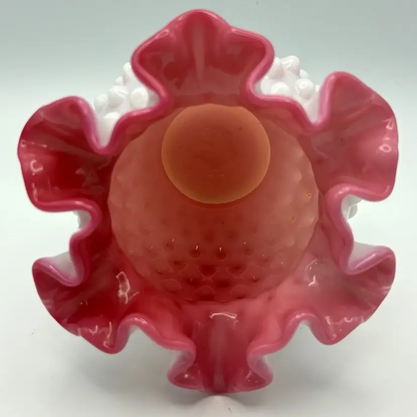 1950s Fenton Peach Blo. $65 Made between 1952-1955. Milk glass overlaid on cranberry glass. Indentation of hobnails are visible on the inside of the bowl. Original sticker would have been present versus a stamp that originated in the 1970s.