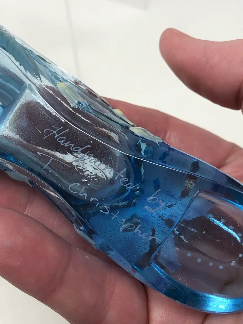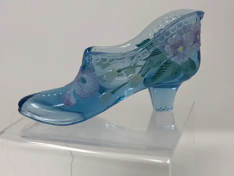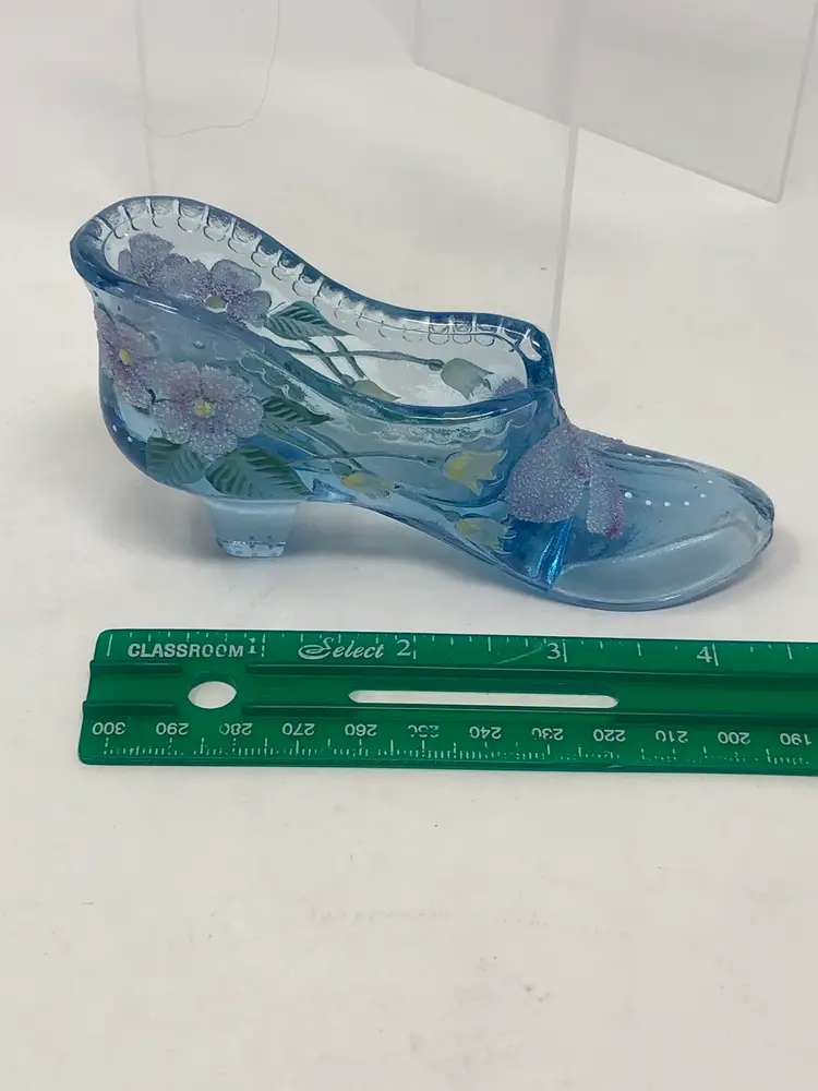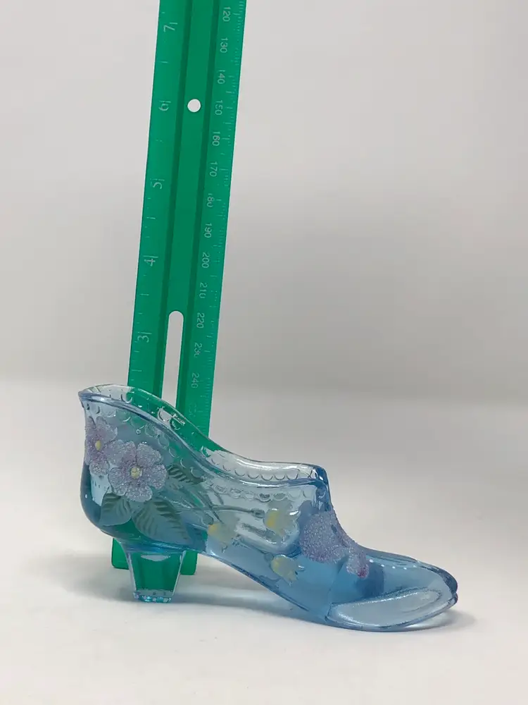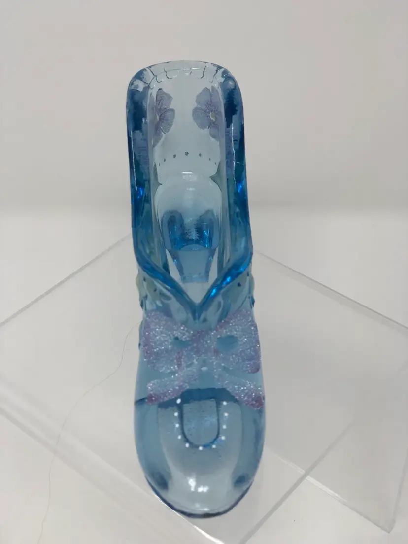 5" ice blue princess slipper by Fenton glass. Hand painted and signed by T. Christopher as part of the 95th Anniversary Collection. Accented with crushed glass 'icing'. Excellent condition.