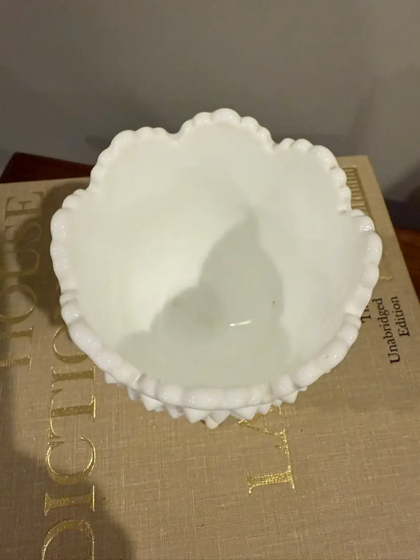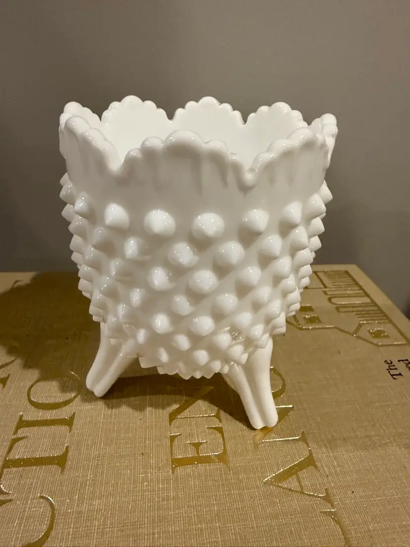 Vintage Fenton White Milk Glass Hobnail Egg Shaped Three Footed Vase, 4.5 inches tall. This charming piece features the classic hobnail texture beloved by collectors, an egg-shaped body, and stands on three sturdy feet. A beautiful addition to any collection or as a standalone decorative accent. Excellent pre-owned condition, no chips or cracks noted.