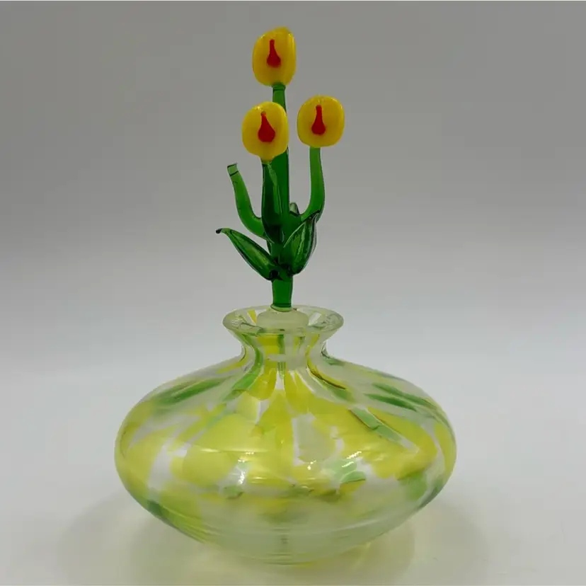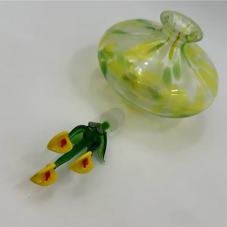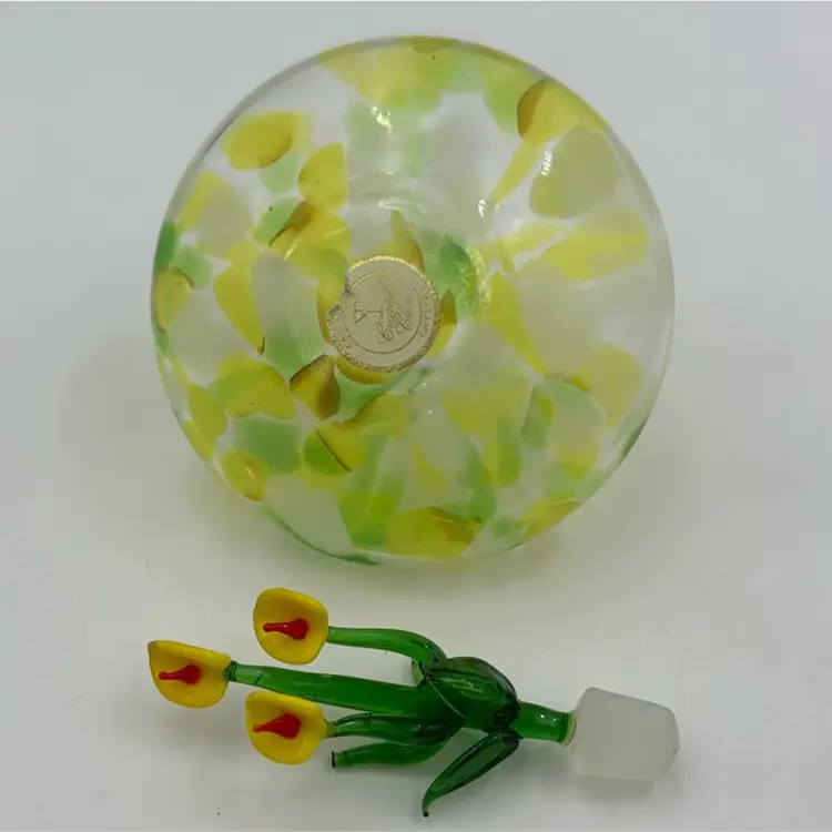 6” T 4”W the stopper has one broken flower it does not take away from the beauty. The bottle has no chips cracks or brakes. As is
