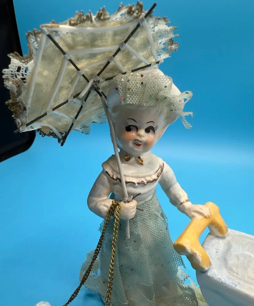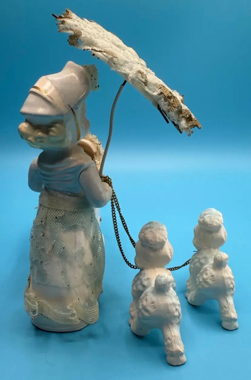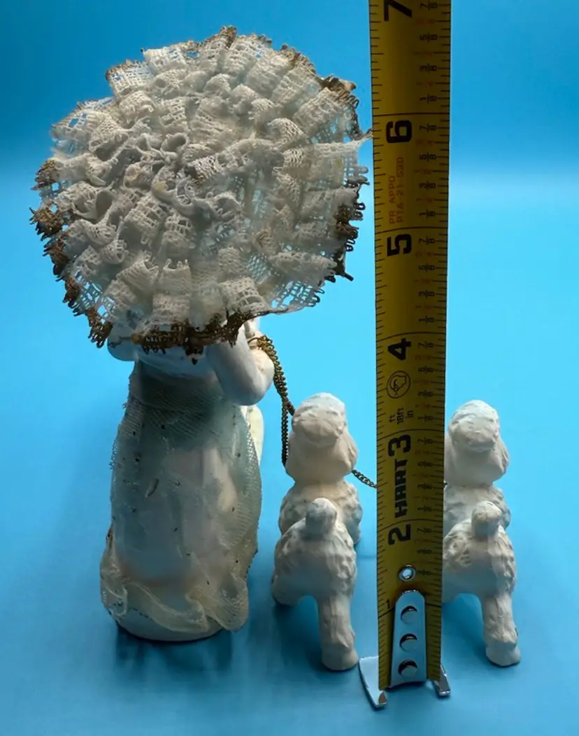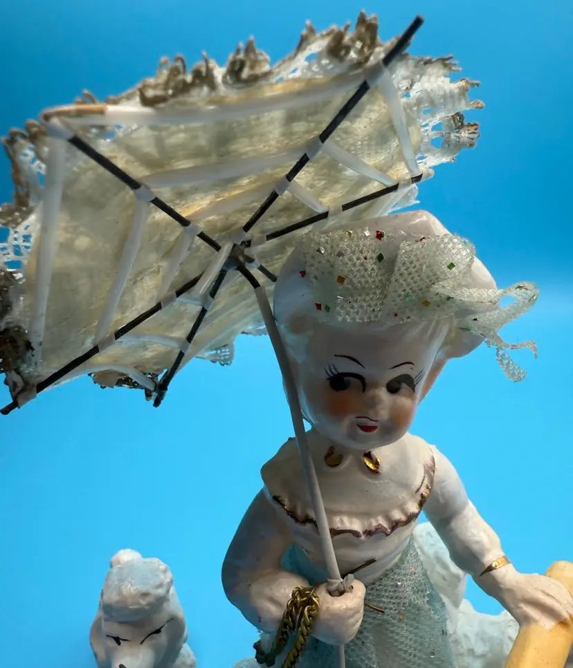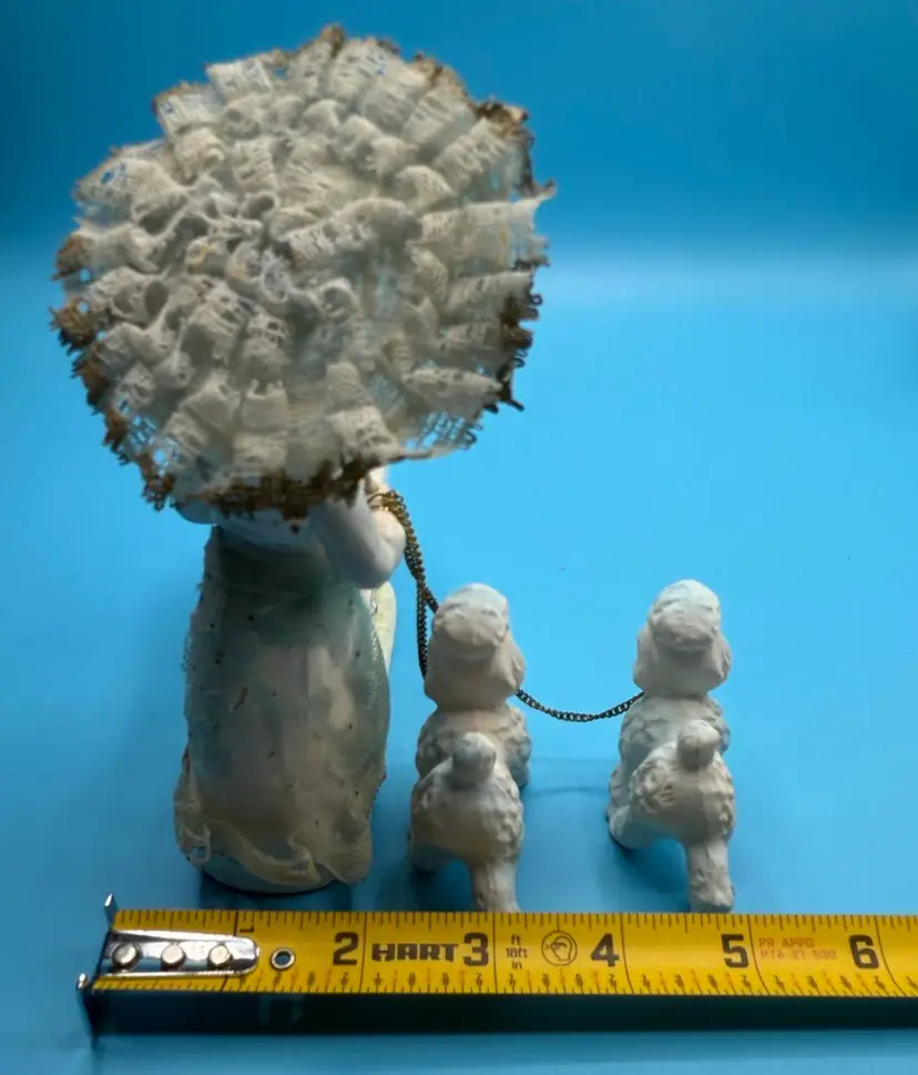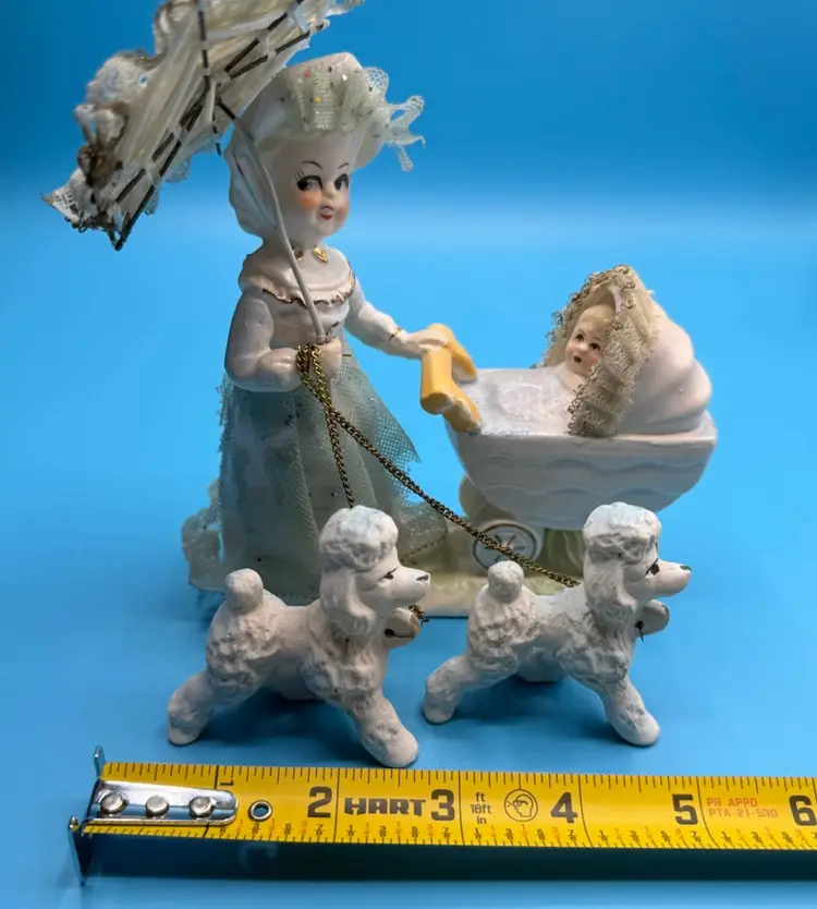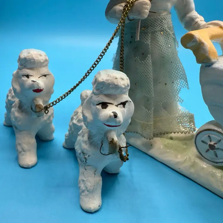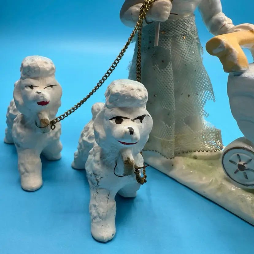 Condition: * No combined Shipping due to fragile nature of this piece* There are No Chips or Cracks to the Ceramic. or chalk-ware poodles. There IS WEAR to the lace on the dress, bonnet, parasol and the carriage( see photos for details). There Is wear to the paint and crazing to the glaze. Wear is consistent with vintage age of the piece.