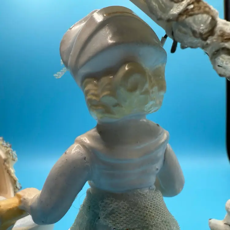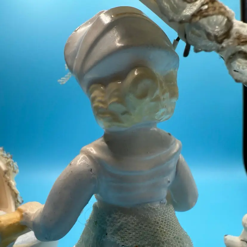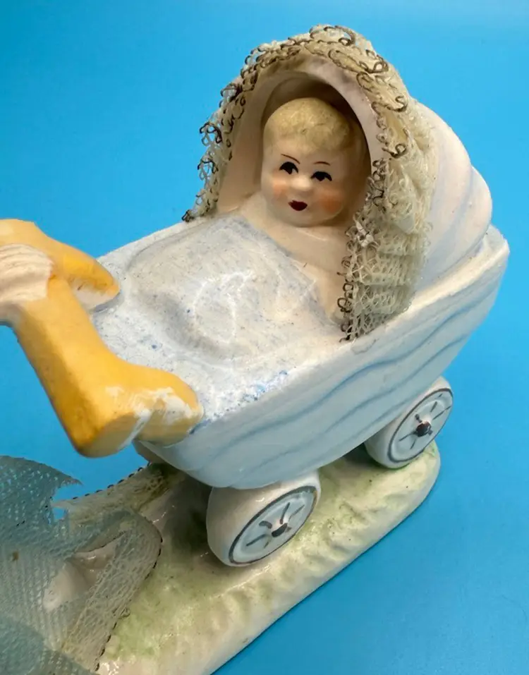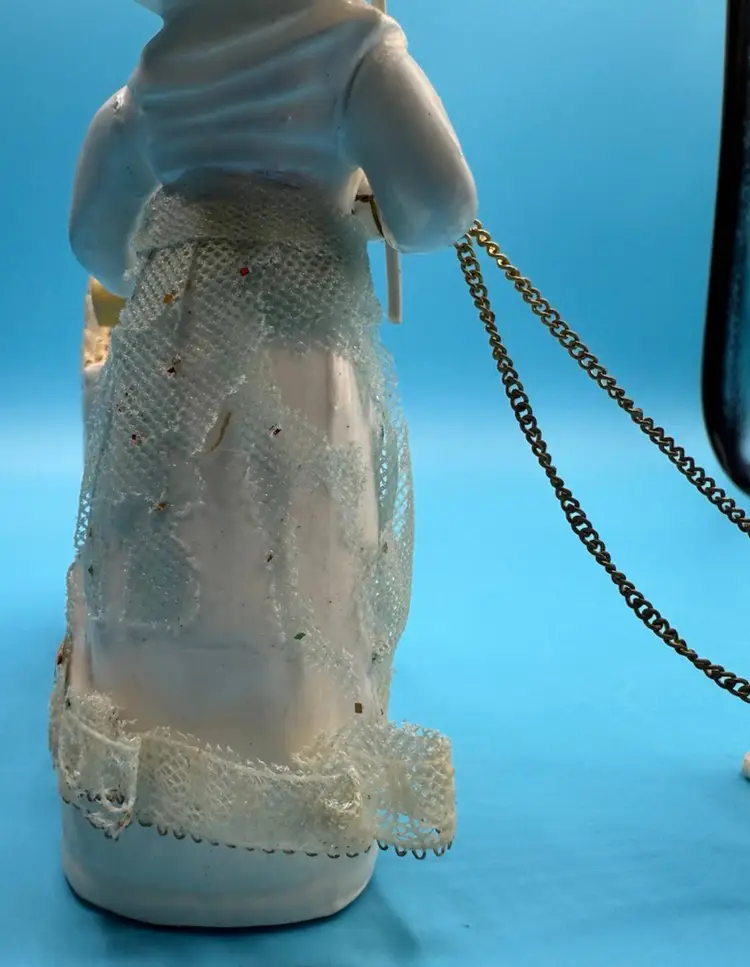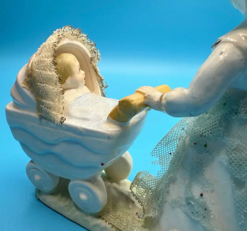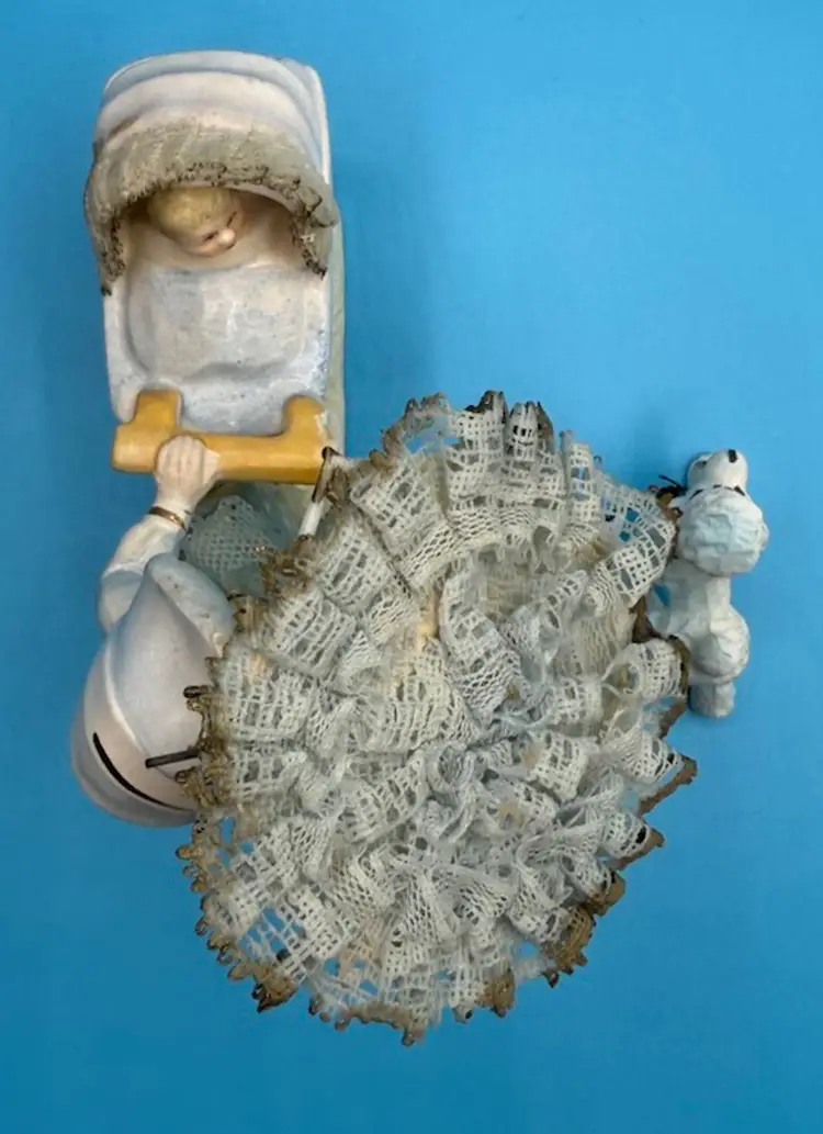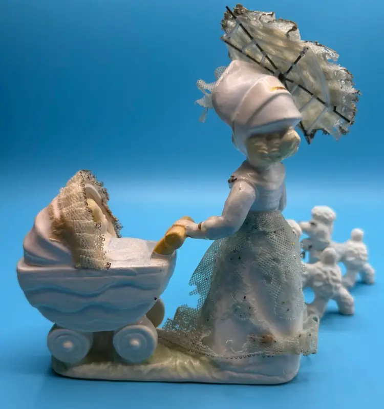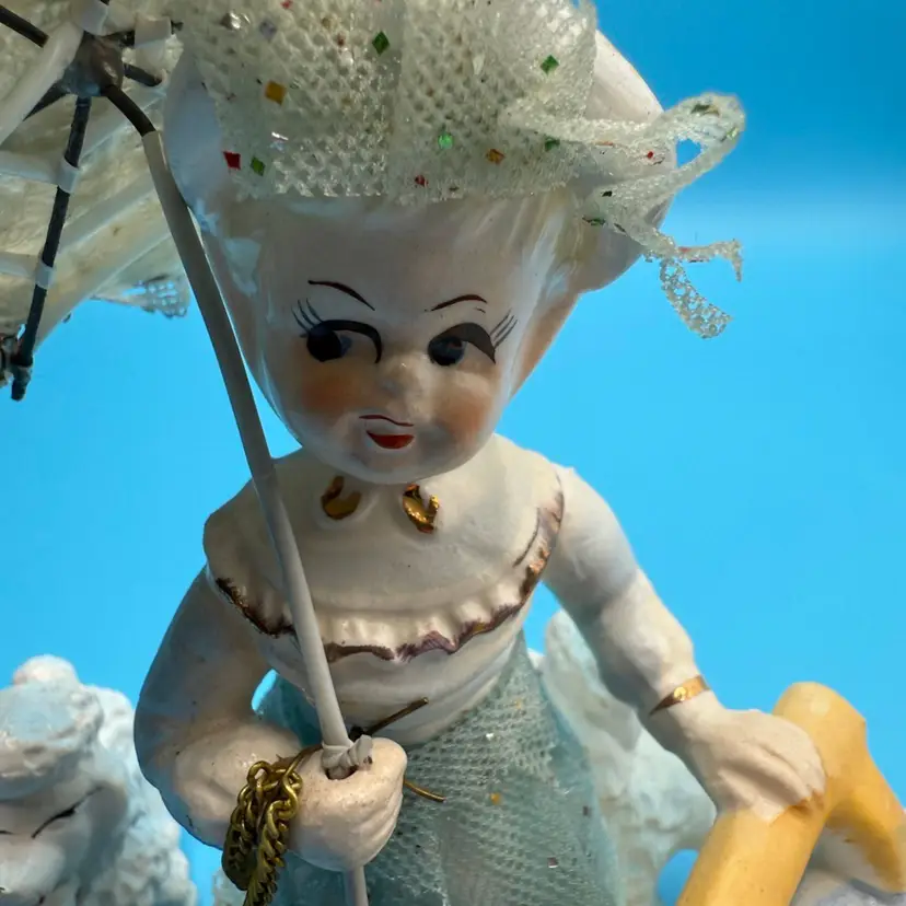 Condition: * No combined Shipping due to fragile nature of this piece* There are No Chips or Cracks to the Ceramic. or chalk-ware poodles. There IS WEAR to the lace on the dress, bonnet, parasol and the carriage( see photos for details). There Is wear to the paint and crazing to the glaze. Wear is consistent with vintage age of the piece.
