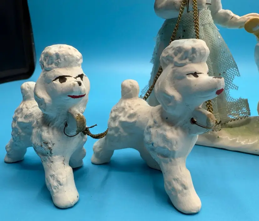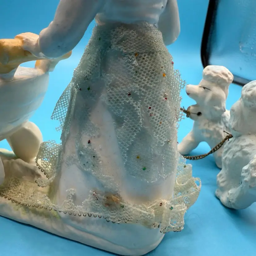 Description: This is a Vintage Mid Century Modern Figurine made in Japan (sticker on base) most likely attributed to Arnart Creations. This type of figurine with chained poodles and lace was a popular import during the 1950's-1960's.
