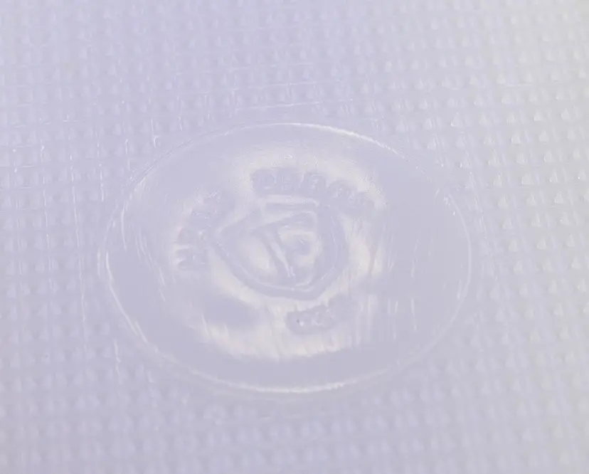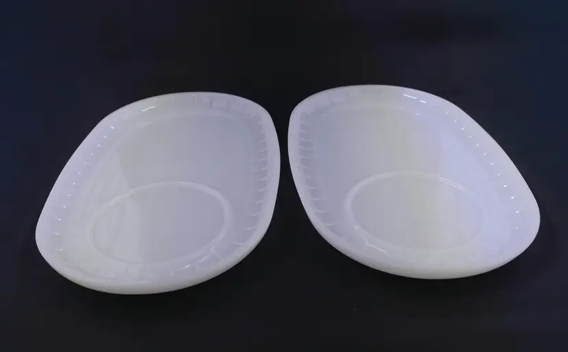 A pair of white milk glass oval-shaped plates, commonly called sandwich or snack plates. The plate features a single indented ring for a cup and a ribbed pattern on the rim. The bottom of the plates is marked with the Fire-King logo, Heat-Proof and Made in the U.S.A. Both pieces are in excellent condition. Approx. size: 6"w x 10" L.