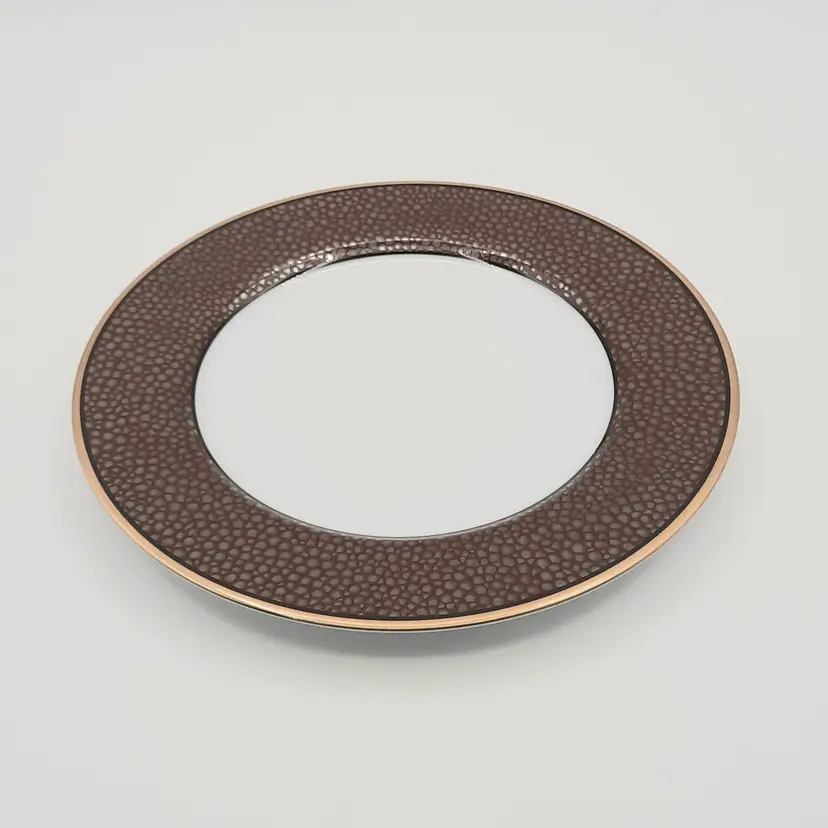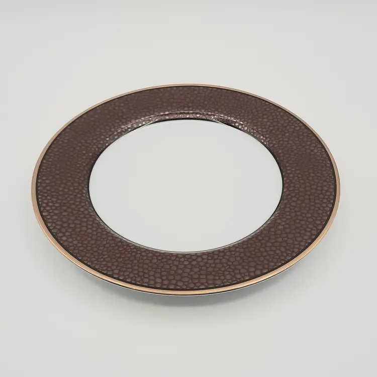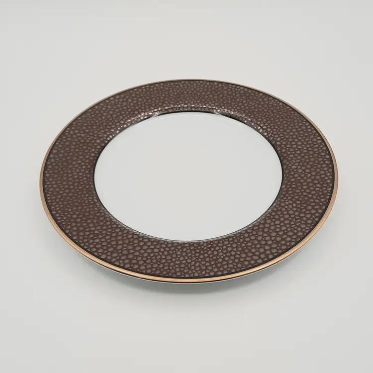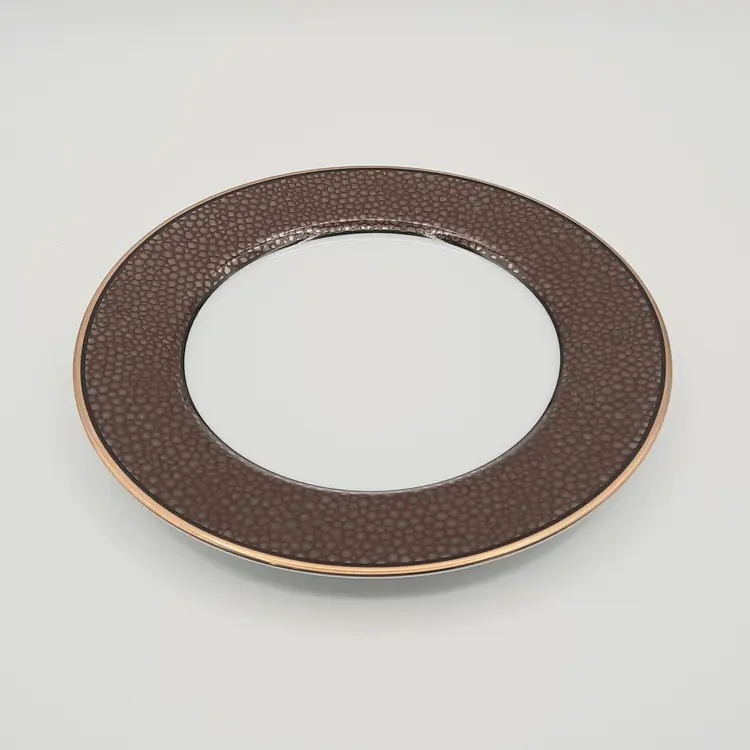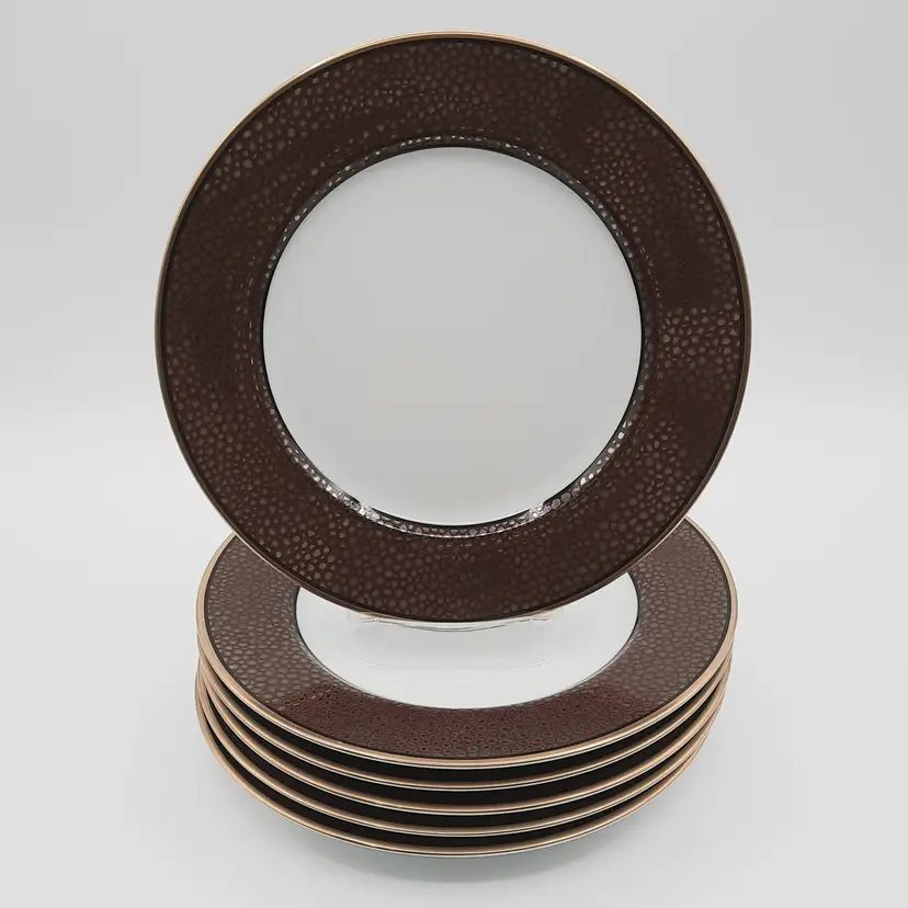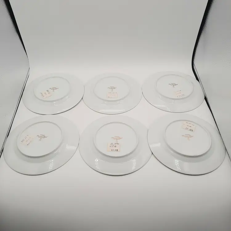 Gorgeous 7 1/2" porcelain plates have a dark burgundy/wine and gold design around the rim, excellent condition - all plates still have original price tags on bottom I also have a set of 5 of the same plates listed