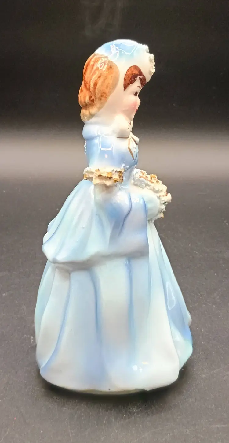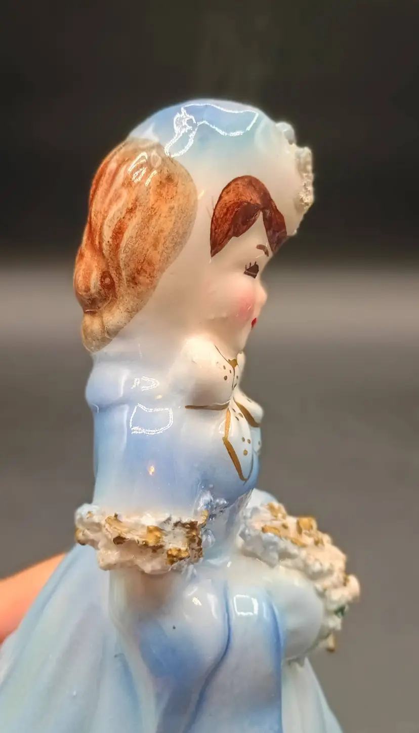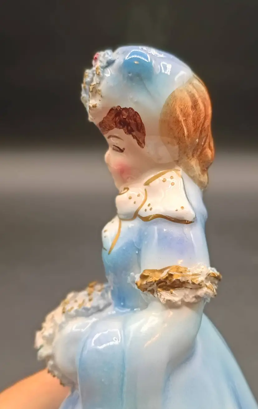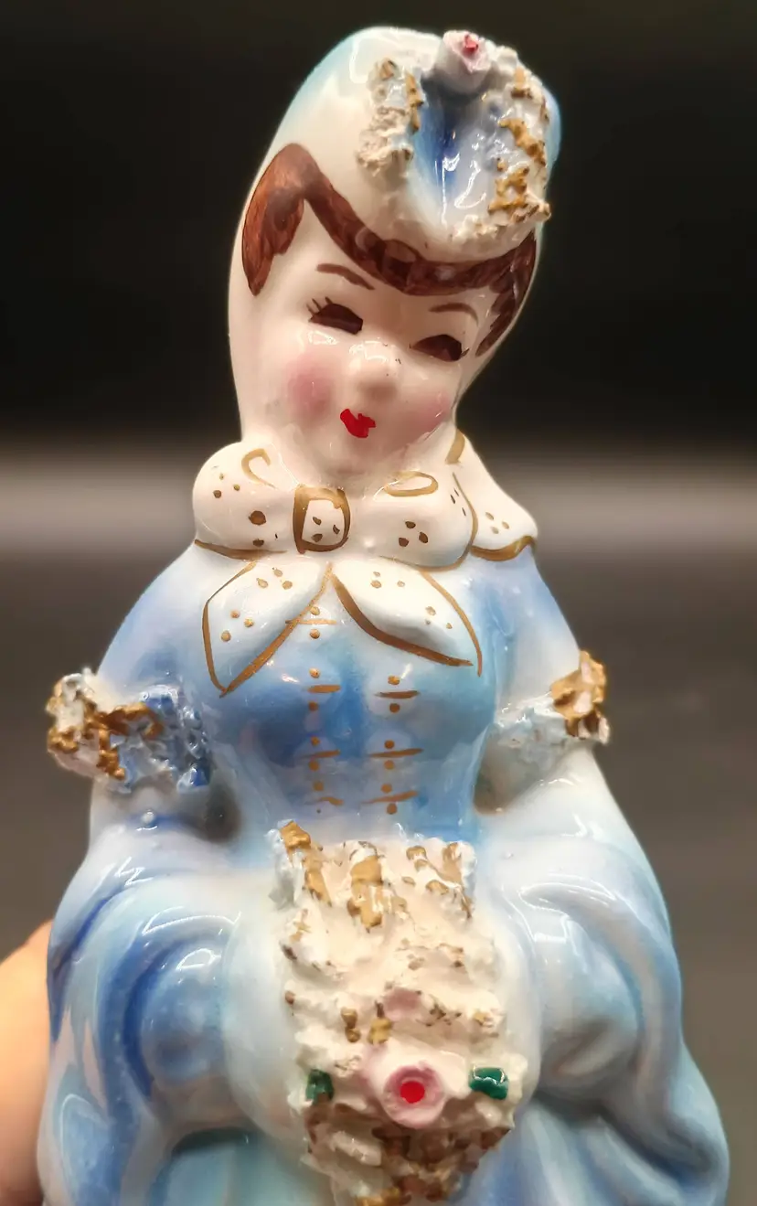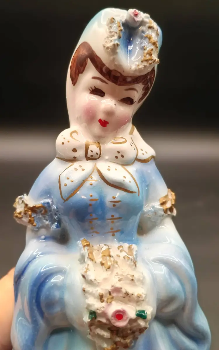 Lovely Lady in Winter Blue coat along with Muff. Her spaghetti trim all appears to be intact with gold trim. She stands 7 inches tall. There is a small chip on the lower front of her dress.