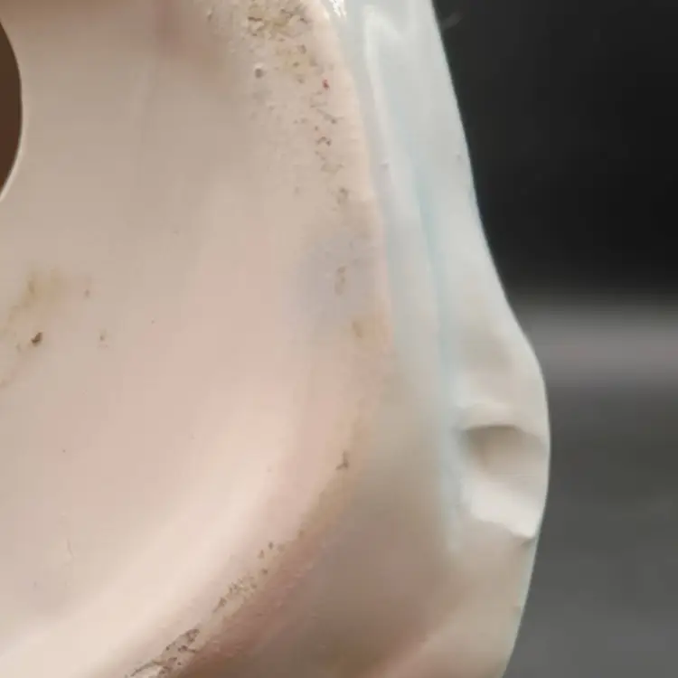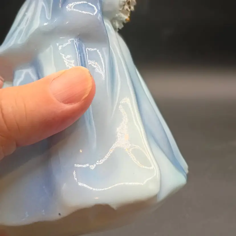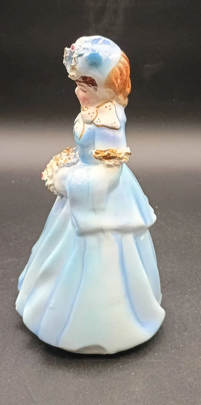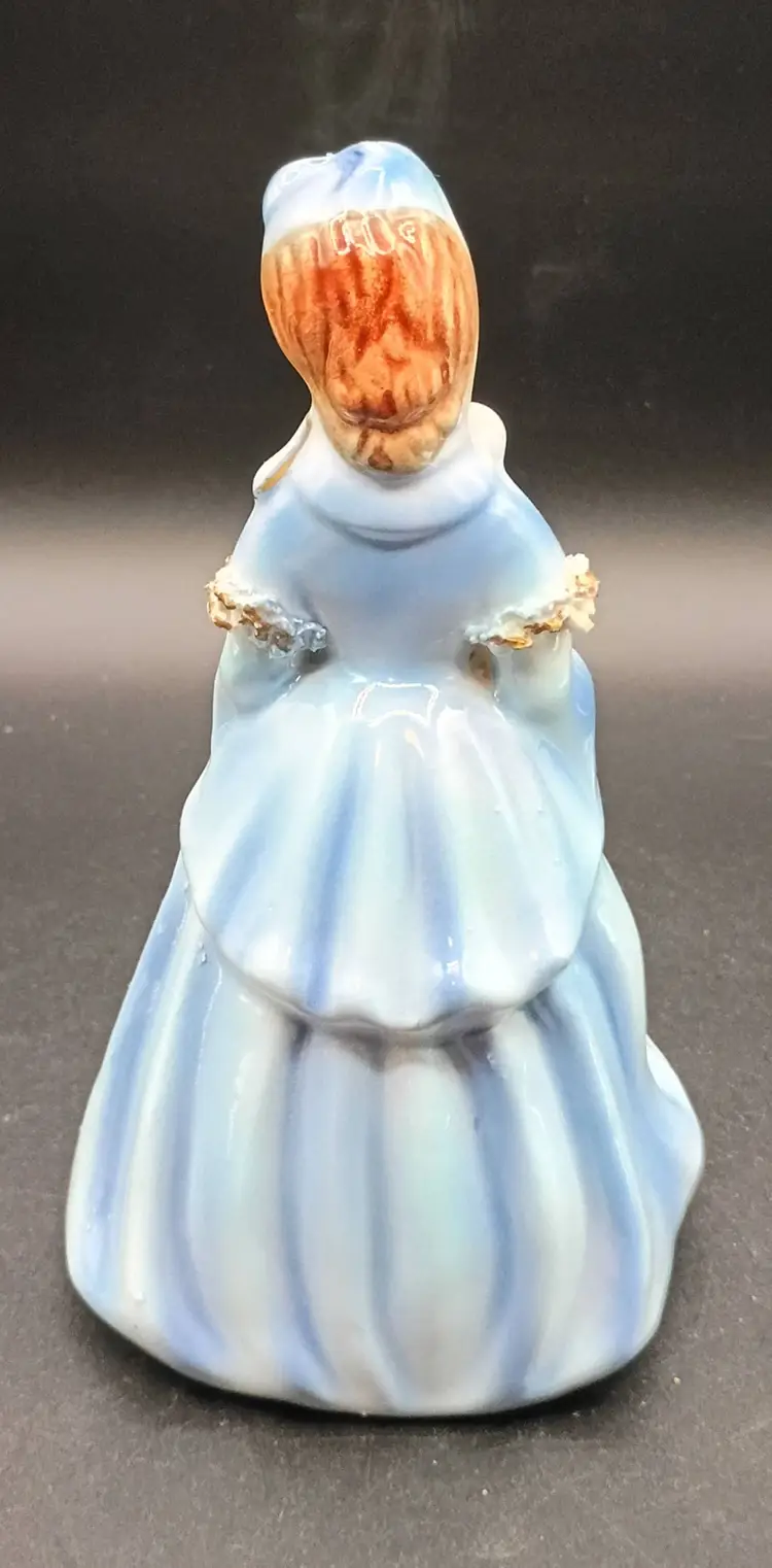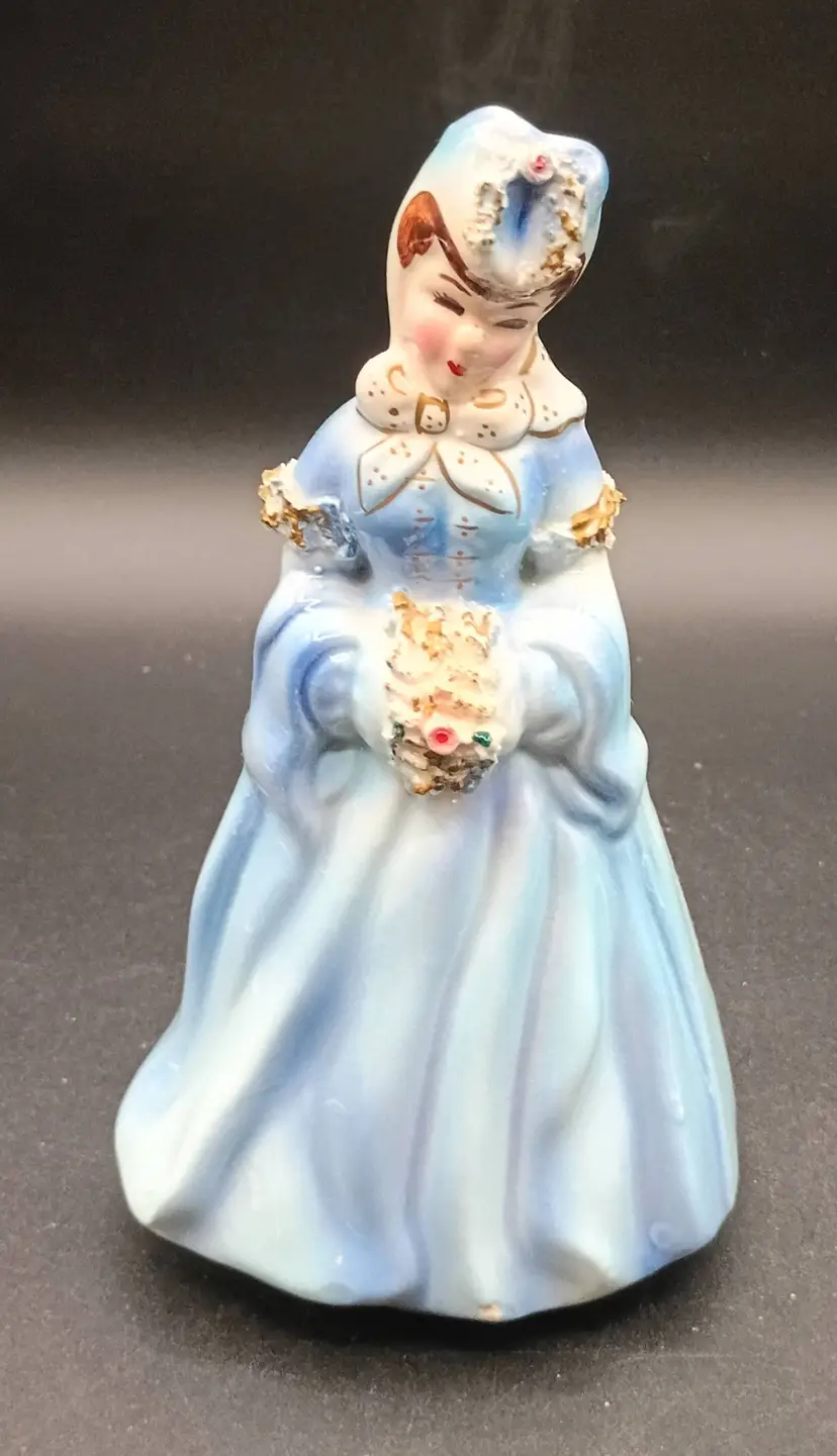 Lovely Lady in Winter Blue coat along with Muff. Her spaghetti trim all appears to be intact with gold trim. She stands 7 inches tall. There is a small chip on the lower front of her dress.