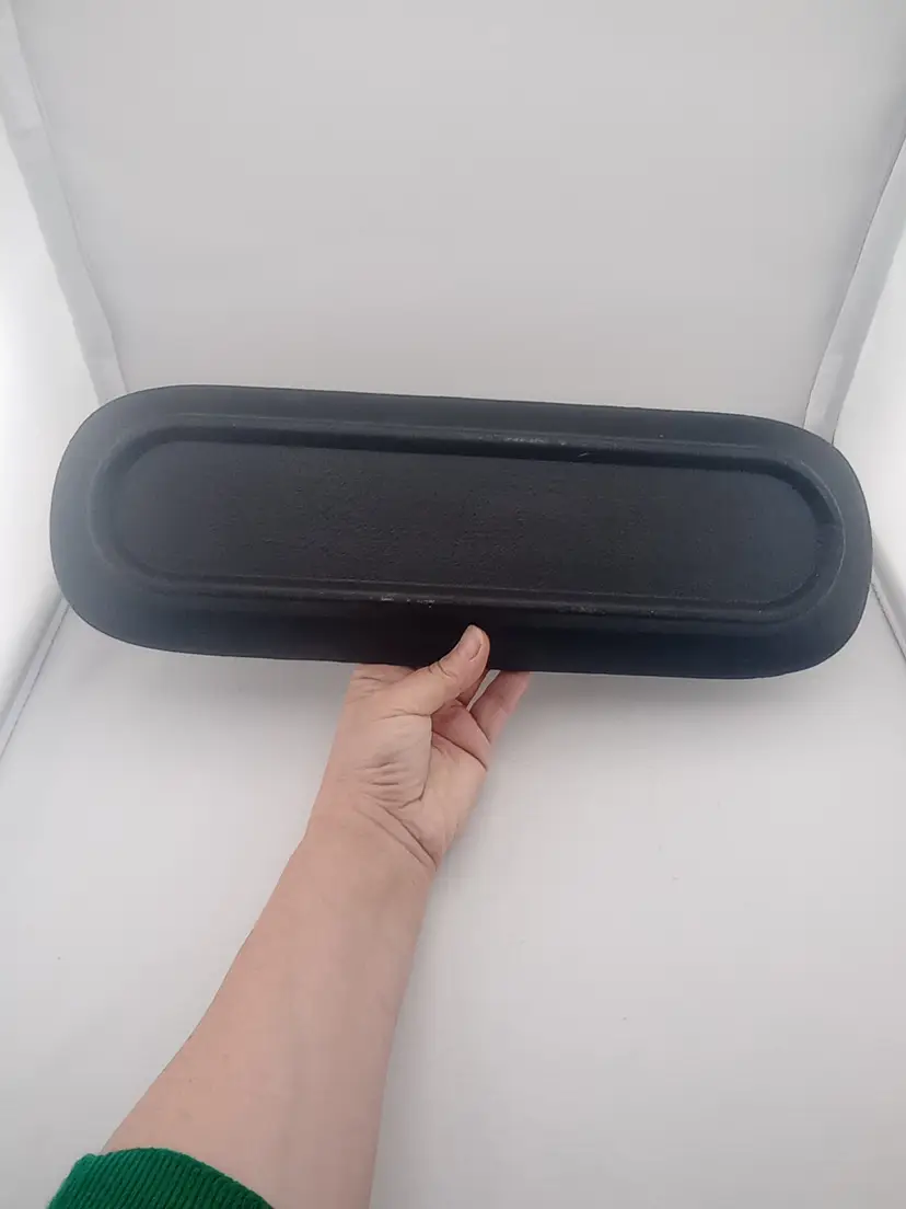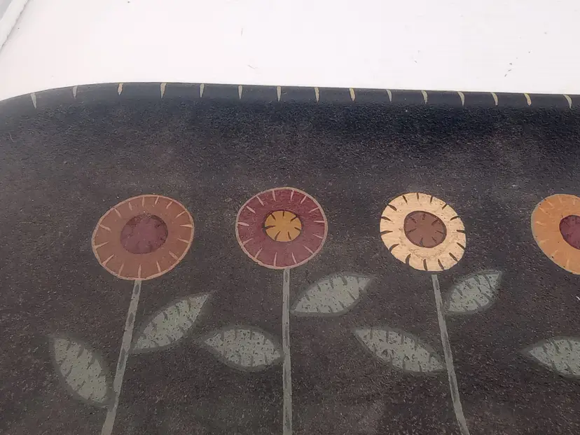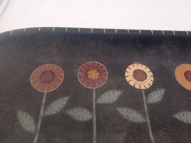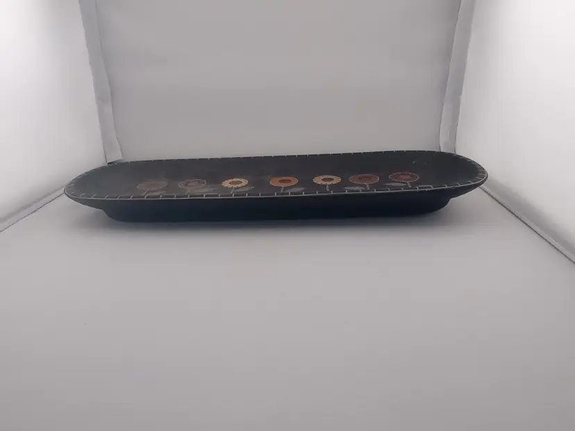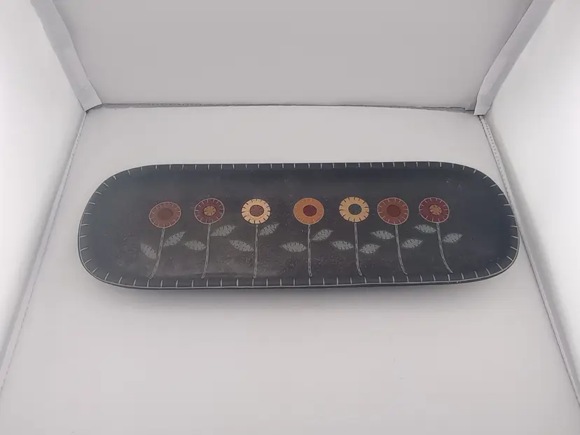 It's a very cool wood? serving tray/platter with handpainted folk style flowers on it. It's in excellent condition with no chips or cracks.