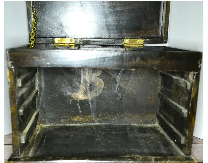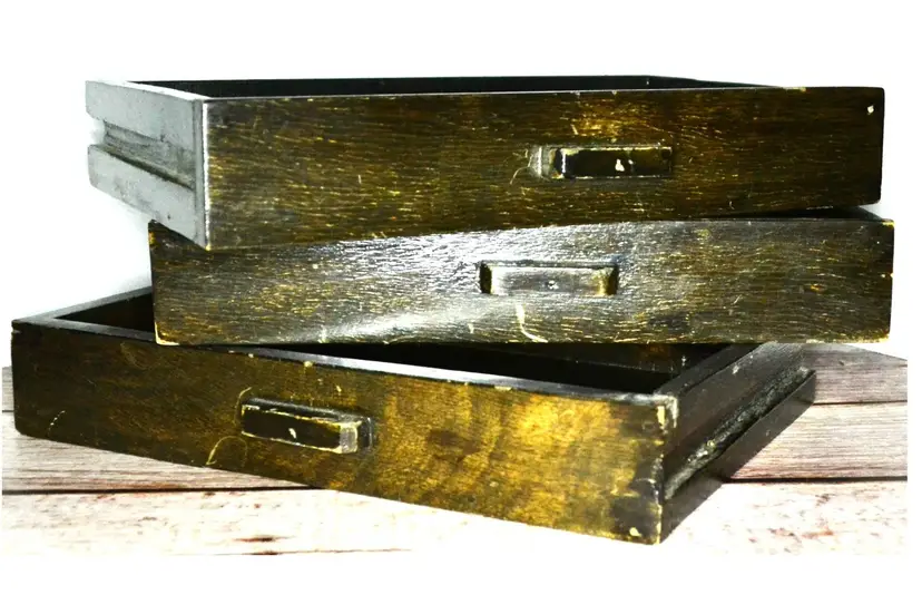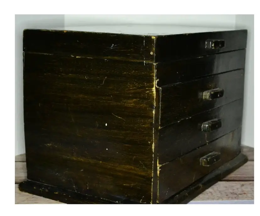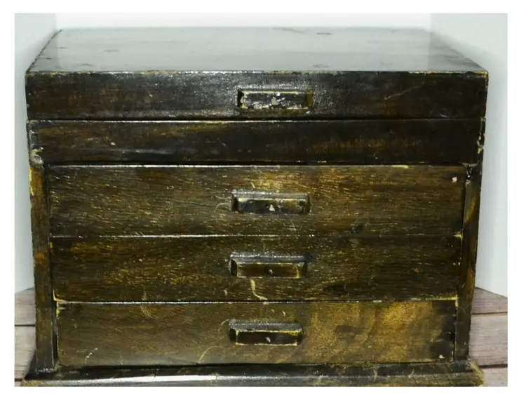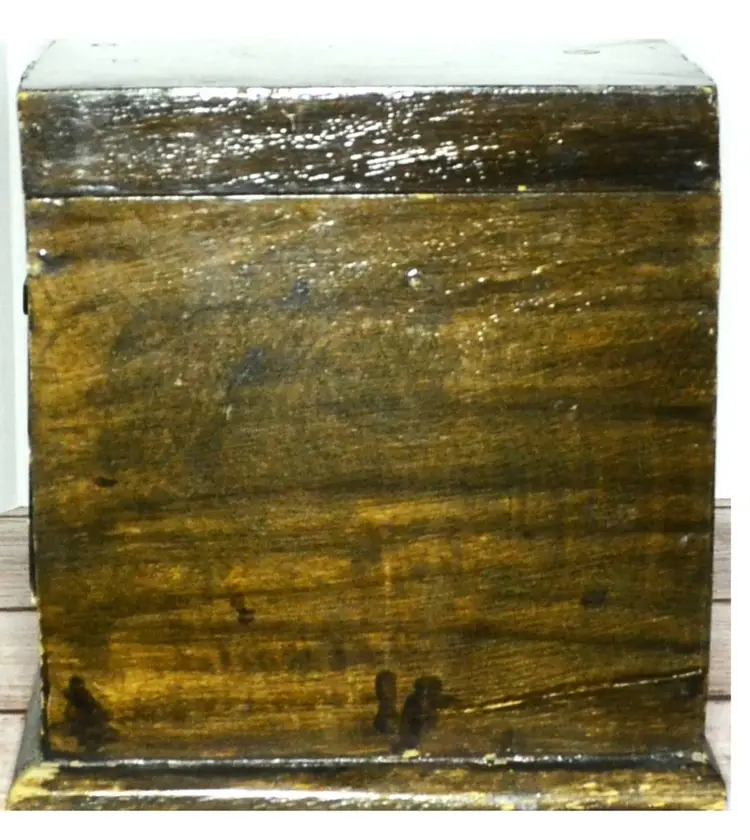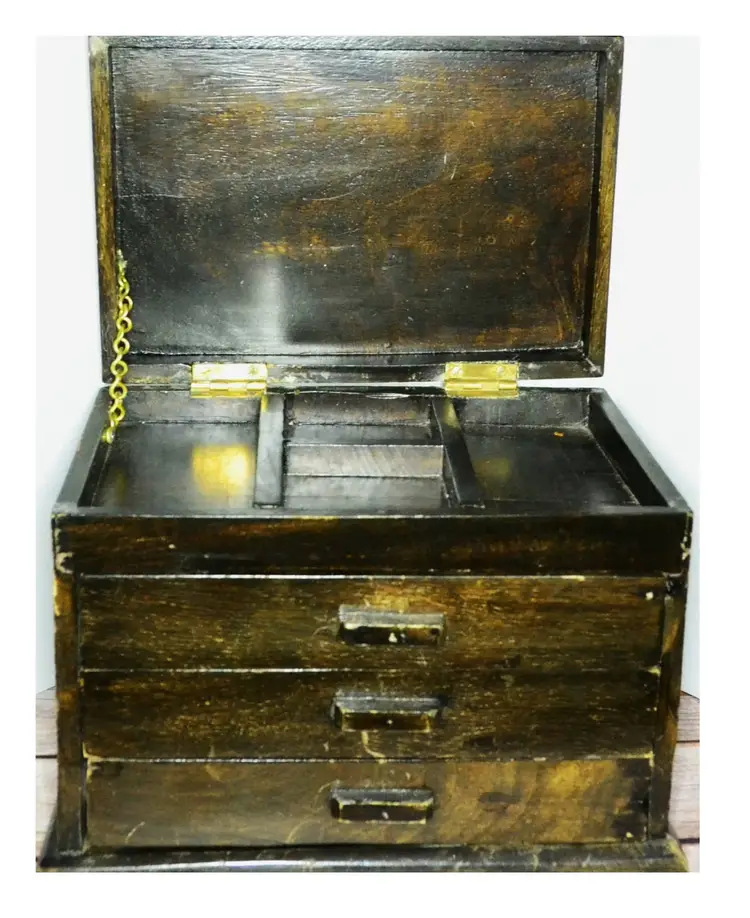 This handcrafted wooden box by Foreside India offers timeless charm and practical design. Featuring a hinged lid with gold-tone chain, divided top compartments, and three smoothly sliding drawers, it’s ideal for organizing jewelry, keepsakes, or desktop tools. The structure is solid and functional, while the finish shows visible wear—scuffs, surface scratches, and aged polish—adding to its rustic, timeworn character. Made in India for the Foreside brand, known for artisan partnerships and globally inspired decor, this piece reflects traditional joinery with no visible fasteners. A perfect accent for boho, farmhouse, or heritage-themed interiors.