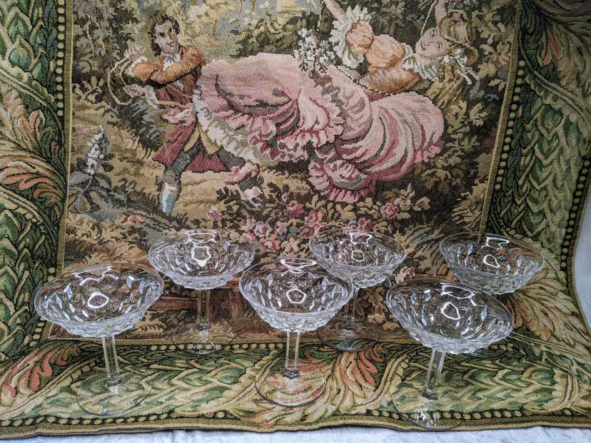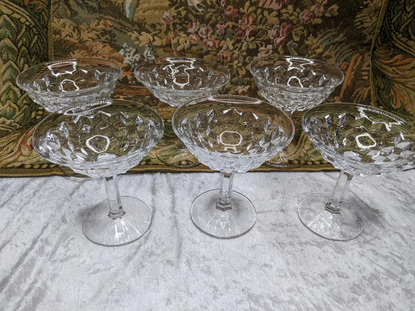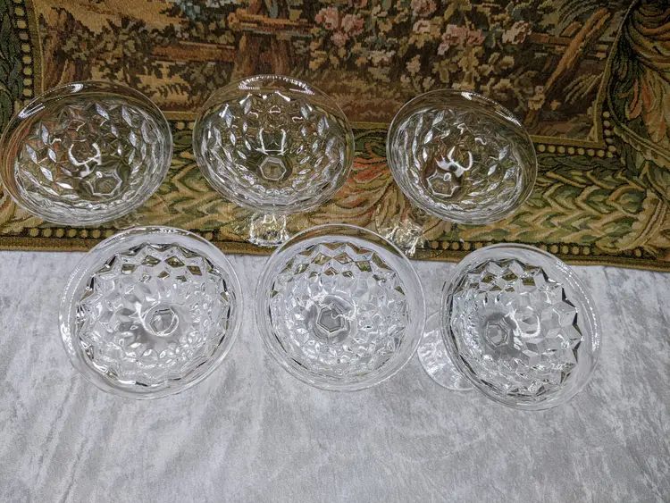 Fostoria American High Sherbet Flared Champagne Glass Set of 6 Cube Style 4 3/8" tall 4in wide Elegant glassware. Perfect for the Holiday Table setting. Perfect for Thanksgiving, Christmas , New Years . Would make a nice gift. Great condition Clean with no damage.no chips or cracks no weird smells. Please check the photos for details. Comes from a smoke free home. We do have pets.