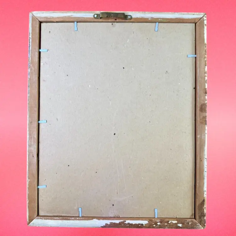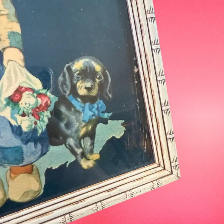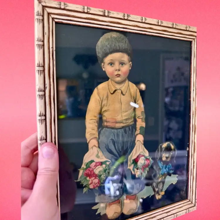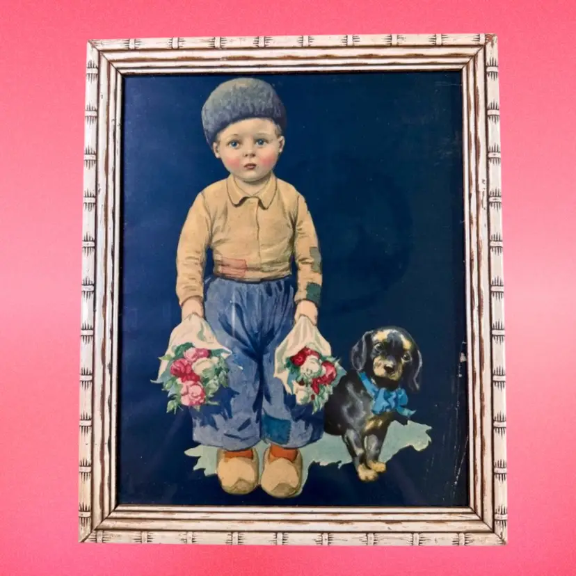 11”x9.25”x0.5”. Framed antique print of a young Dutch boy & dog. Background color is a beautiful deep navy. There is a scrape on the bottom right of the print, see picture. The old frame is really cool! The nails are visible on the corners. Has a hook on back for hanging.