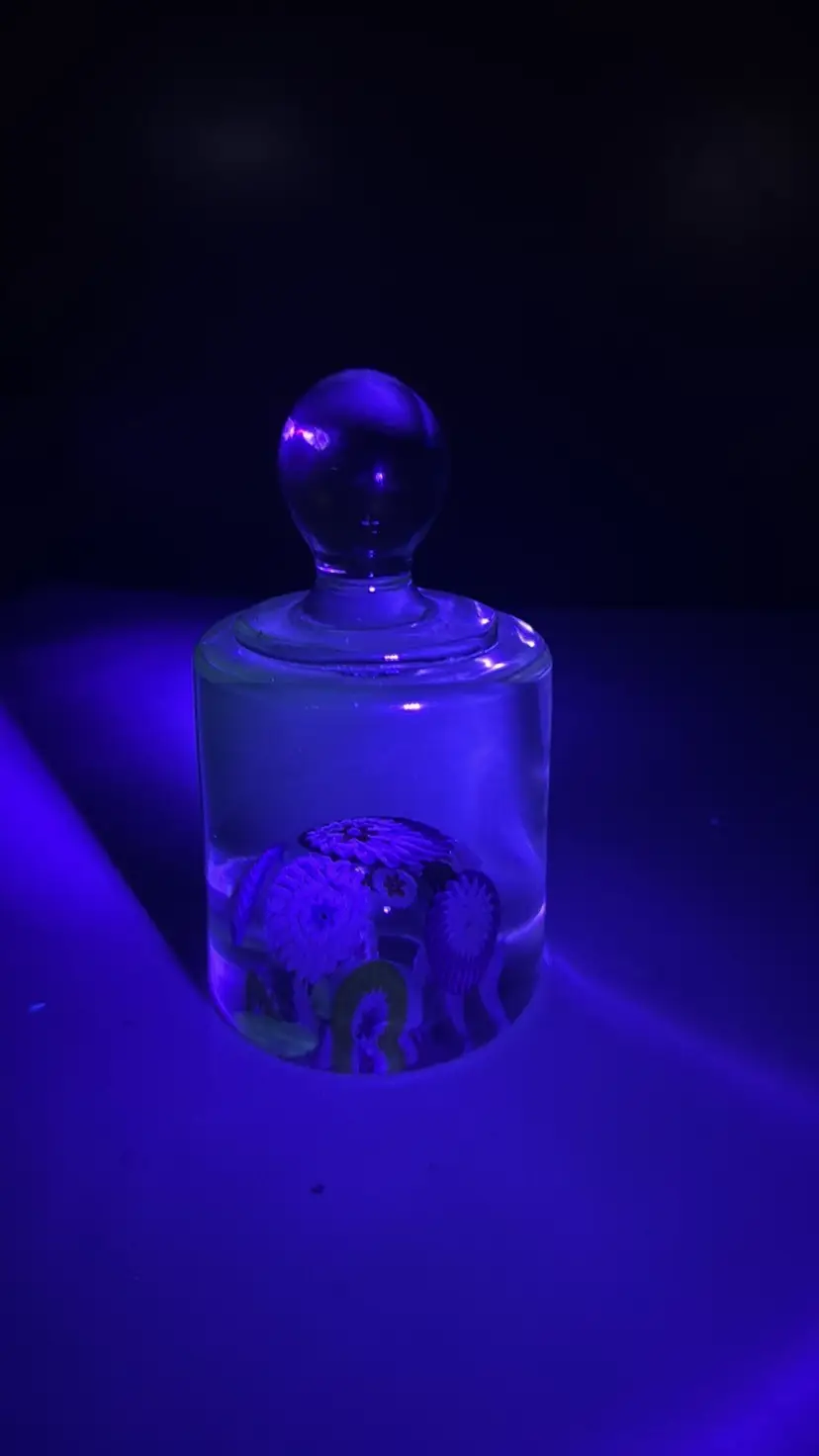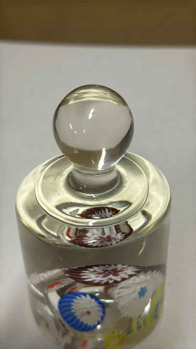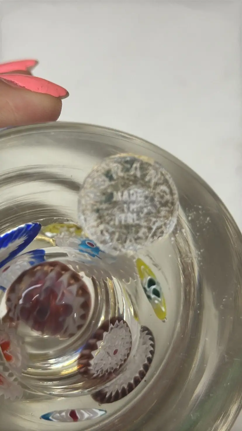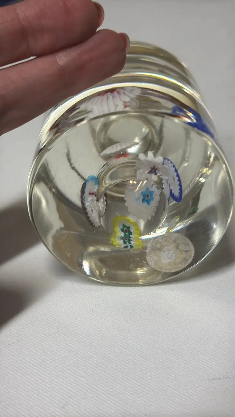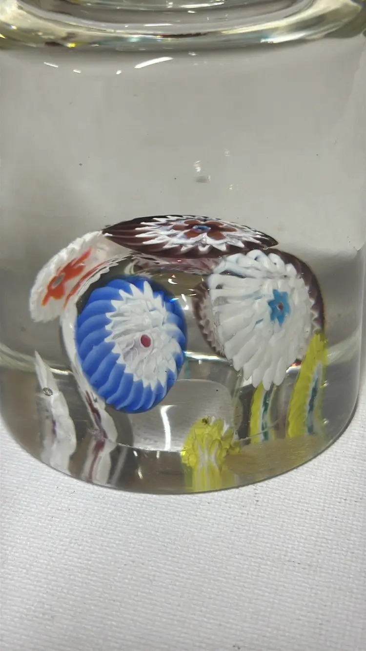 Fratelli Toso Murano Art Glass Millefiori Knob Top Paperweight It does have a uranium glow under black light that is hard to capture in a photo 5” tall 2.75” diameter Original sticker Excellent condition with no breaks chips or bruises mouth-blown and hand-shaped cylinder paperweight, likely made in the 1970s on the island of Murano in Venice, Italy. The paperweight features scattered millefiori, which are cut glass canes resembling flowers, submerged in clear glass, creating an illusion of depth and magnification. It has a distinctive knob handle at the top. Fratelli Toso is a renowned and enduring family-run factory on Murano, famous for their use of the millefiori technique. Enhance your home decor with this elegant glass art paperweight. Featuring vibrant blue, red, yellow and white accents, this piece adds a touch of sophistication to any space. Perfect for art enthusiasts and collectors. (822726256)