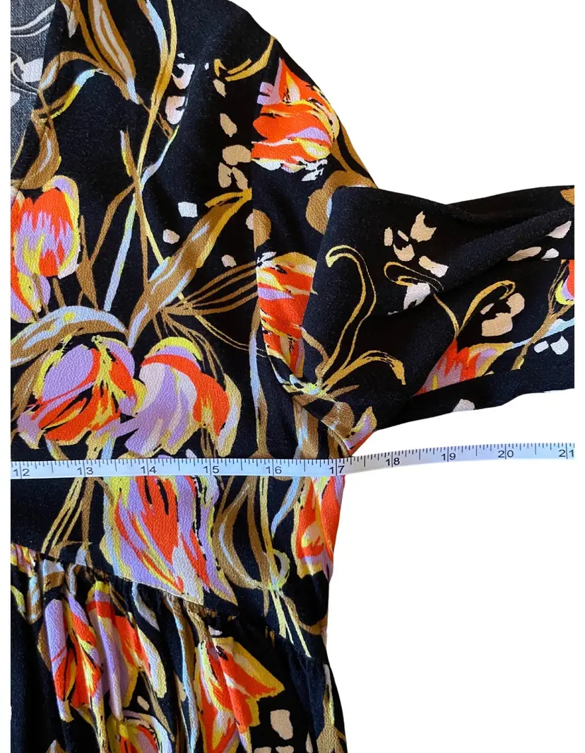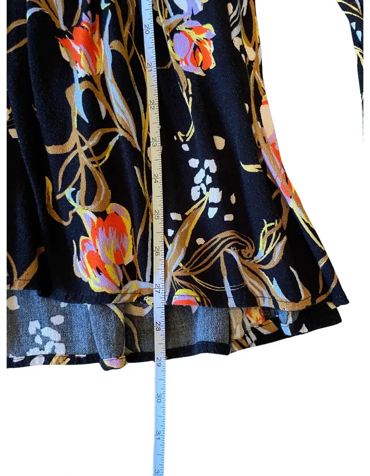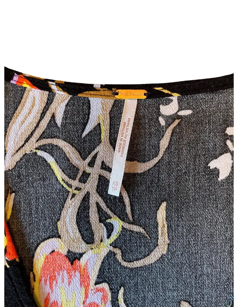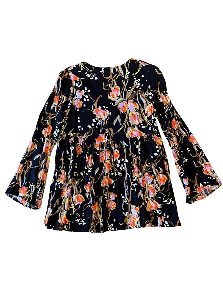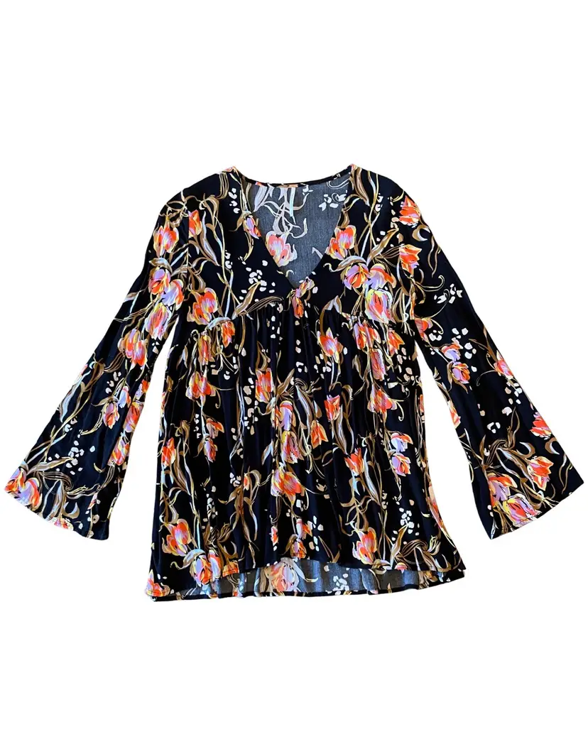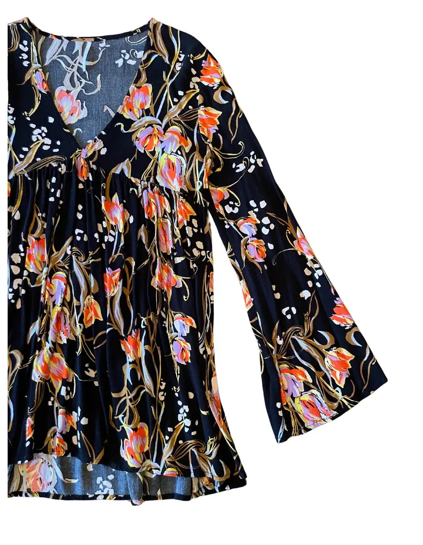 Free People Size XS (fits oversized) 100% Rayon (material tag removed) Feminine Silhouette Bell Sleeves Tunic length Floral print