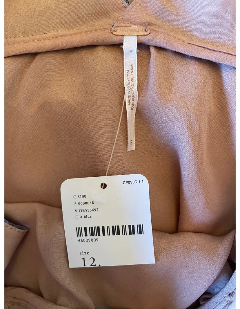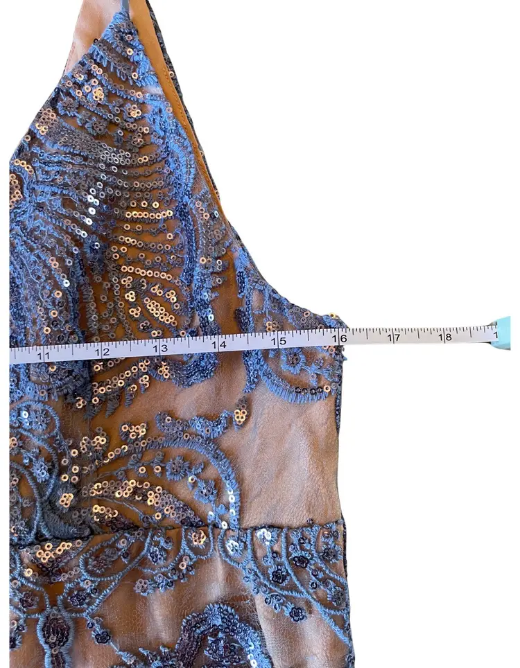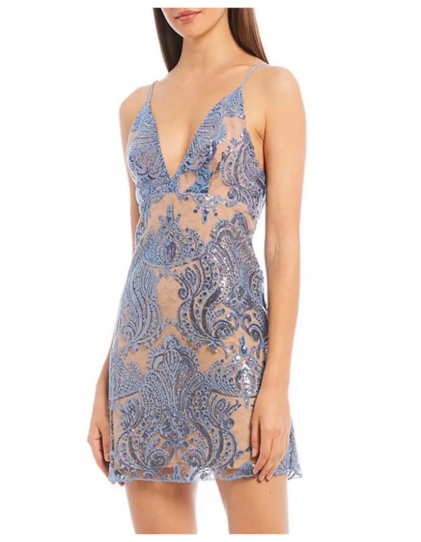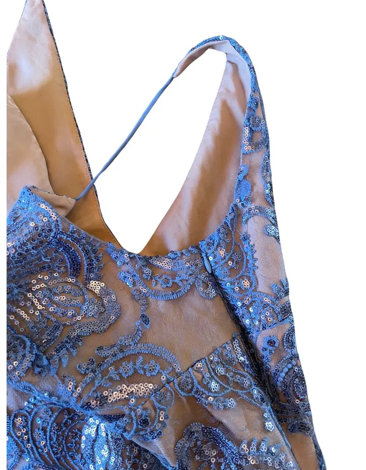 Free People Size 12 Color: It Blue Embroidery and embellishment throughout Lined Plunging front and back neckline 88% Polyester, 12% Nylon Side zipper closure Spaghetti straps (not adjustable)